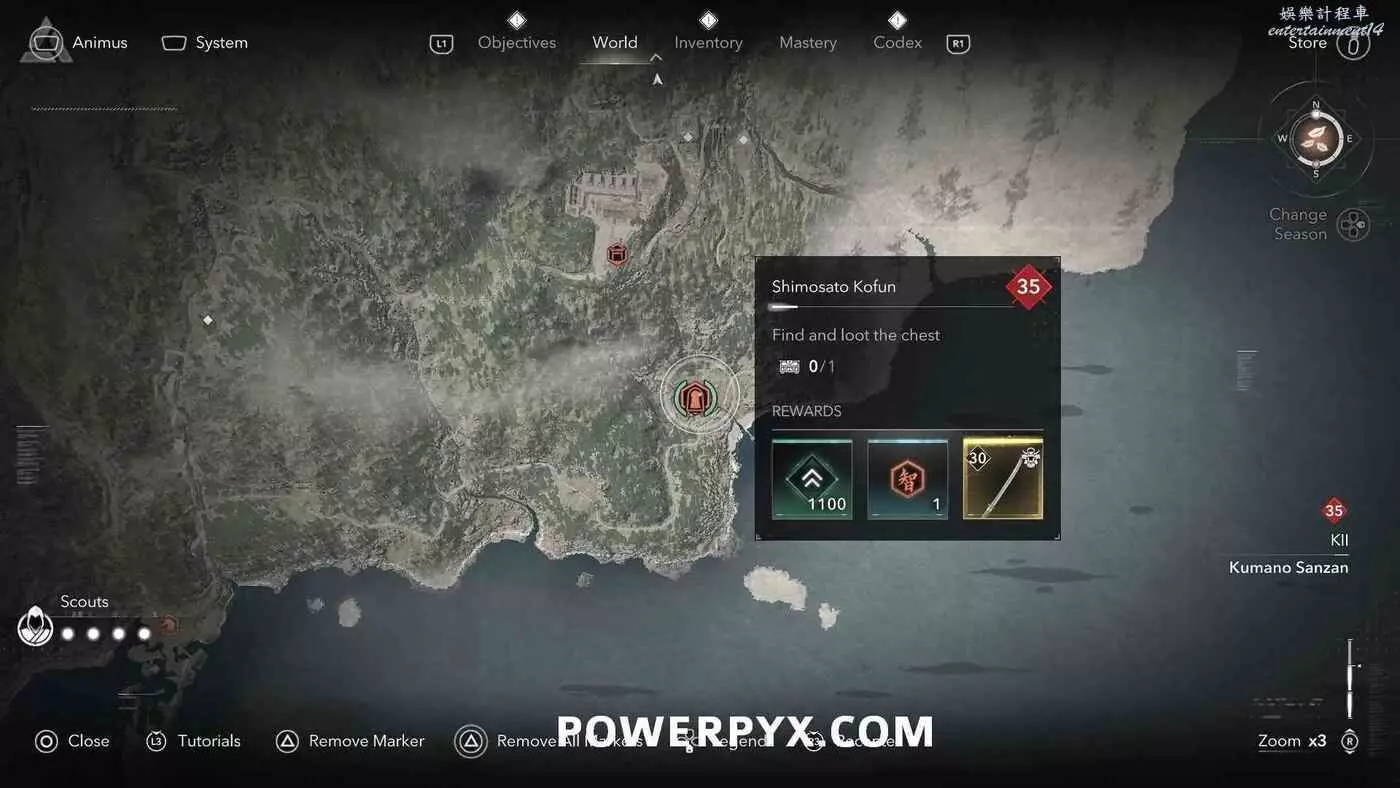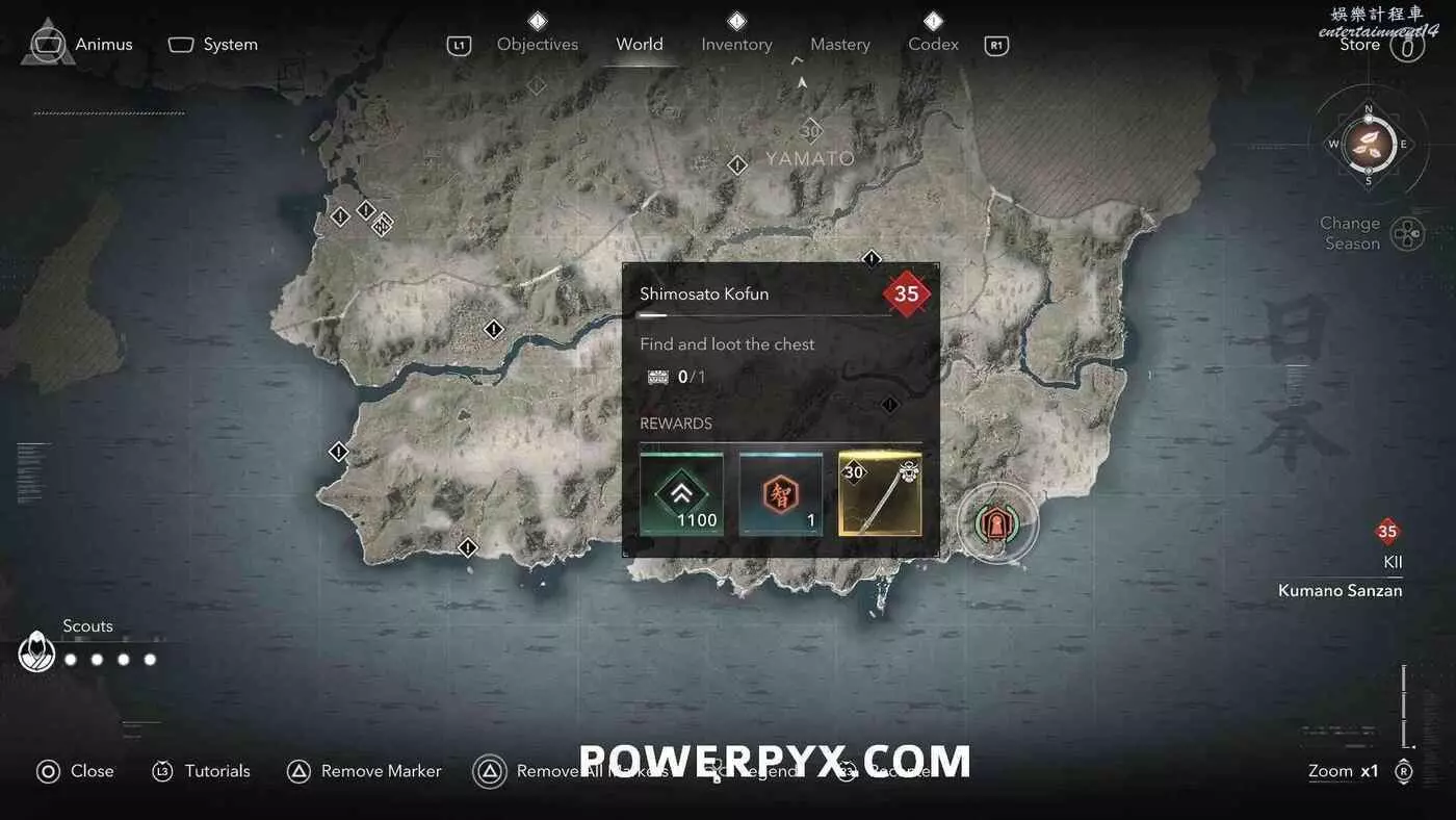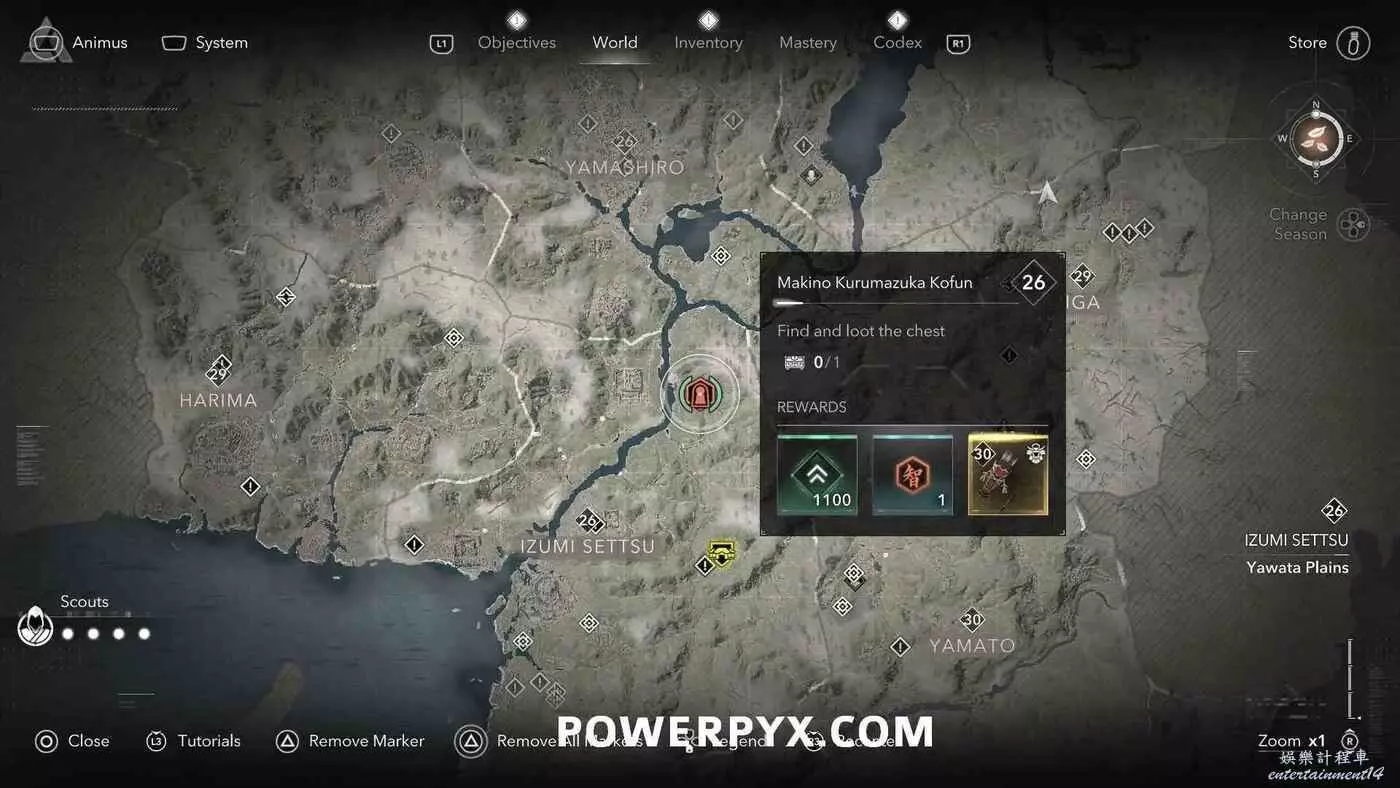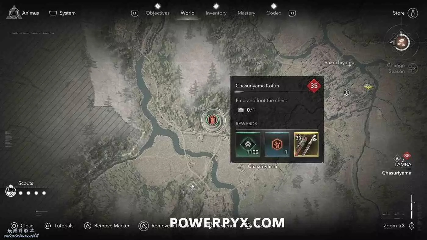 古墳在地圖上會以白色問號標記顯示,靠近時就會變成橙色的古墳圖示。古墳類似於一個小地牢,在盡頭可以找到一個傳奇寶箱,完成後可以獲得知識點、經驗值或傳奇裝備(具體獎勵內容受角色當前等級影響)。其中部分古墳只能在扮演奈緒江或彌助時才能攻略(彌助需要完成主線第一章之後才能解鎖),可以在物品欄按住【□鍵/X鍵】來切換角色。還有一些古墳需要使用抓鉤,也就是需要扮演奈緒江才能完成,可以通過在地圖上查看古墳的詳細說明來確定所需角色(傳奇道具上會顯示奈緒江的兜帽或彌助的頭盔)。如果卡關也可以考慮切換角色來繼續攻略。