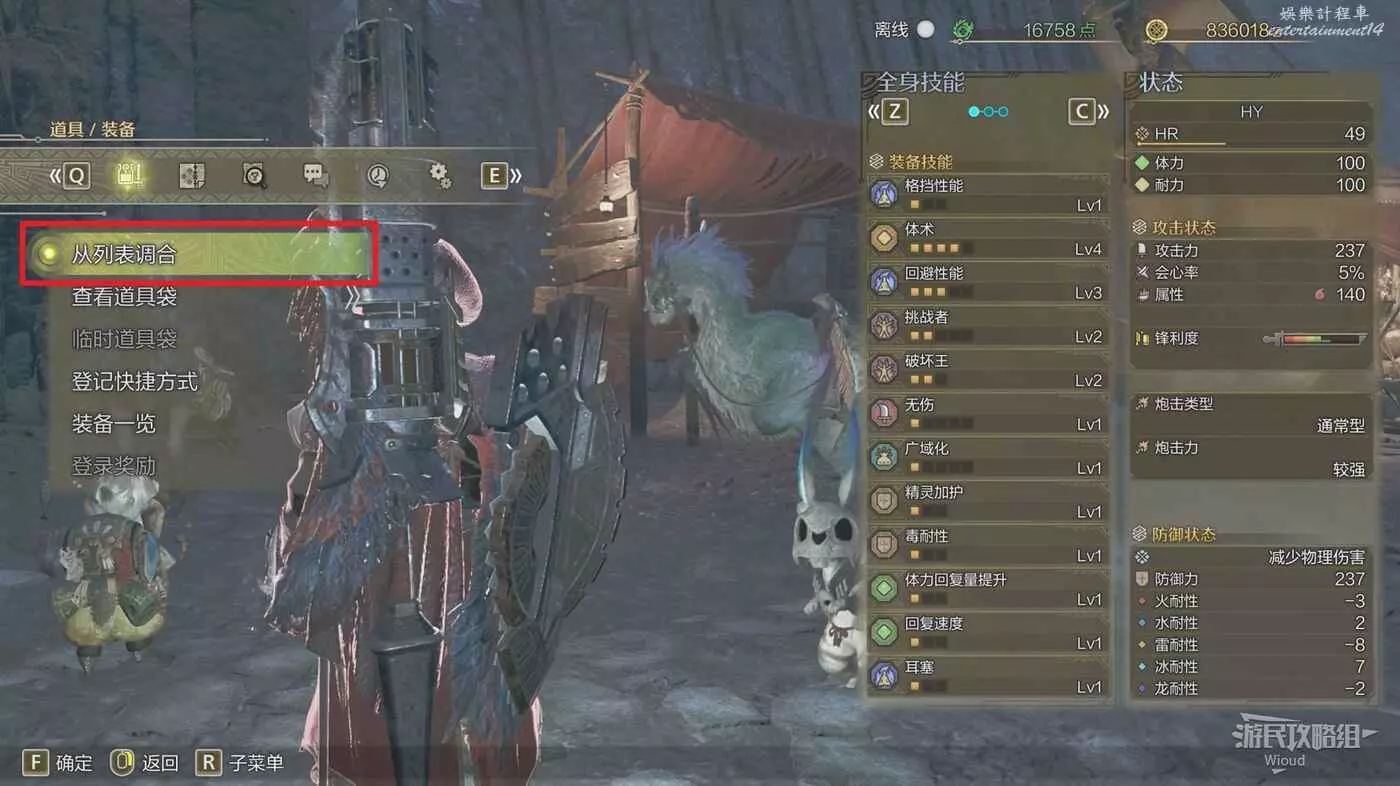 主頁面打開設置功能表,第一頁【道具/裝備】選擇【從列表調和】即可通過收集而來的素材調和大量道具。
