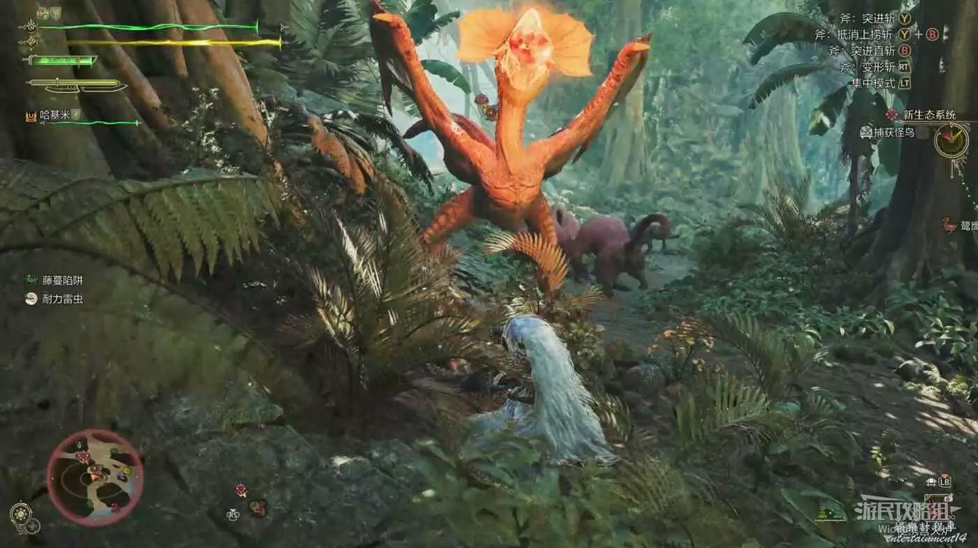 當怪鳥殘血時,它會再次轉到任務剛開始的高台處,因此這也是判斷是否到達捕獲階段的標準,當然還是需要查看怪鳥最後一次轉區時的行動狀態,先放著一個捕獲用麻醉陷阱將其困住。
