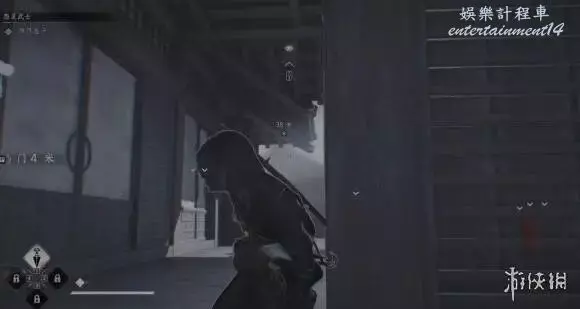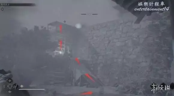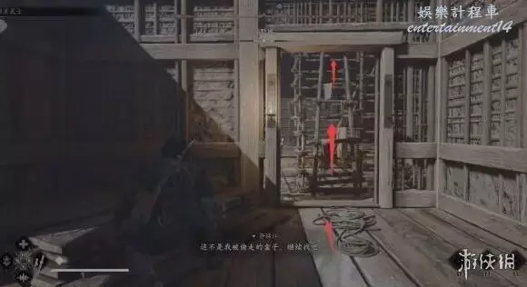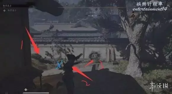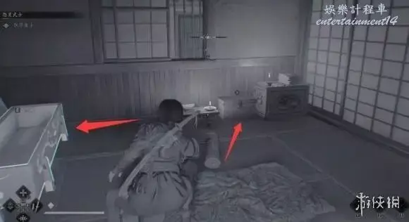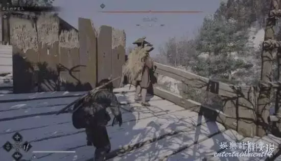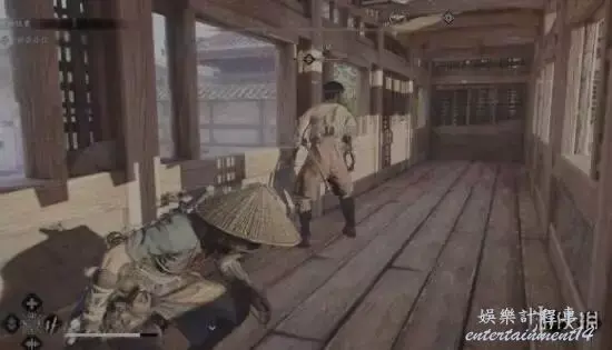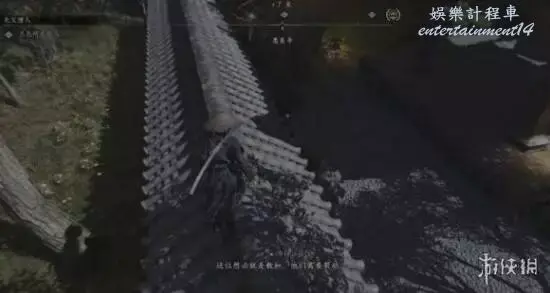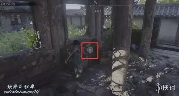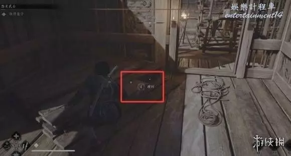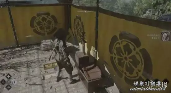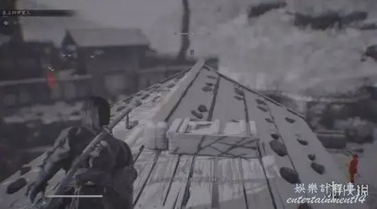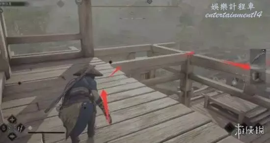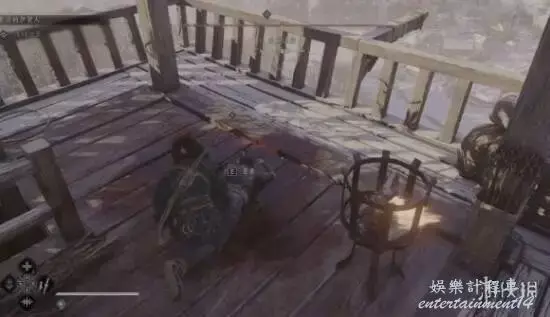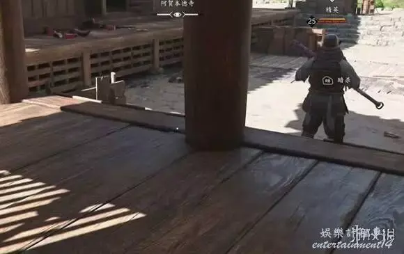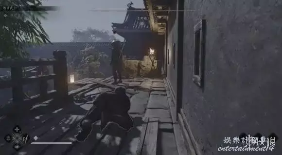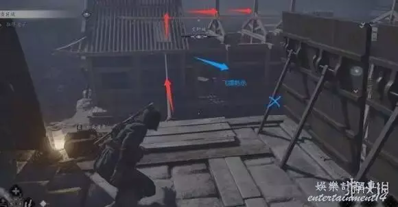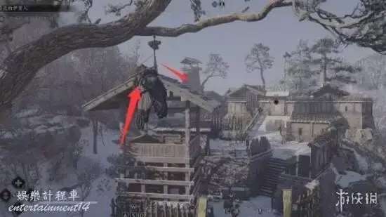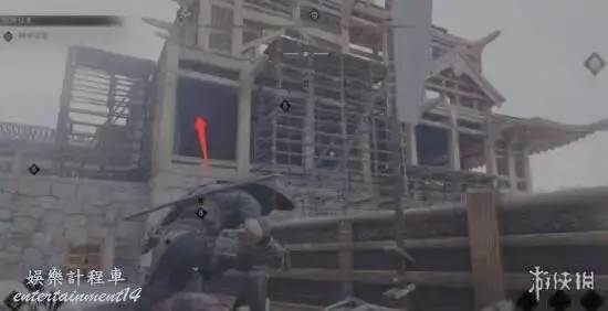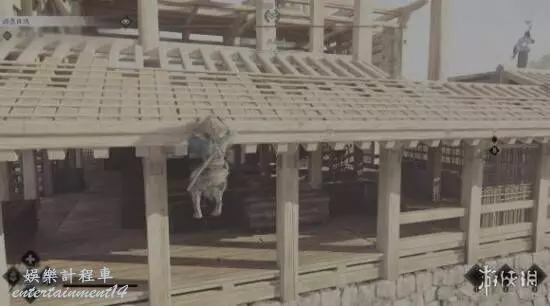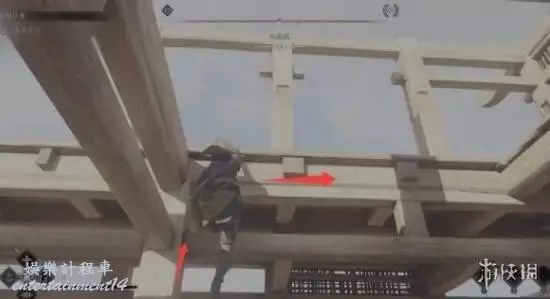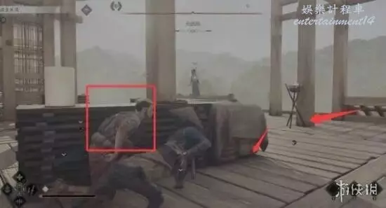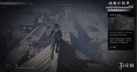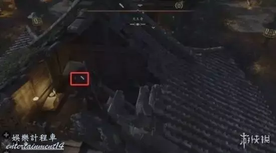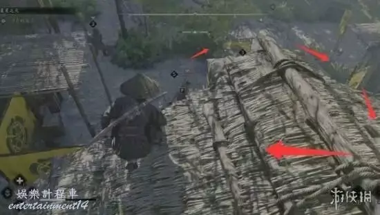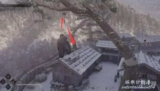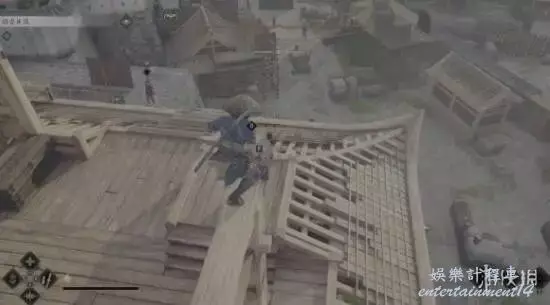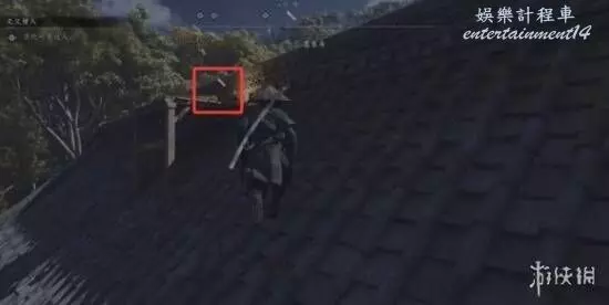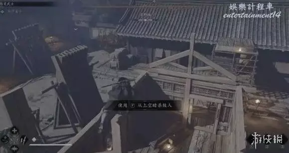 繼續往上到上一個平台,順著房梁走到若狹上方的房梁邊緣,找准角度,按F方可將其暗殺。