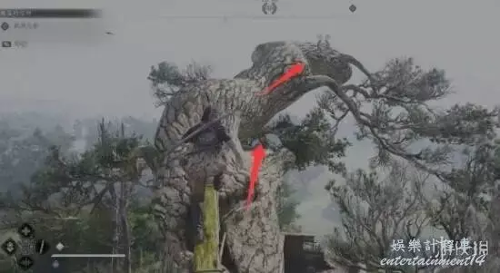 就從這枯樹幹為起點,利用上方枝頭的鉤索蕩到對面去,順著地上的黃色油漆走,就能找到。