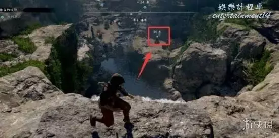 靈活應用鉤索,一直往前走就行。寶箱就在被一刀劈開的石頭前面,旁邊還插著黃色的旗幟。