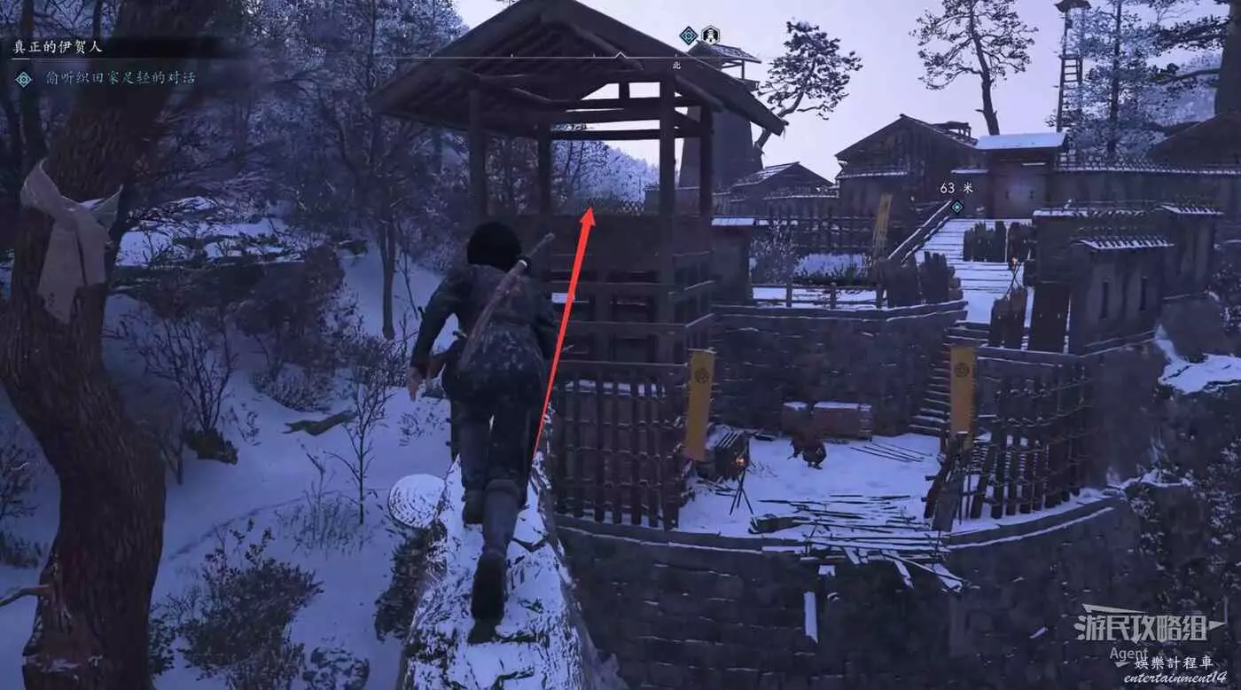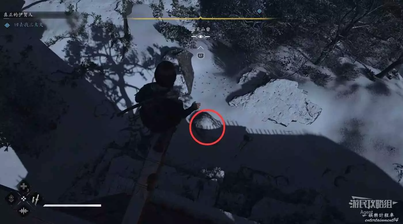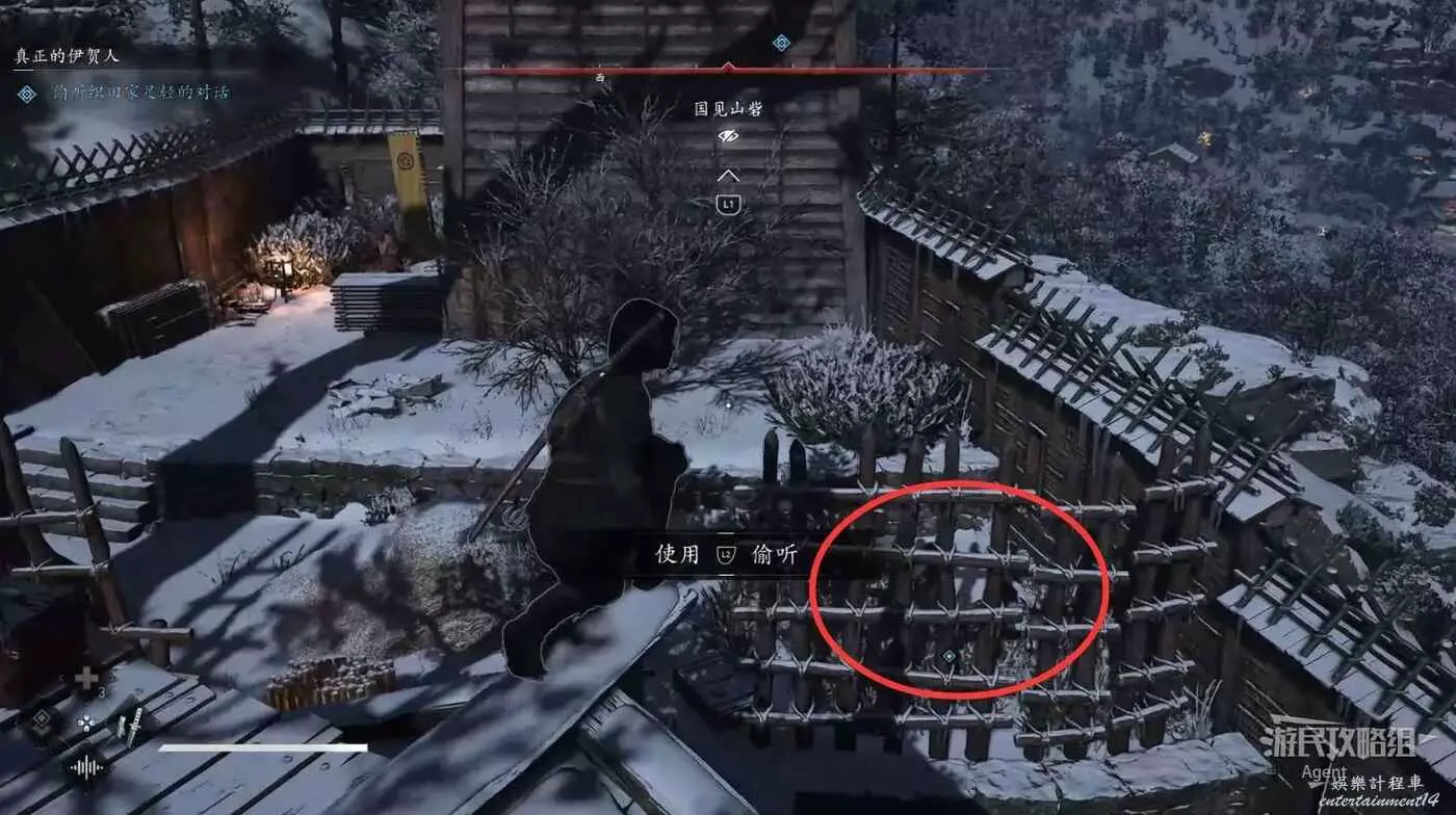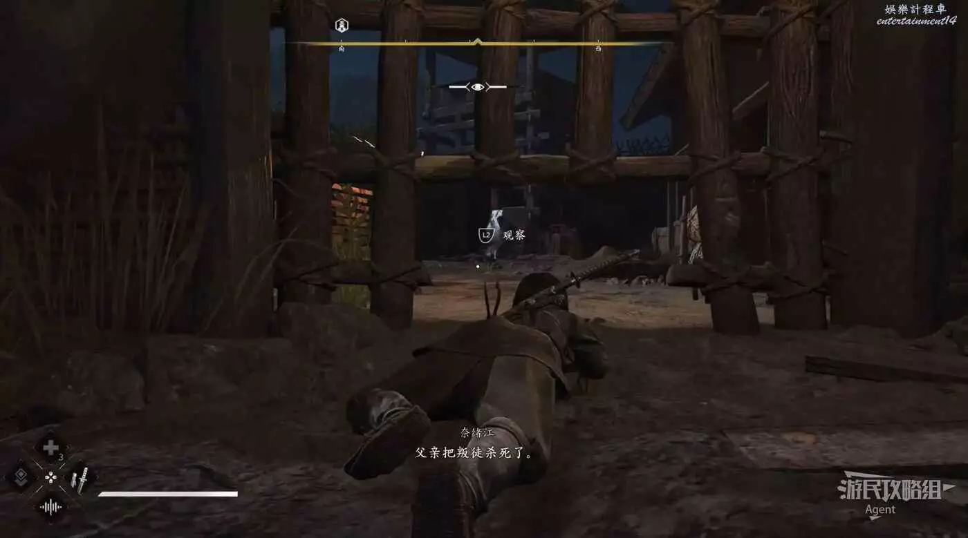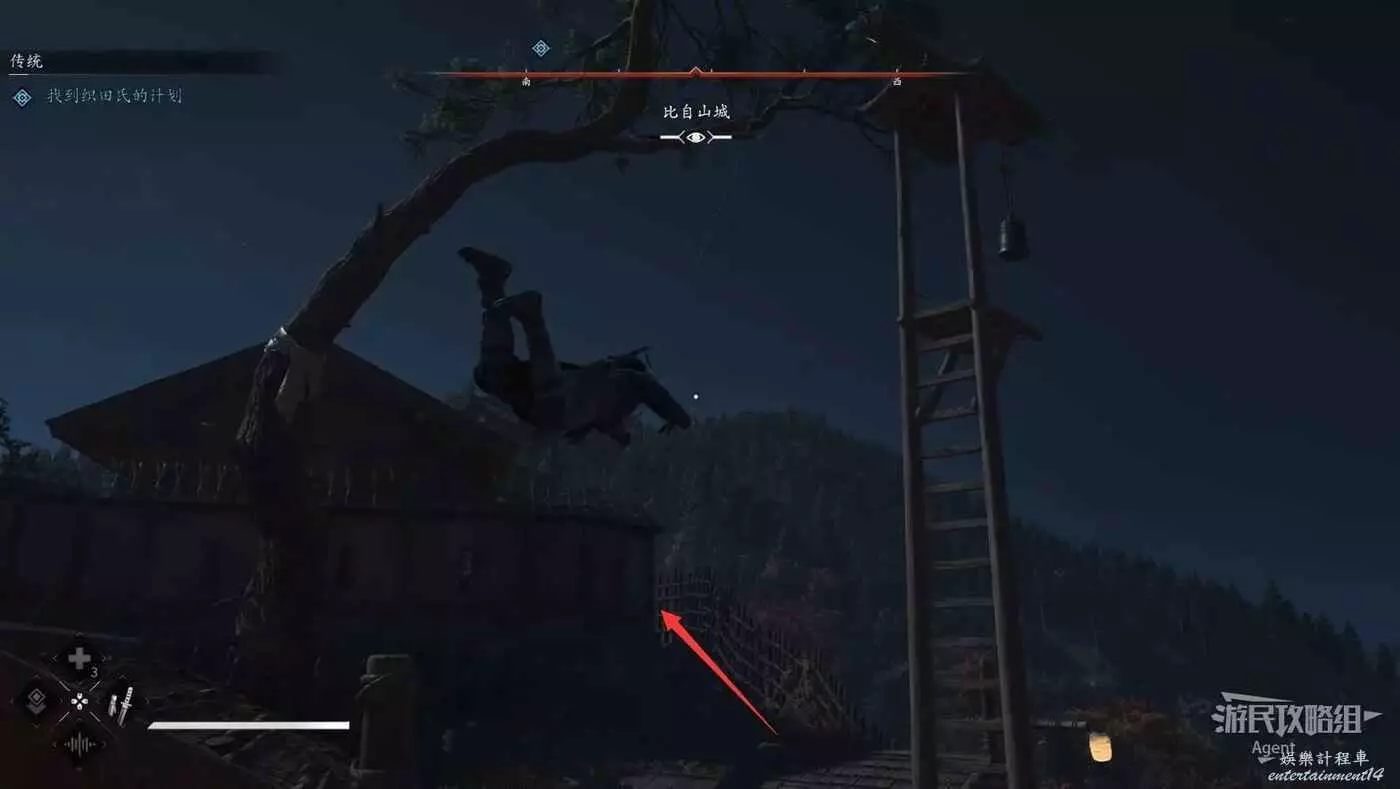 和三太夫對話後,走上樹枝,用鉤繩潛入營地。注意你現在是在回憶中,還沒有袖劍,所以無法刺殺敵人。