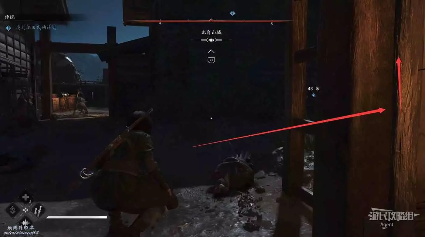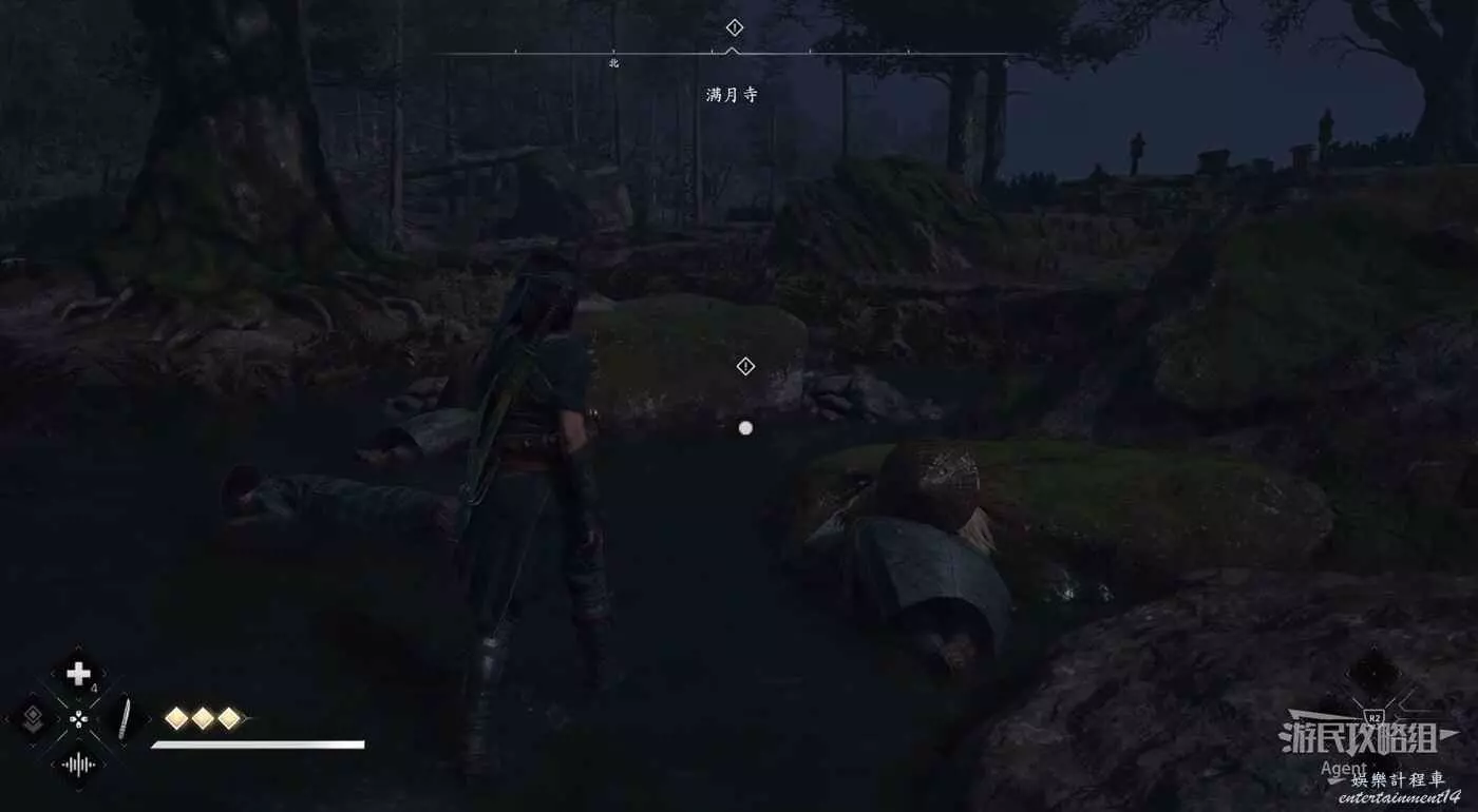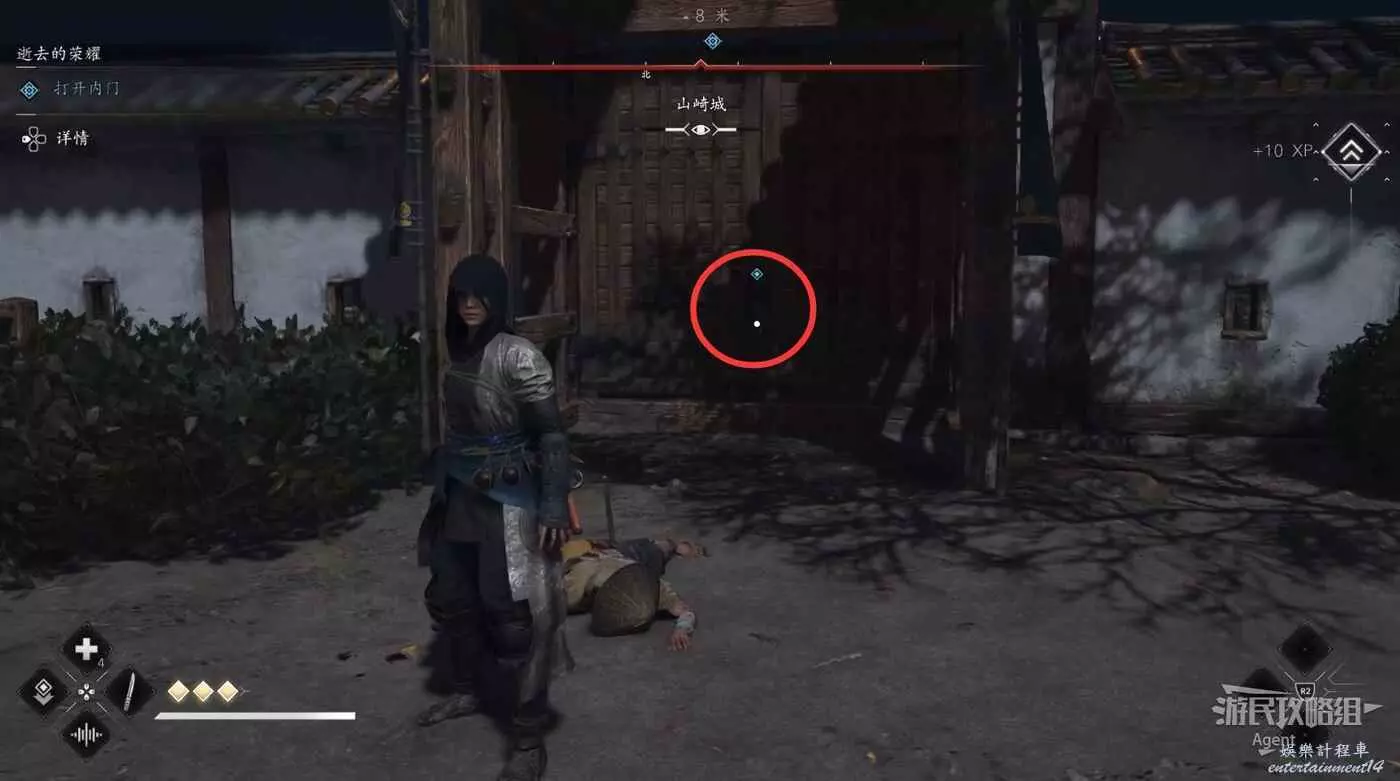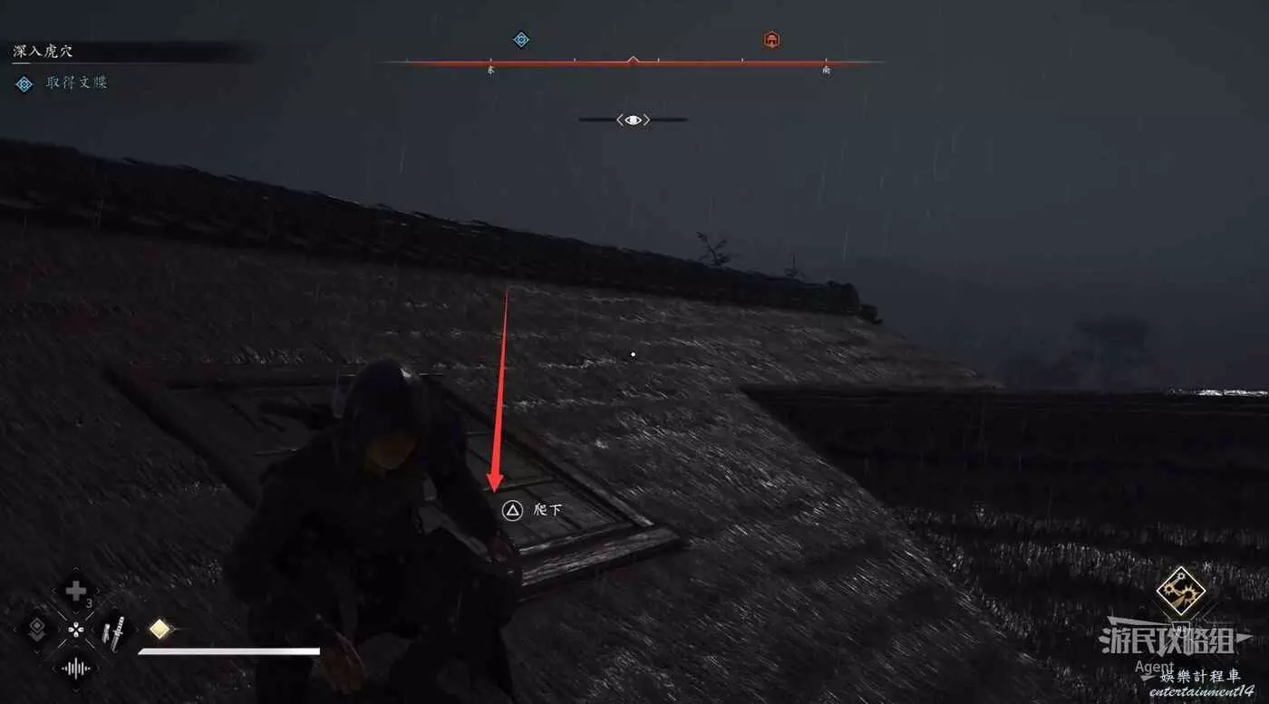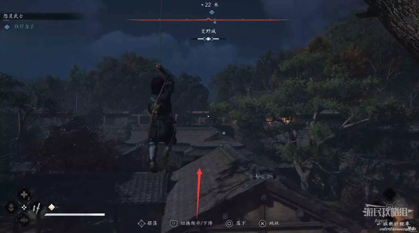 和三太夫對話後,走上樹枝,用鉤繩潛入營地。注意你現在是在回憶中,還沒有袖劍,所以無法刺殺敵人。