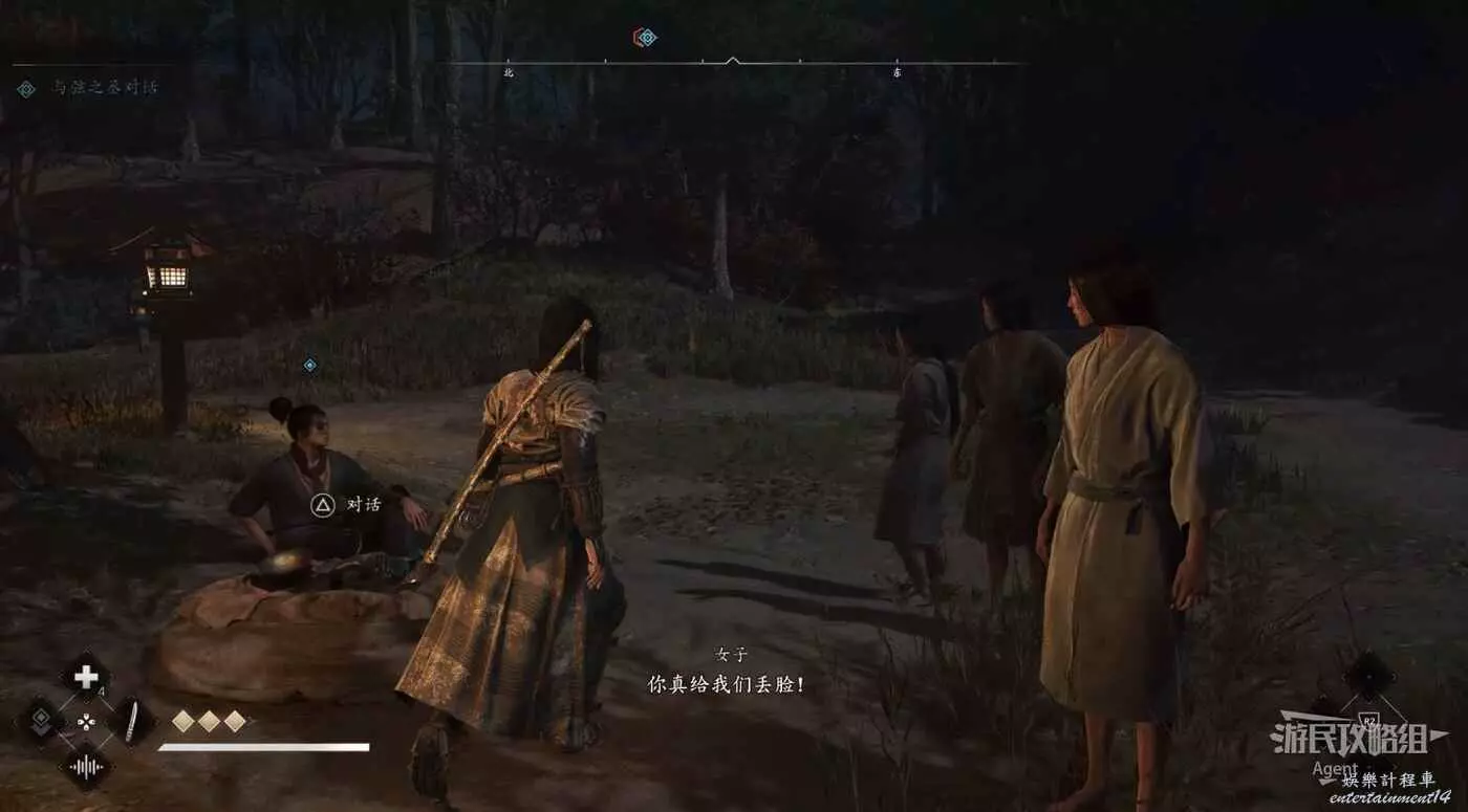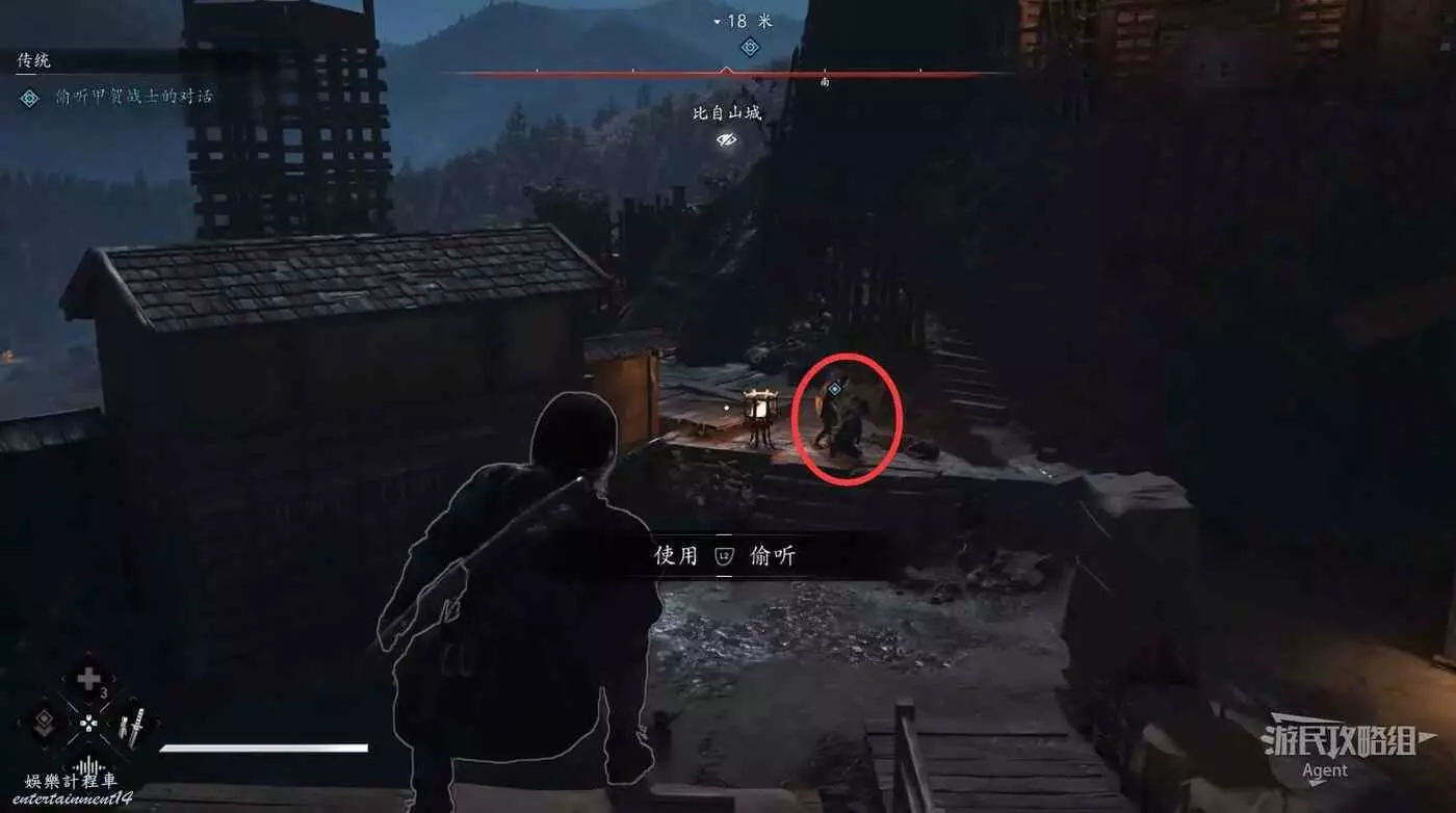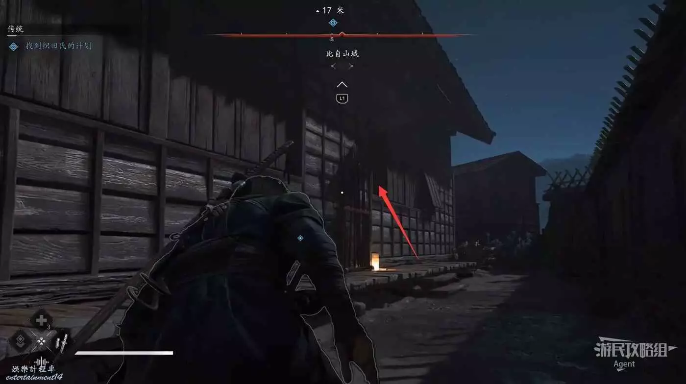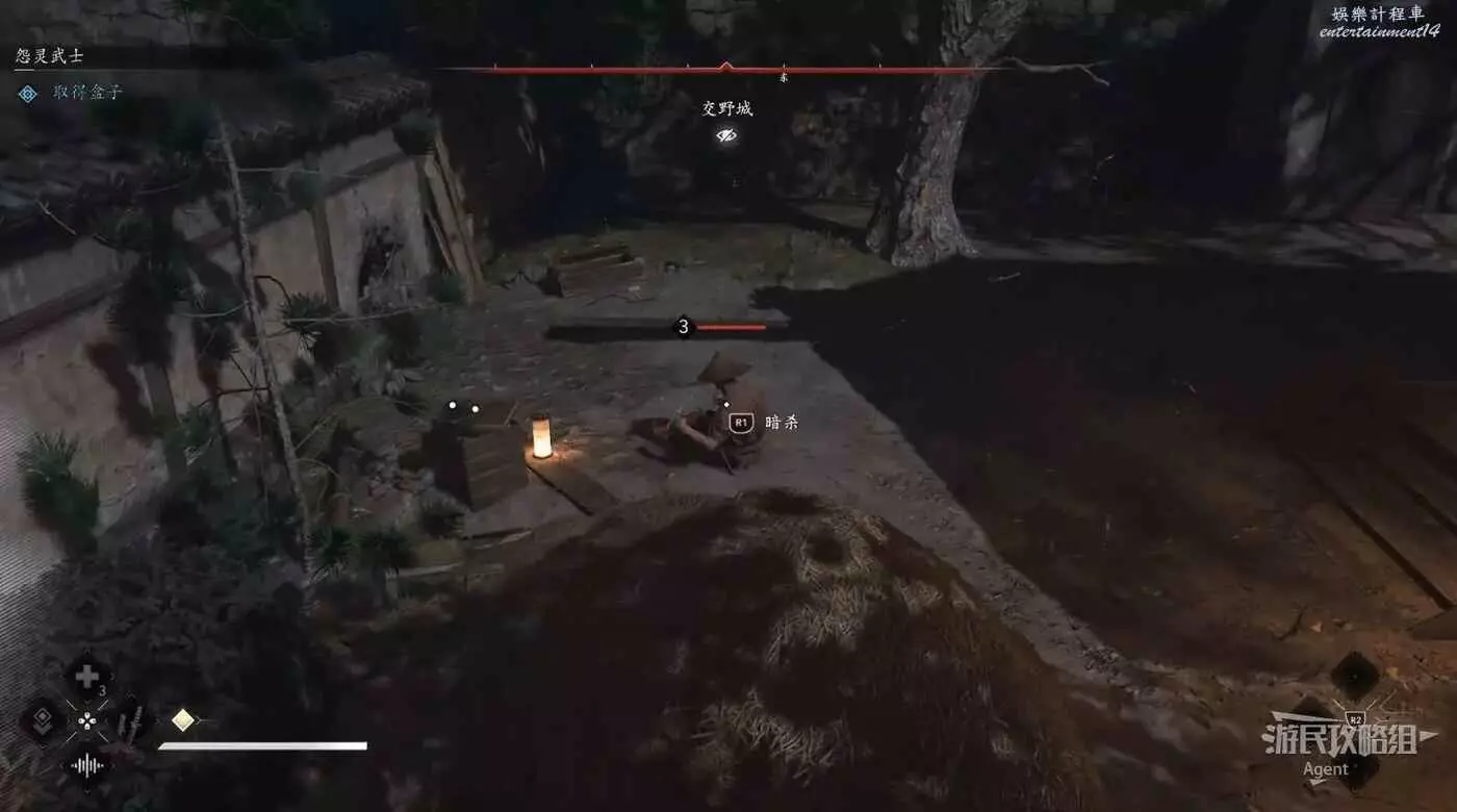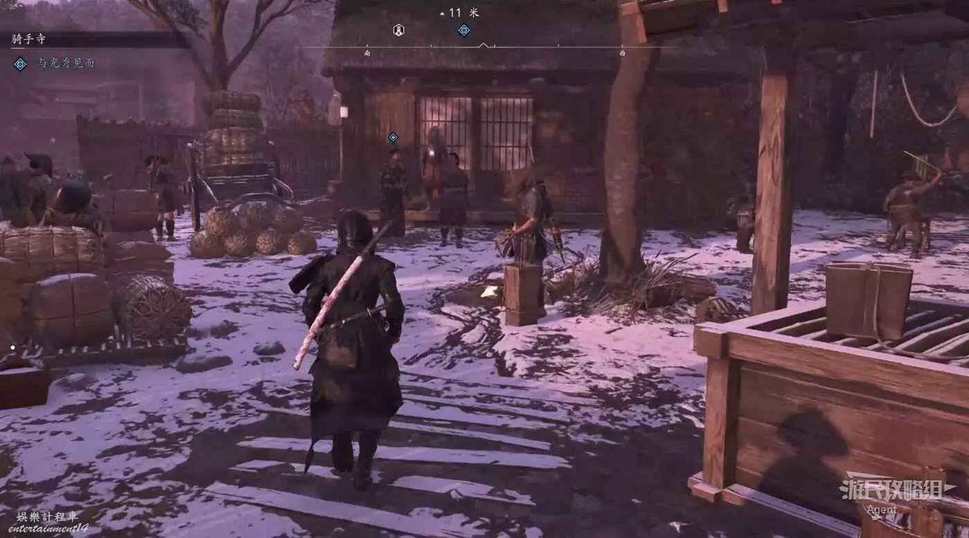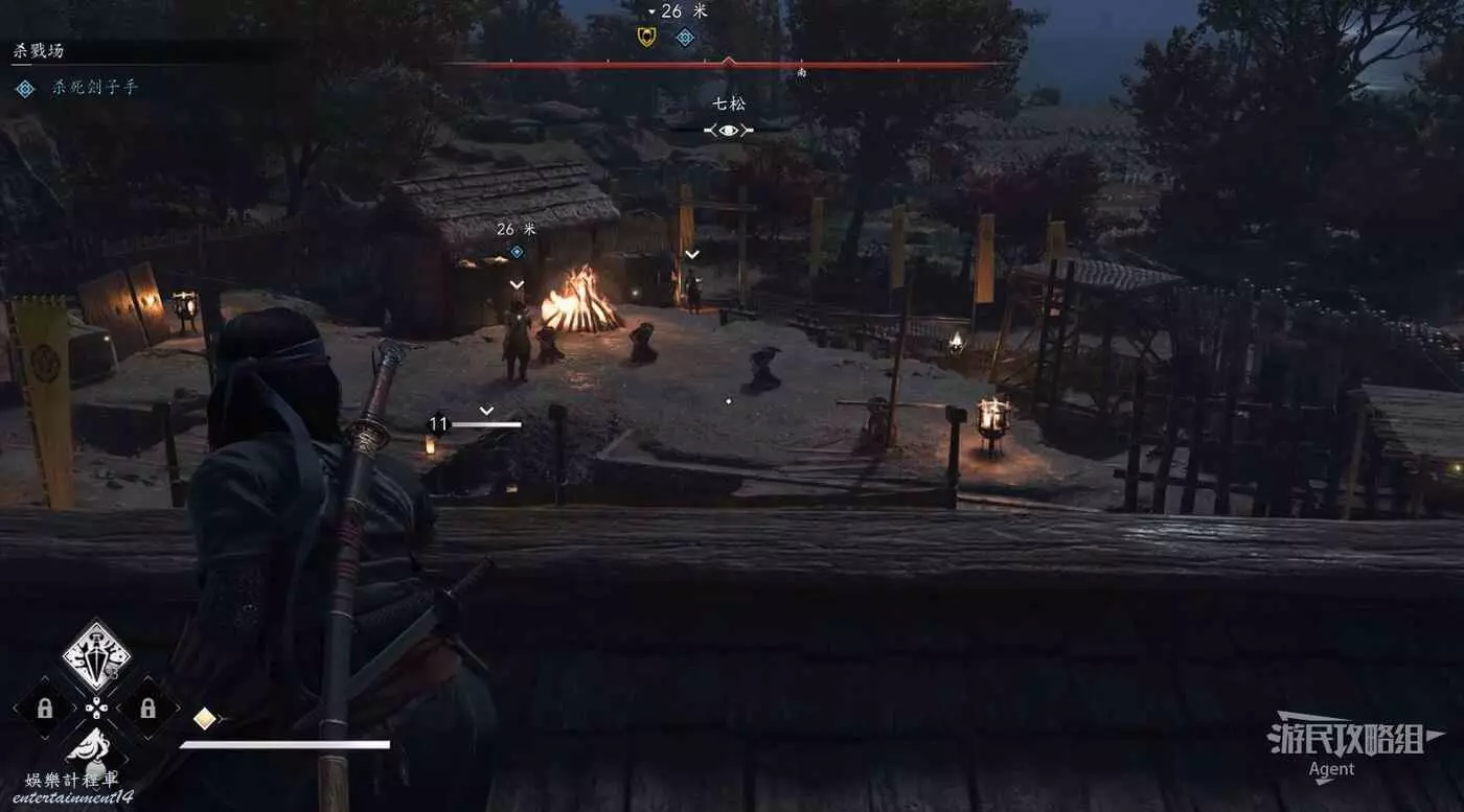 和三太夫對話後,走上樹枝,用鉤繩潛入營地。注意你現在是在回憶中,還沒有袖劍,所以無法刺殺敵人。