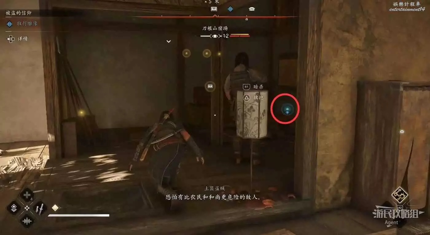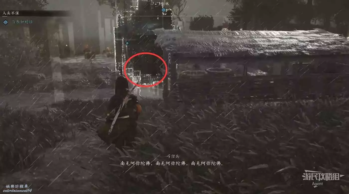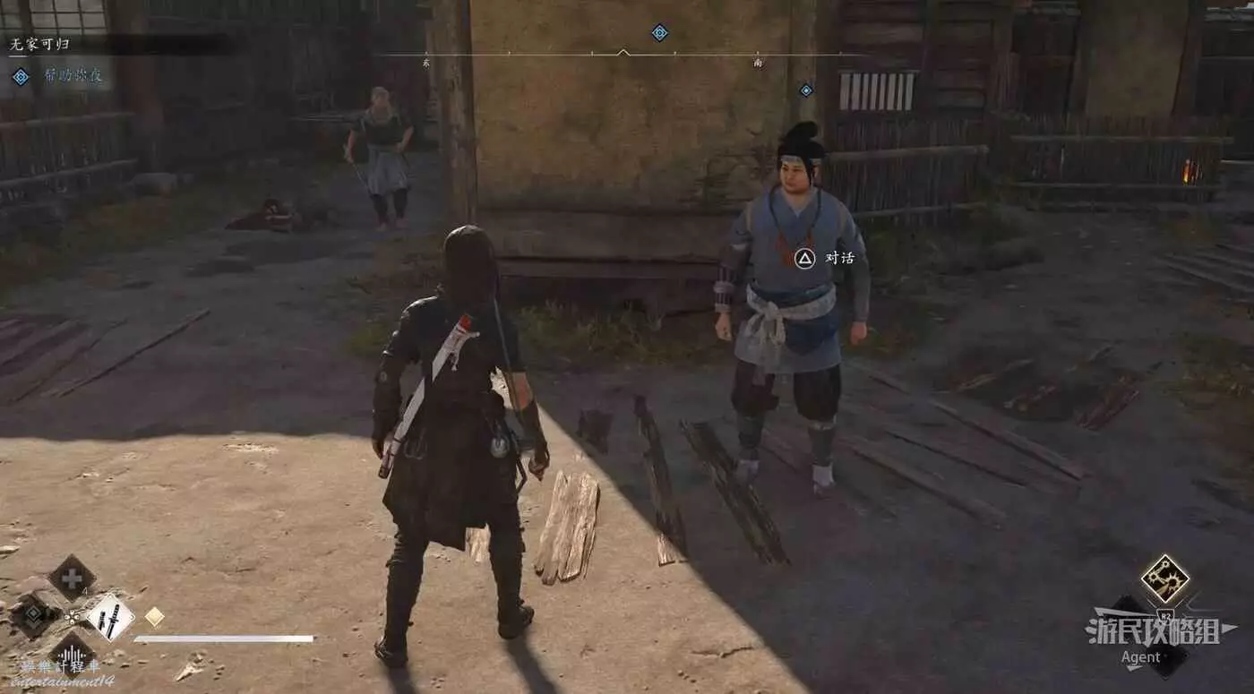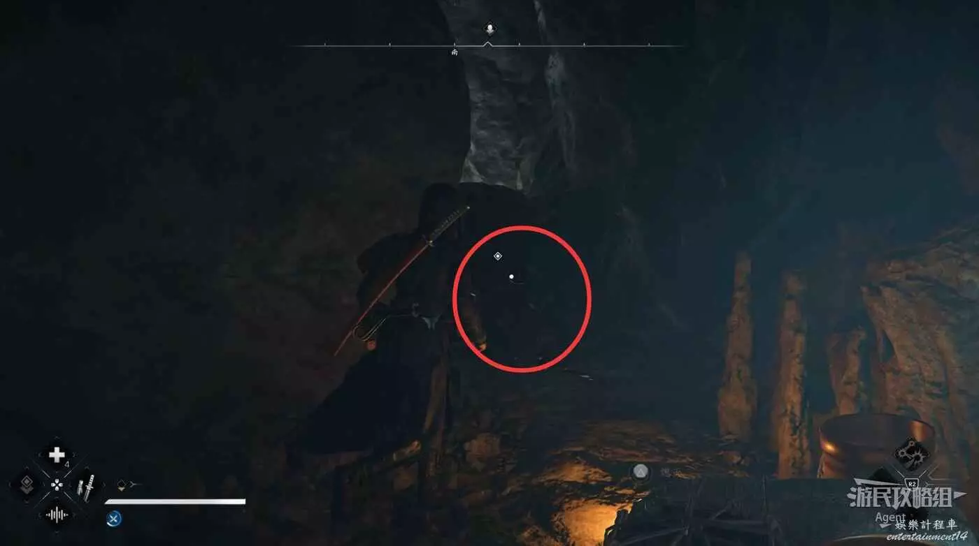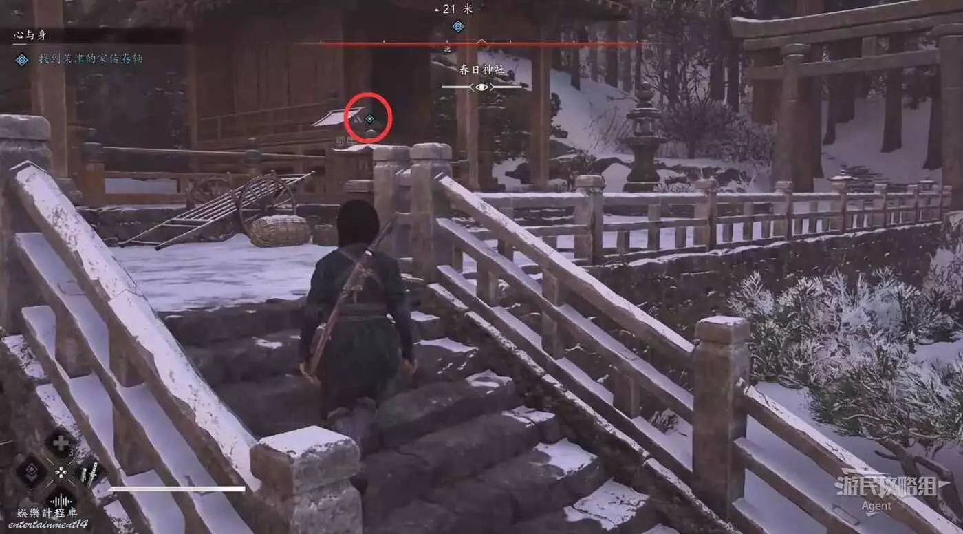 和三太夫對話後,走上樹枝,用鉤繩潛入營地。注意你現在是在回憶中,還沒有袖劍,所以無法刺殺敵人。