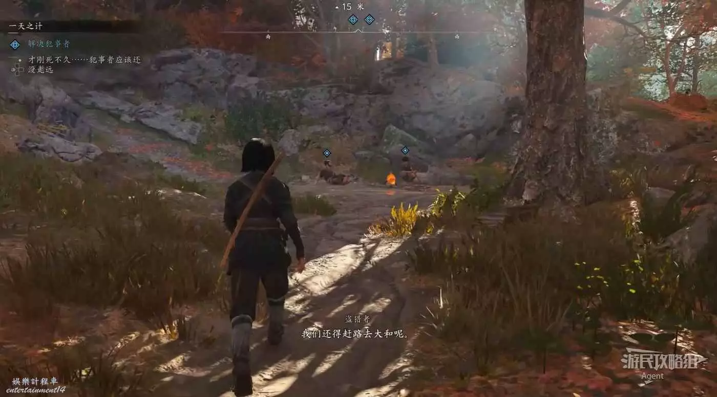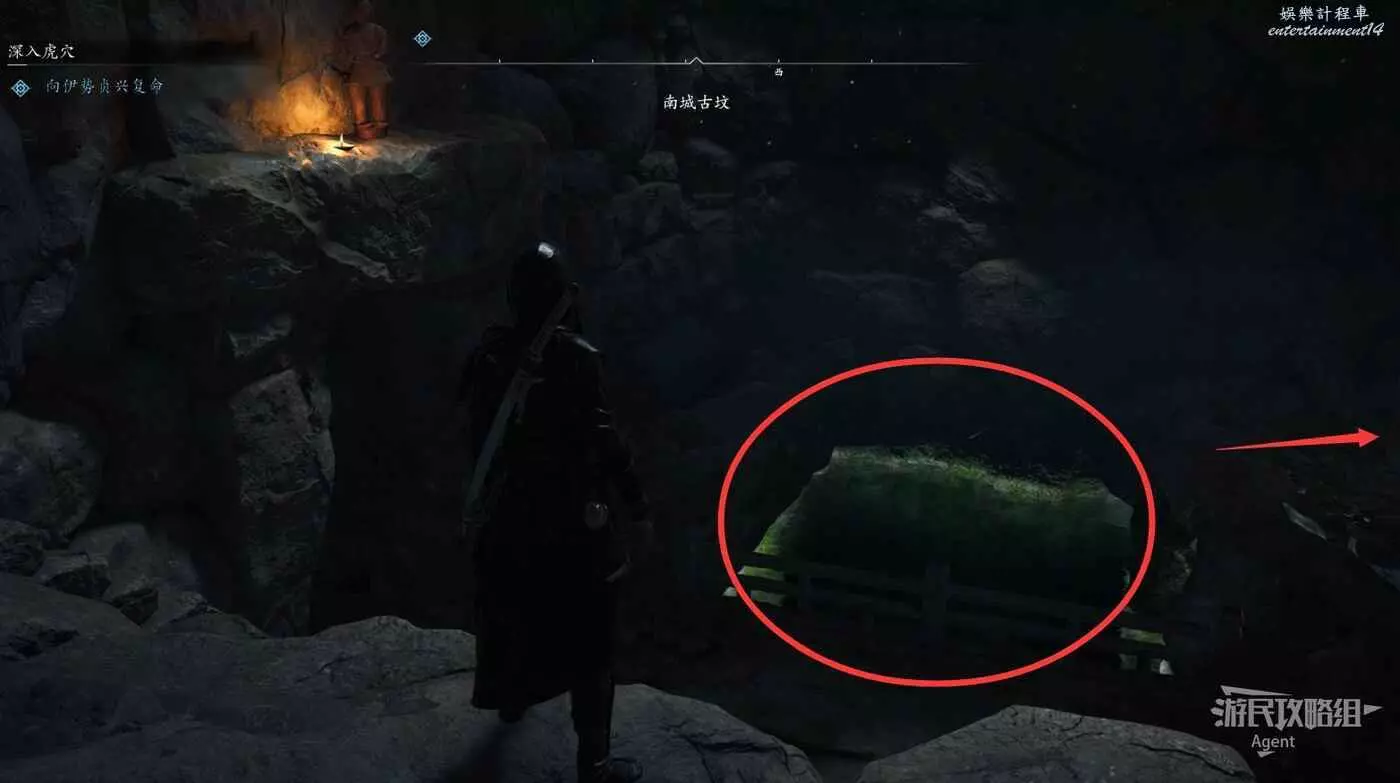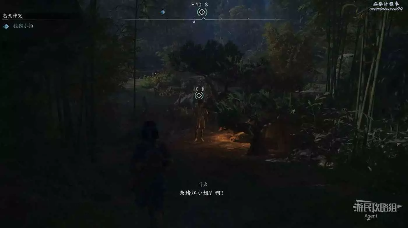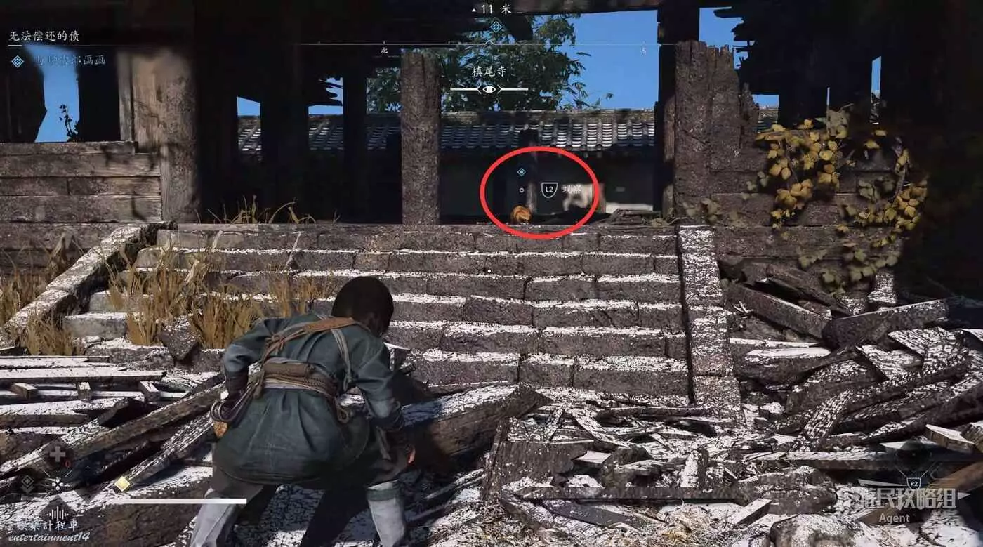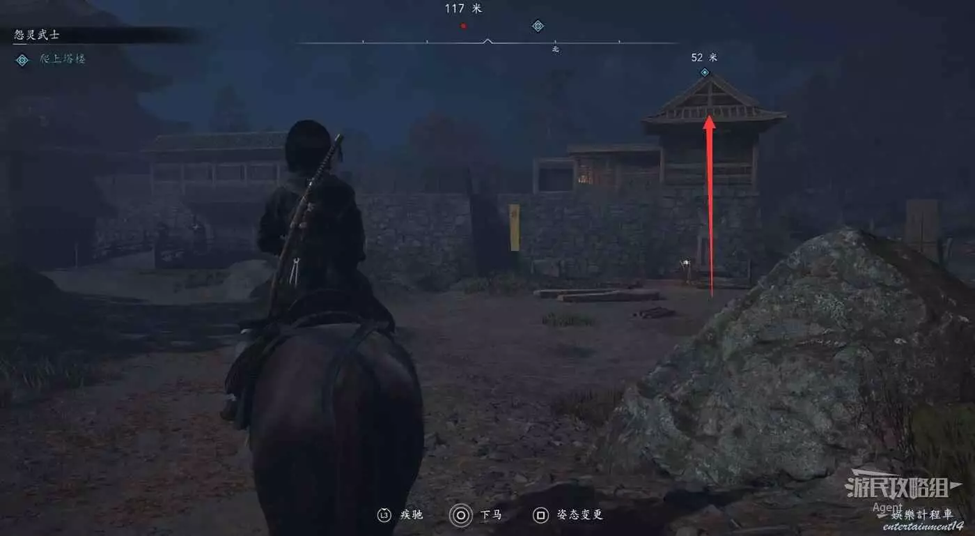 和三太夫對話後,走上樹枝,用鉤繩潛入營地。注意你現在是在回憶中,還沒有袖劍,所以無法刺殺敵人。