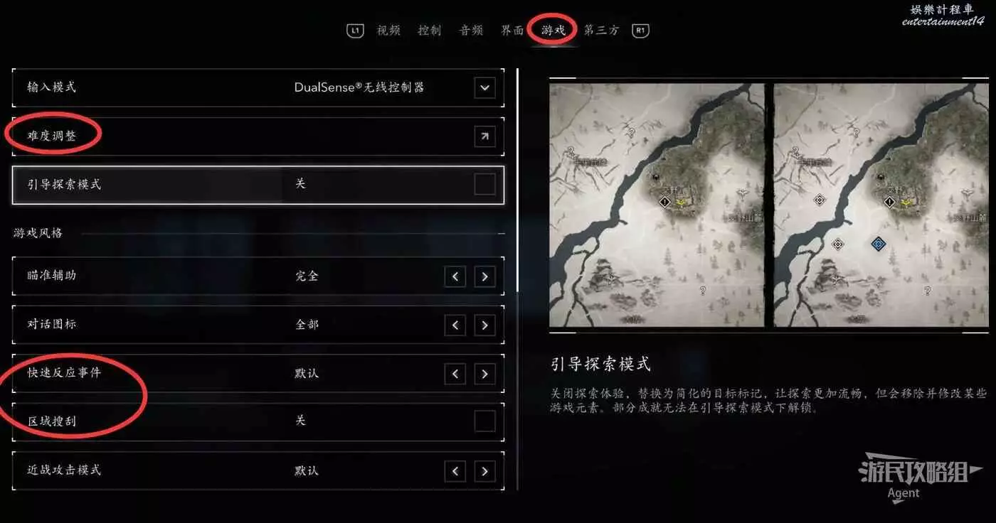 引導探索:開啟後,所有任務目標會直接標註在地圖上,比較省心。在遊戲初期你可以關閉一段時間體驗一下沒有引導的樣子,但是一直自己探索會很煩很雞肋,遲早還是得開啟的。