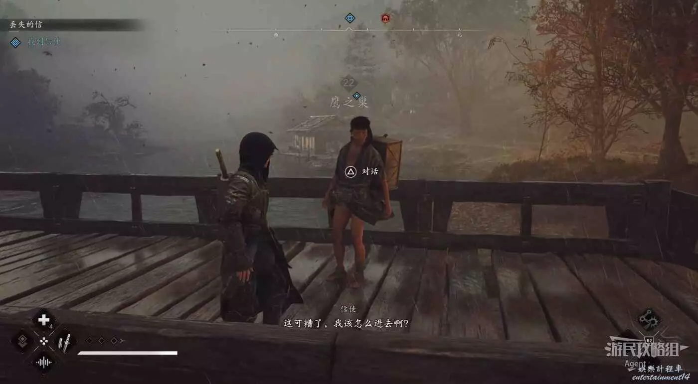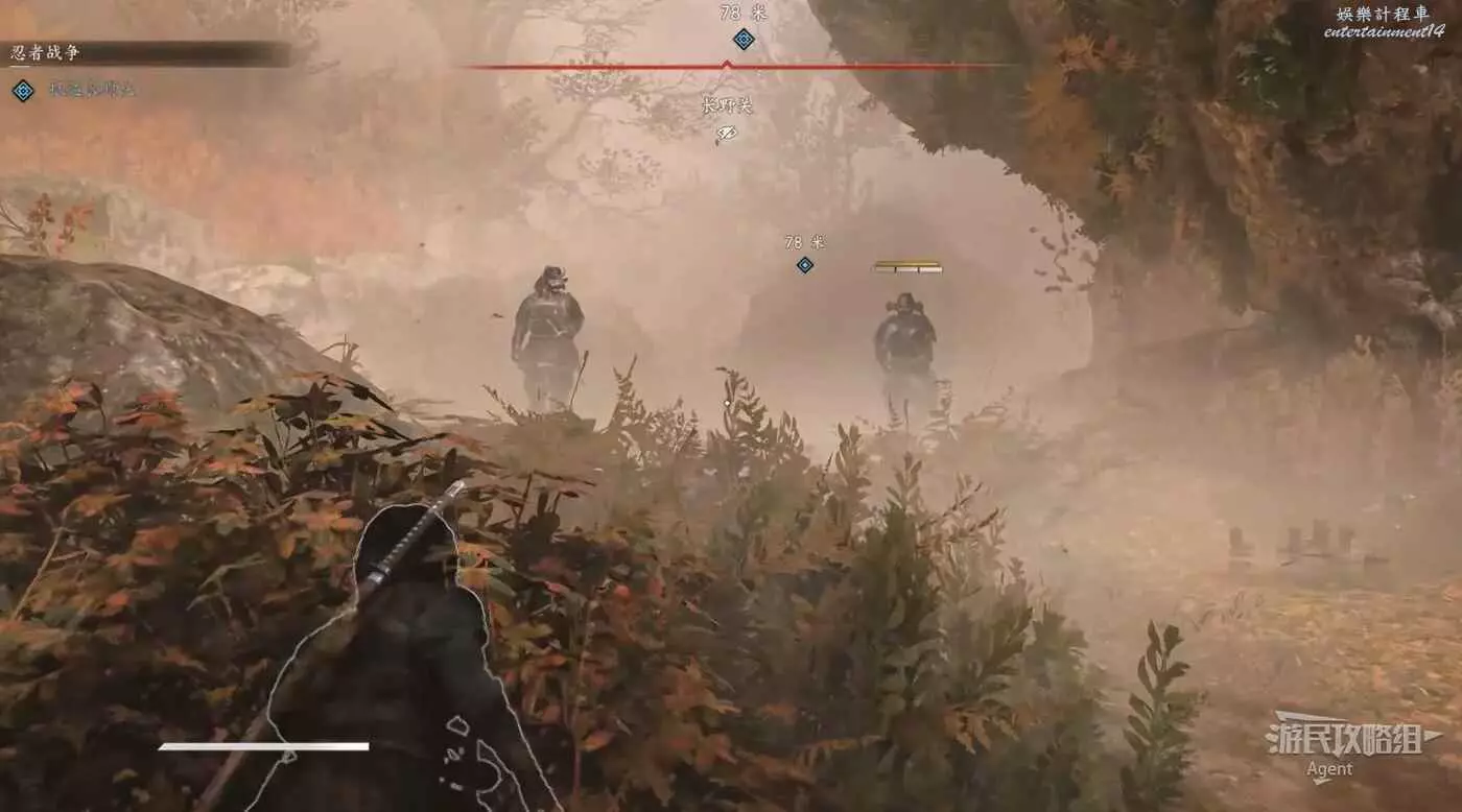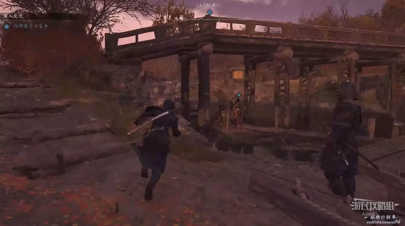 在草叢中潛行避開大量敵人,到前面過橋。劇情後擊敗織田氏壯漢。