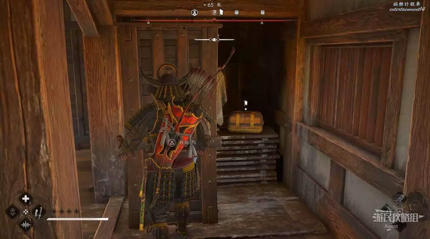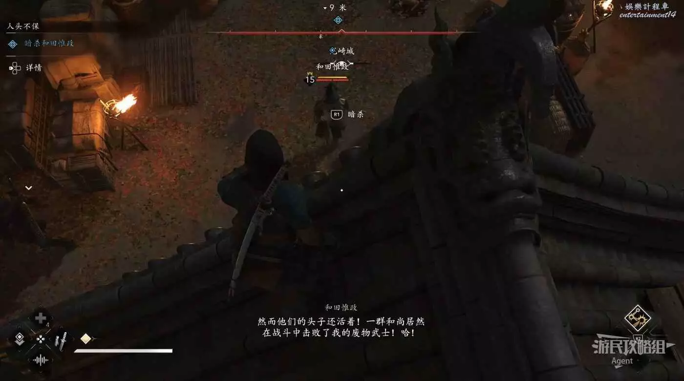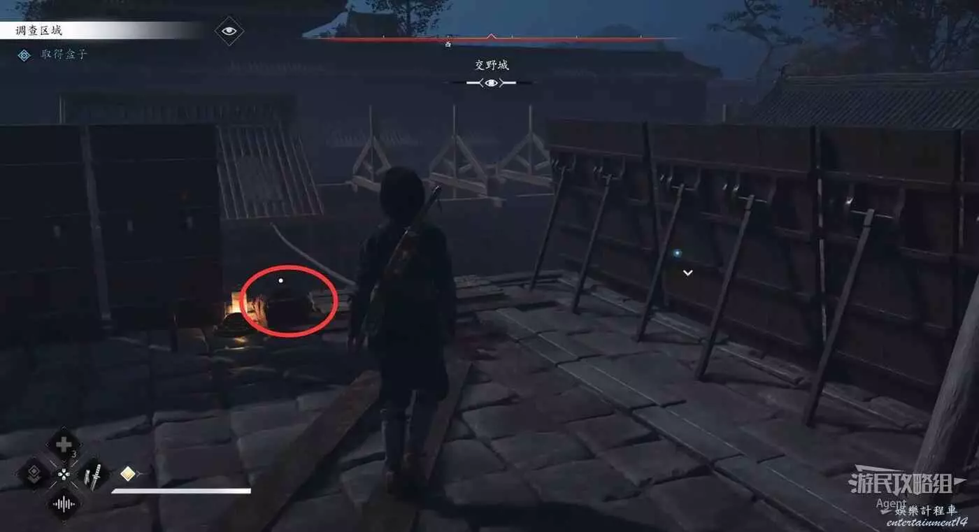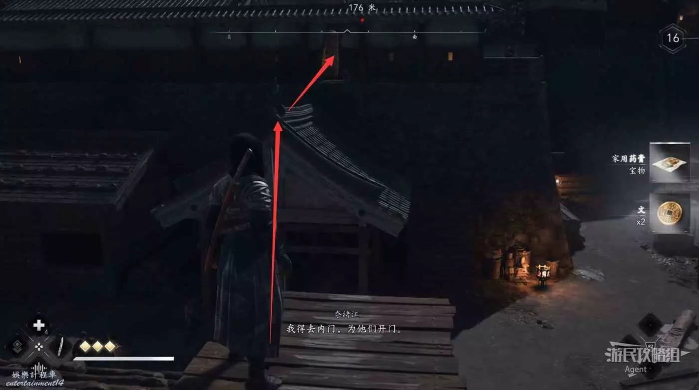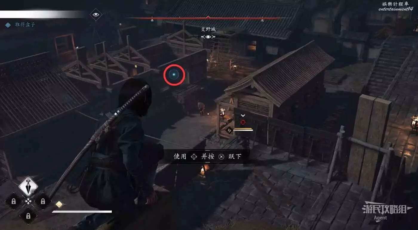 終於找到搶你盒子的井戶義廣,使用鉤繩蕩過去然後從空中暗殺,然後逃出城觸發劇情。