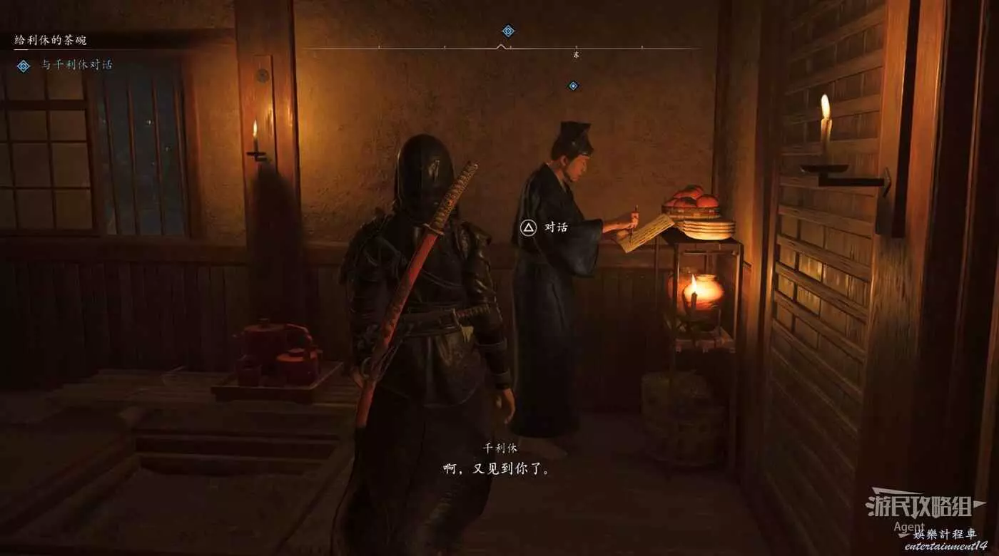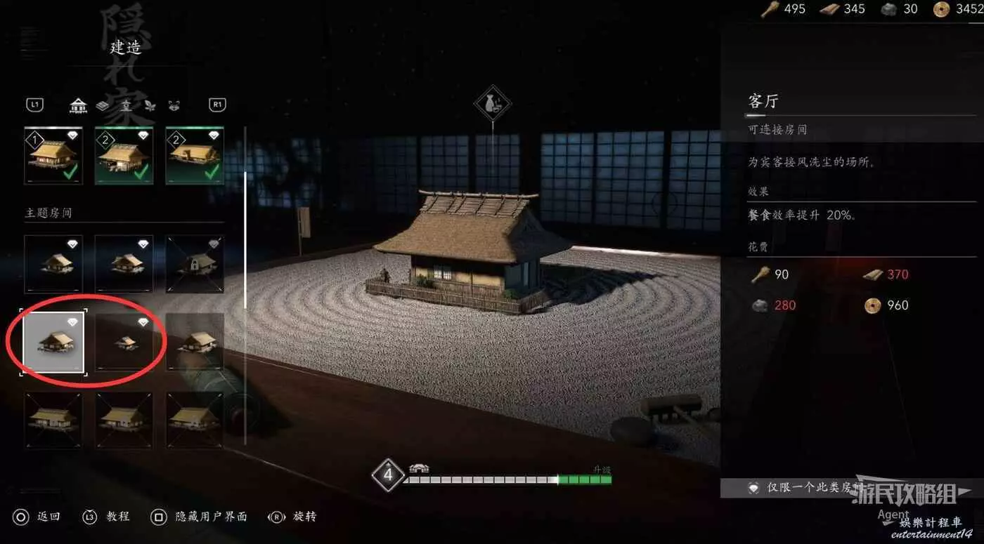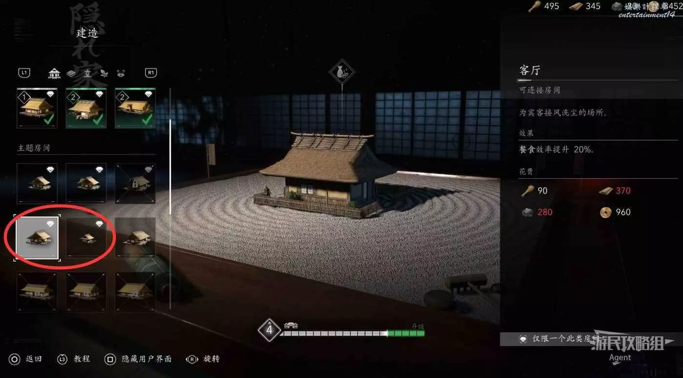 做了“鐵手座”“給利休的茶碗”這兩個和茶道大師有關的任務後,藏身處會解鎖客廳、茶室(都不需要做完,任務做到中途就會解鎖),建造這兩個建築可以提高餐食的回血效率。