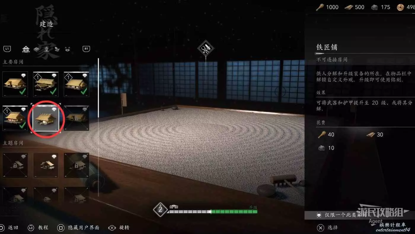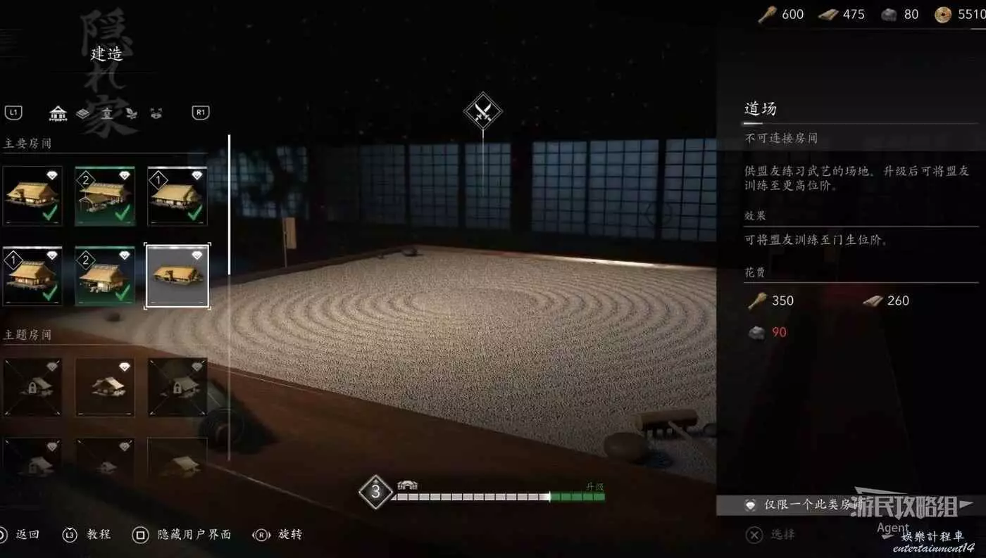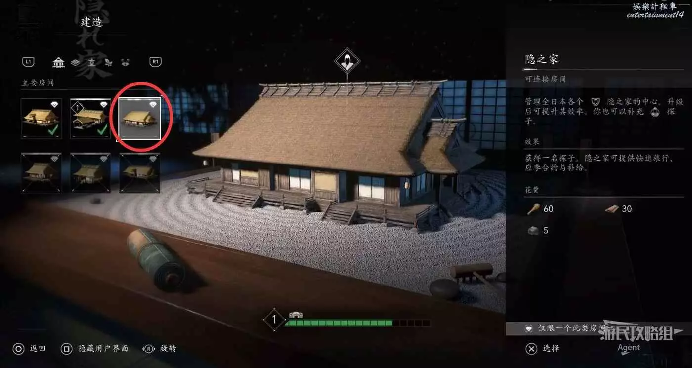 做了“鐵手座”“給利休的茶碗”這兩個和茶道大師有關的任務後,藏身處會解鎖客廳、茶室(都不需要做完,任務做到中途就會解鎖),建造這兩個建築可以提高餐食的回血效率。
