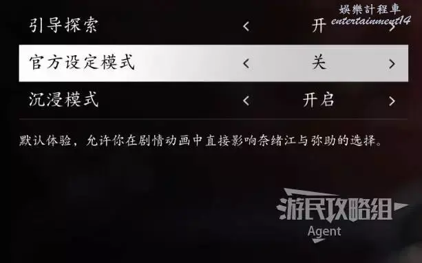 官方設定模式:開啟後,將移除劇情中的所有對話選項,主角的對話以官方預設設定為准,懶得做選擇的話就開啟。個人建議關閉,有些對話選項自己選會更有參與感,雖然不會造成任何影響。注意這個選項進入遊戲後無法再更改。