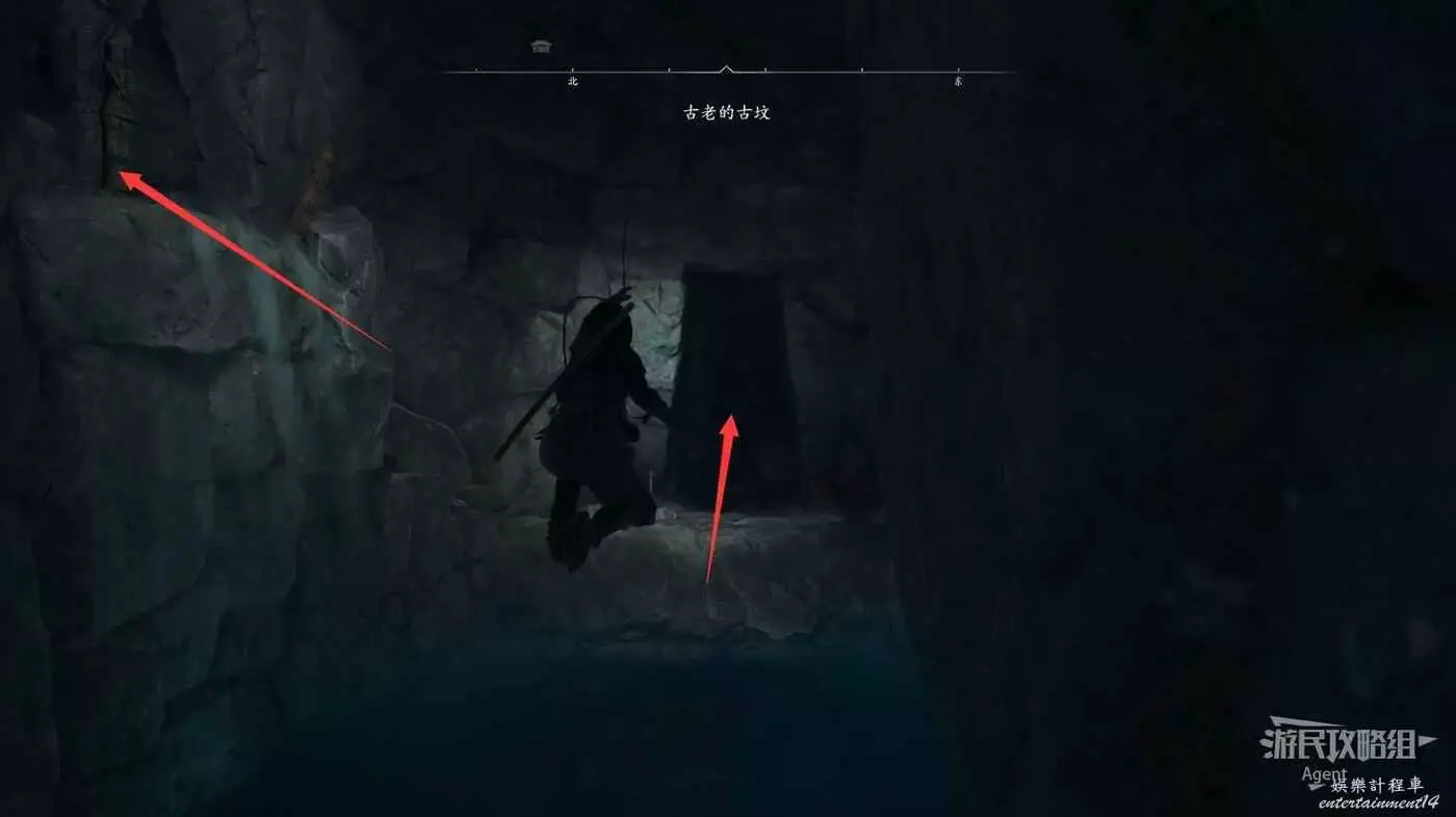 過來後先放下炸藥,射爆下面右側的炸藥,進去拿個小寶箱。