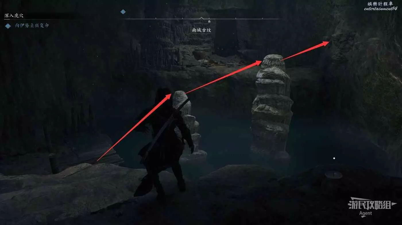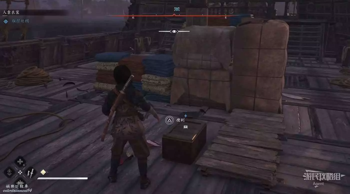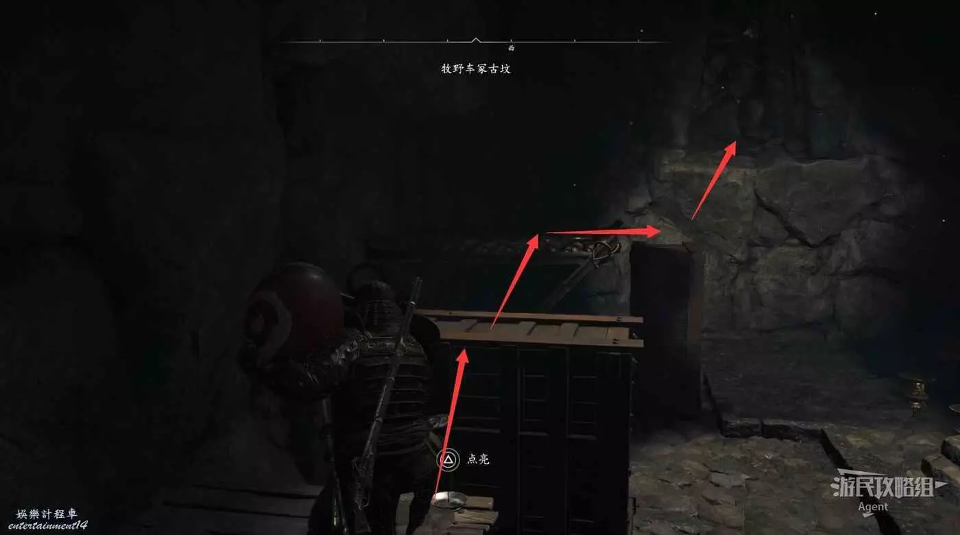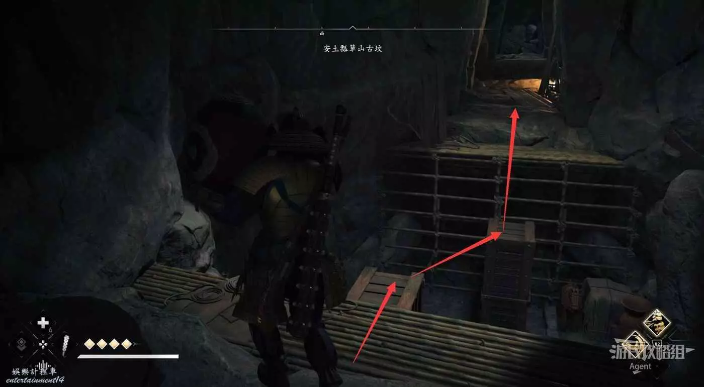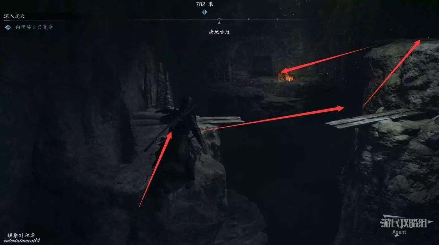 然後用鉤繩跳到右邊,從右邊潛入營地。