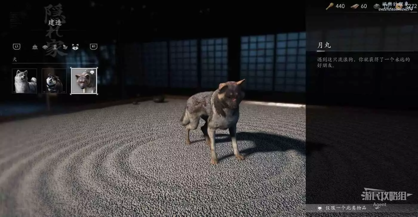 然後狗狗月丸就和你撫摸過的其他動物一樣,可以在藏身處的建造模式裡,把它們建在你想要的位置上。