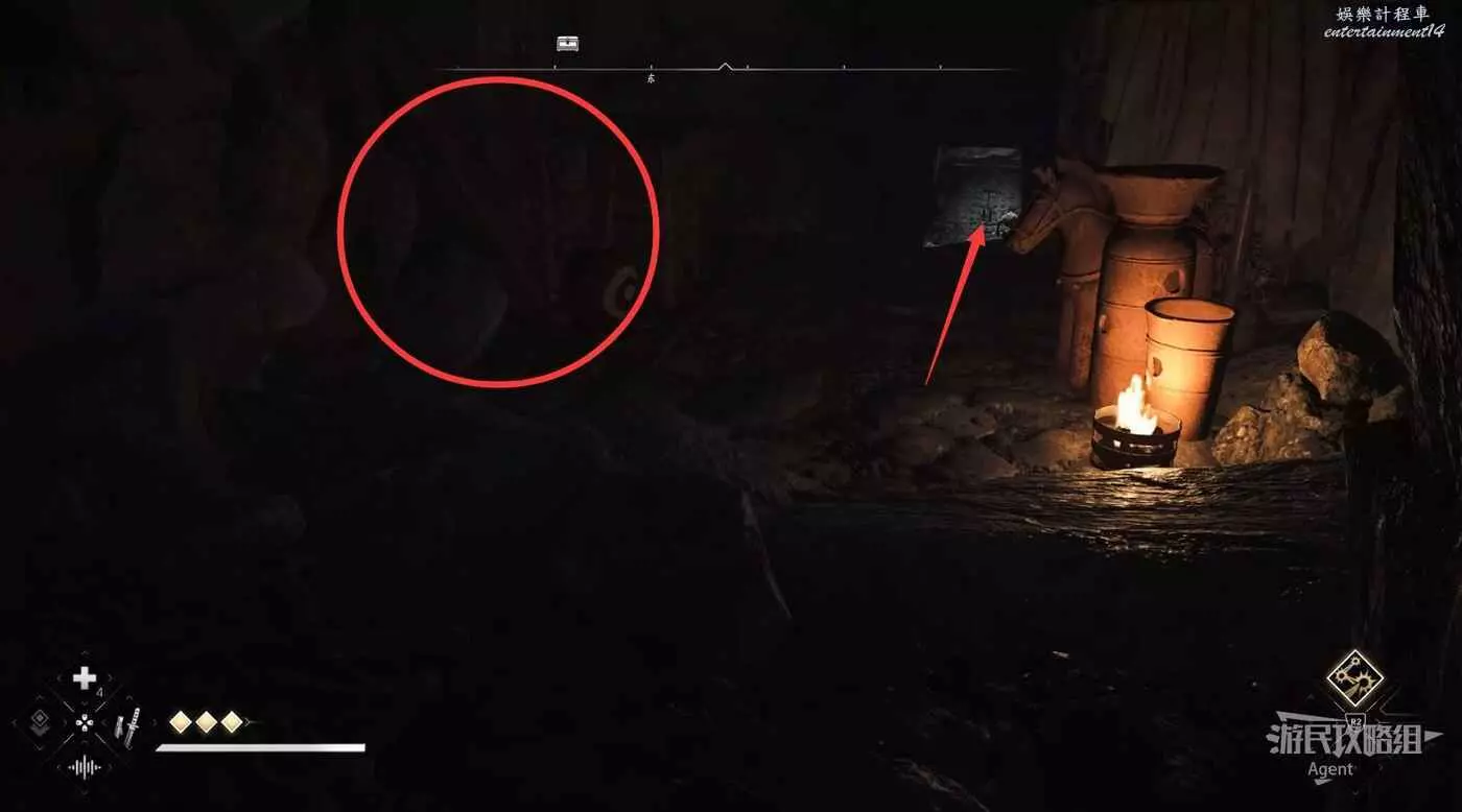 來到有兩個櫃子的房間,樓梯上方的路被堵著,拉開櫃子走左邊的路,即可繞一圈抵達樓梯上方的房間拿到炸藥。