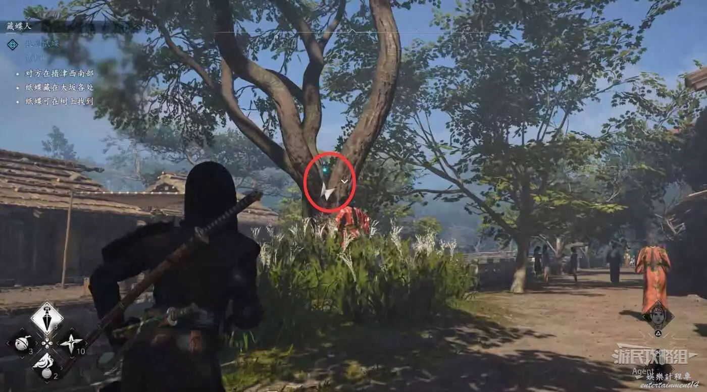 在交野城西面,飾品商人旁的神秘女子,要你去收集10個彩色紙蝶。