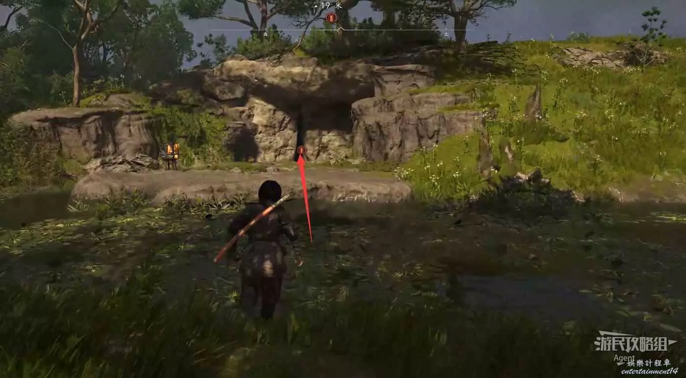 走下坡左拐有個小寶箱,然後回頭看有個狹縫,鑽過狹縫後潛到水下。