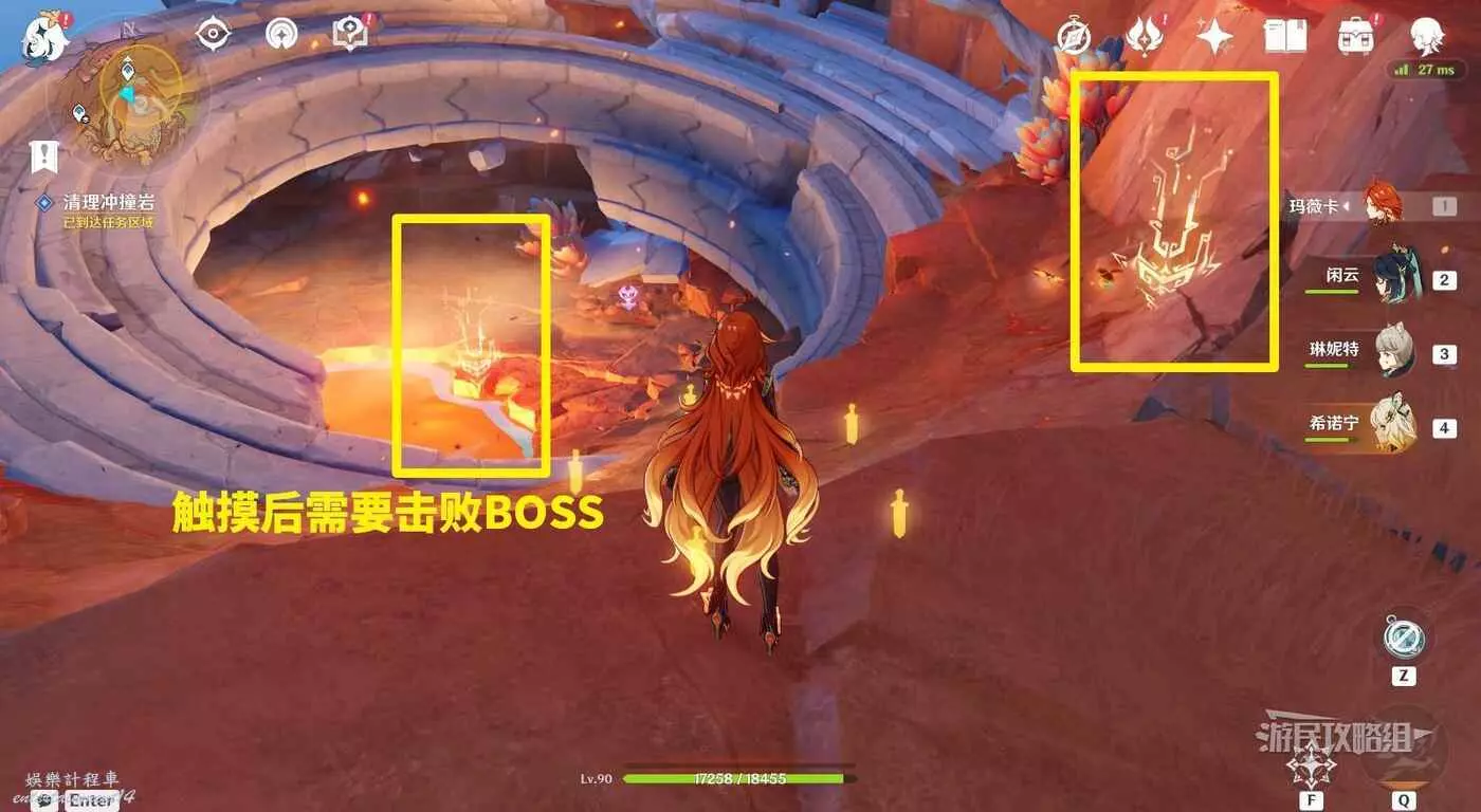 清理完岩石後會發現,岩石後方有4個黃色游標,分別觸摸3游標讓它們回到圓盤死角的支柱上(其中有一個本來就在支柱上)。注意觸摸後出現BOSS的那個游標需要在擊敗BOSS後再觸摸一次,其他的游標分別都觸摸一次即可。