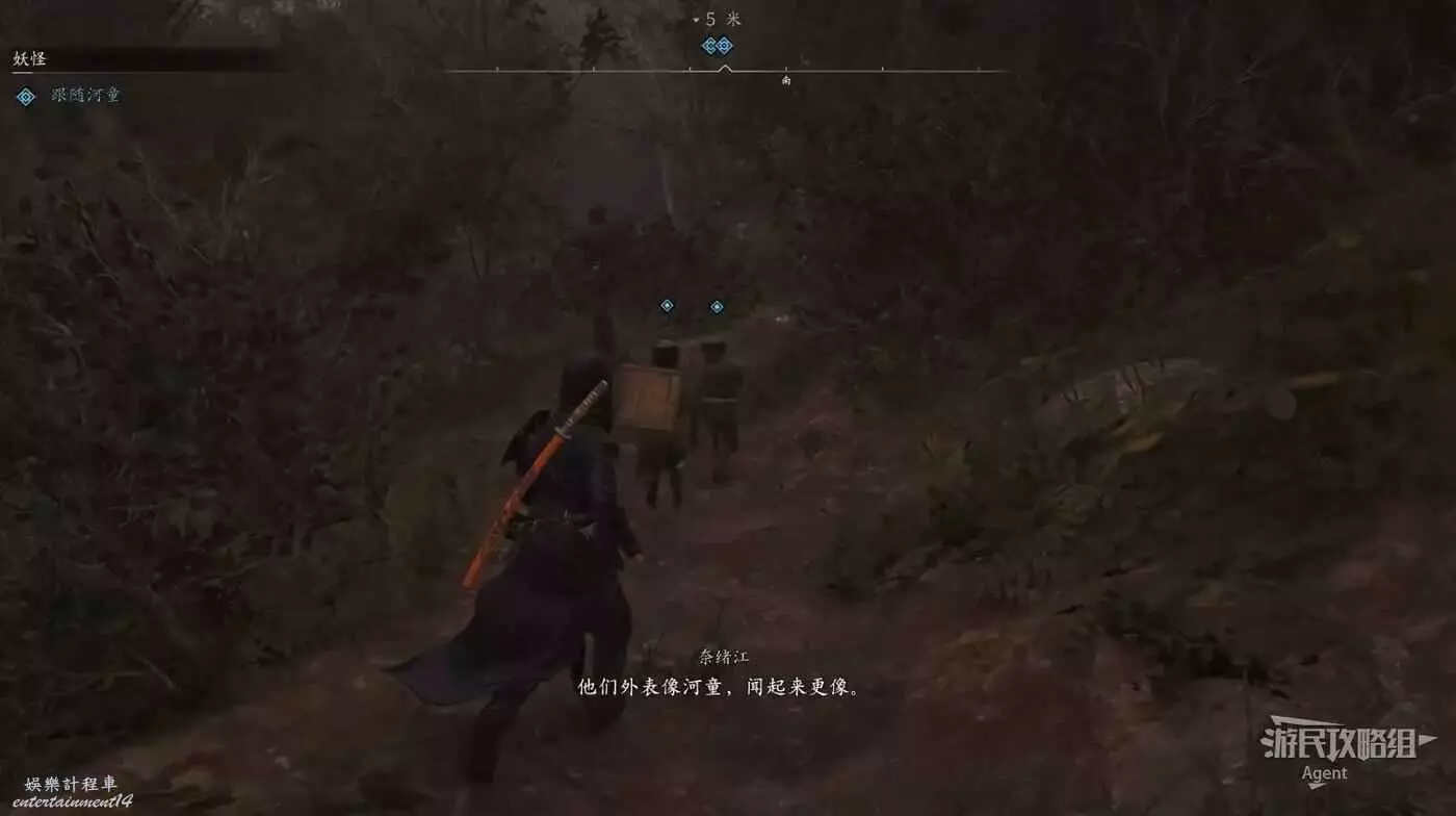 河童在山城北部,其實是倆小孩,跟隨他們去村裡解決強盜。