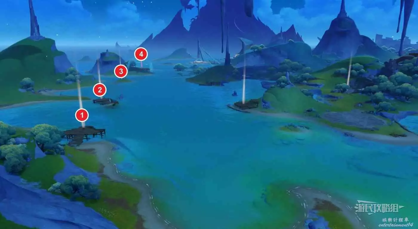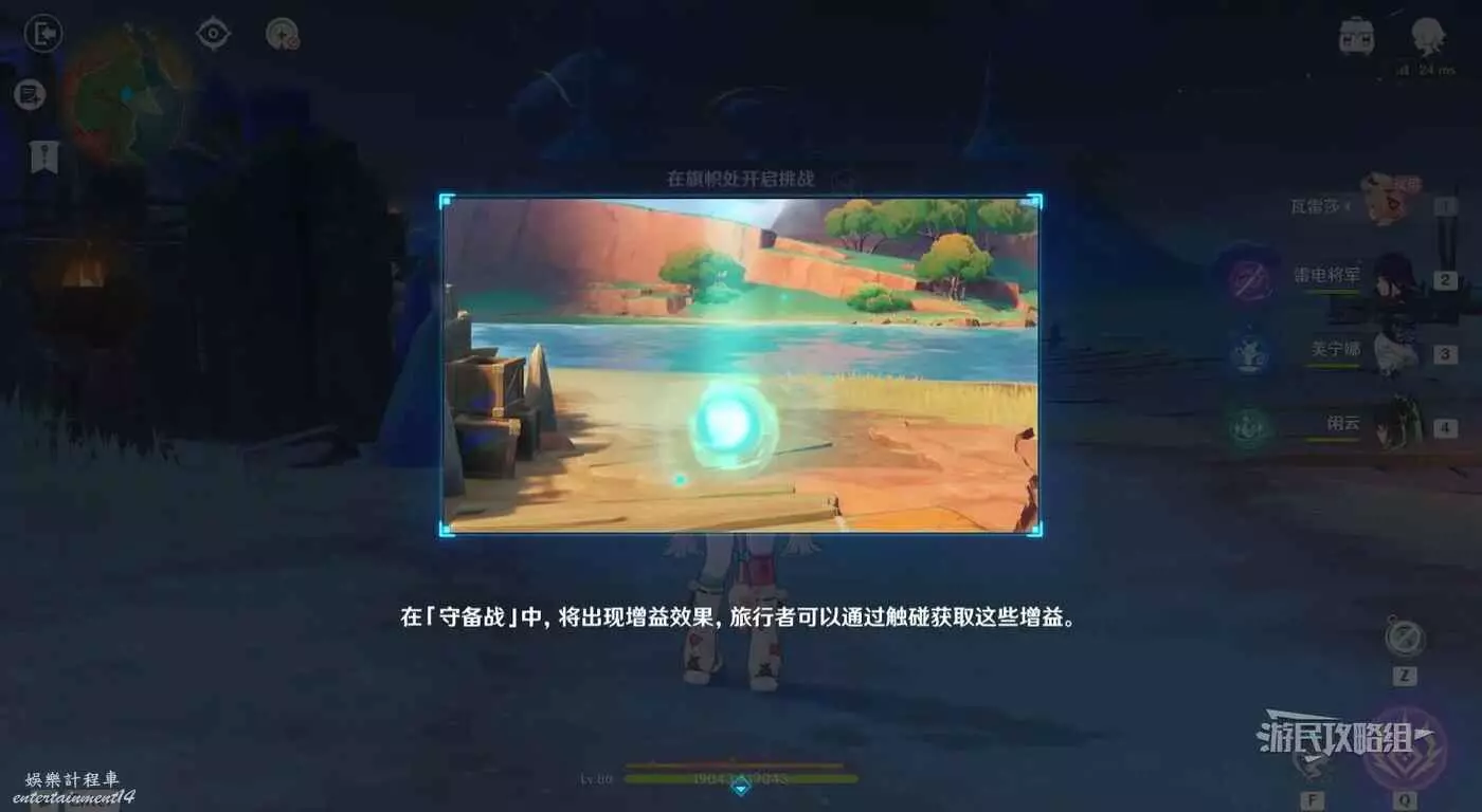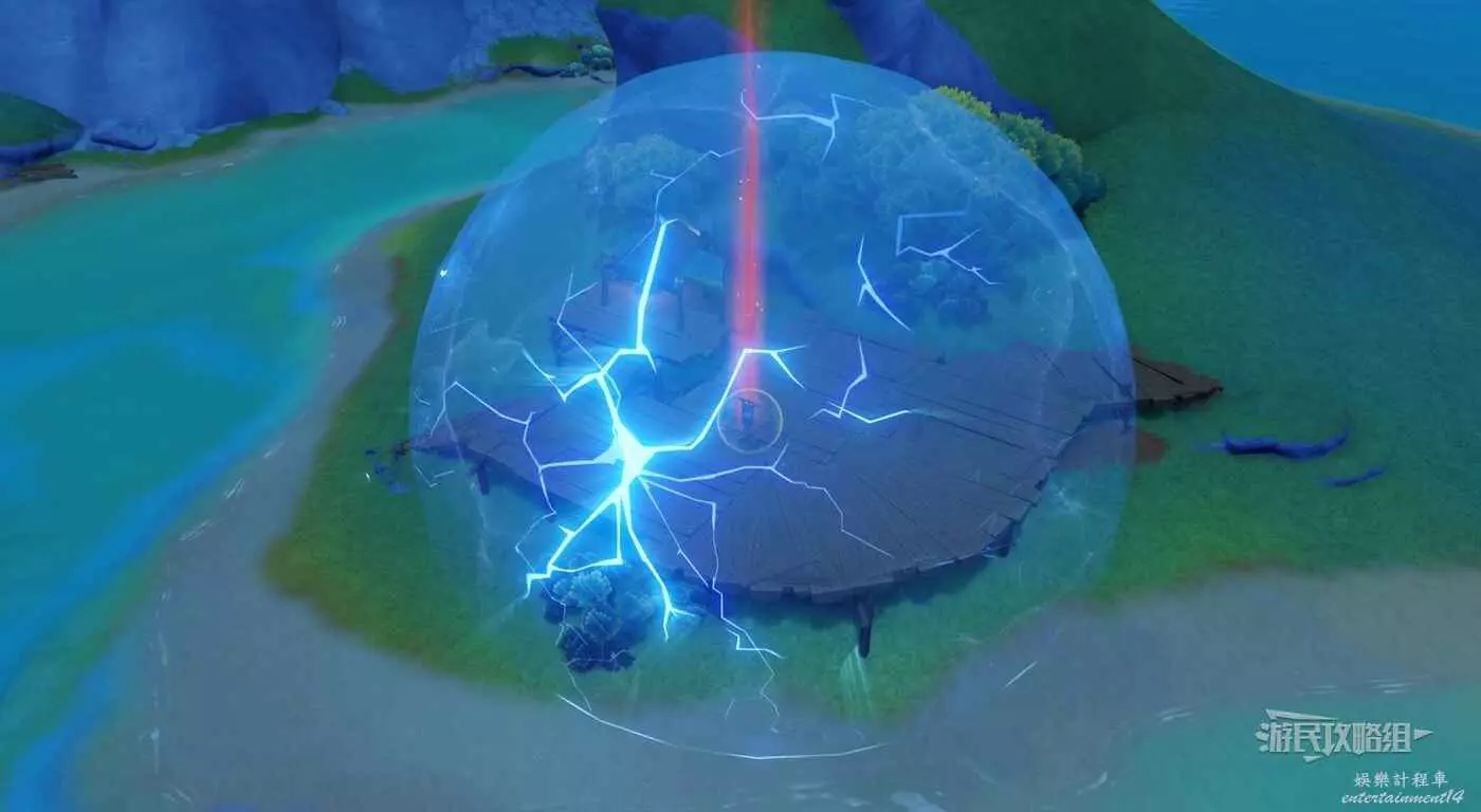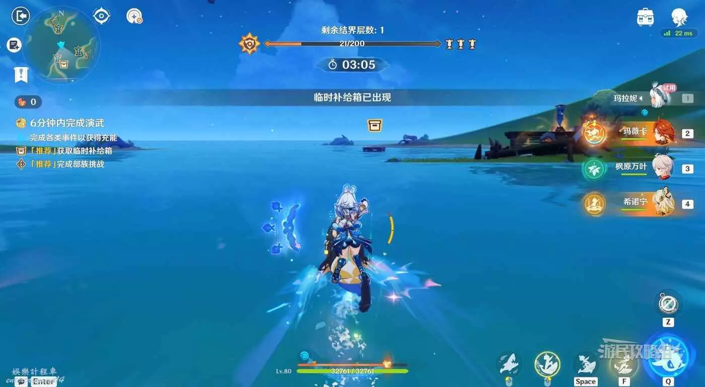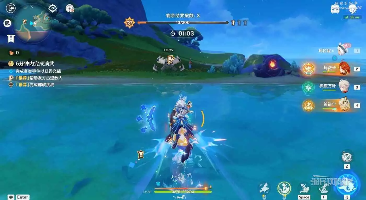 本關的部族挑戰是使用瑪拉妮拾取水面上的光球,躲避紫色球。拾取到一定程度後,左側會出現給儀式道具充能的提示,按照提示去附近的據點給儀式道具充能即可,根據大本營的護盾量來充能,沒有必要拾取到60能量或等到部族挑戰倒計時完全結束。
