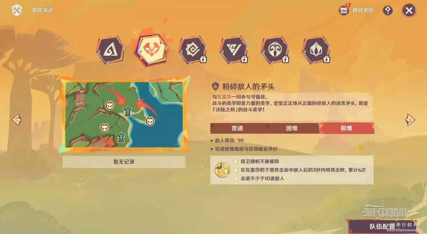 在關卡選擇介面可以選擇難度,極難才能獲得曜金評價。在極難難度下拿到兩星即可獲得所有獎勵,推薦優先完成【保衛旗幟不被摧毀】和【在瓦雷莎的下落攻擊命中敵人後的3秒內將其擊敗,累計6次】,這兩個比較容易完成。