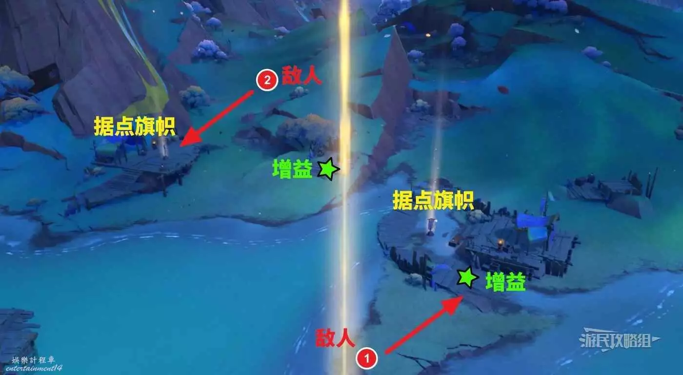 在①號點位佔領據點後,立即前往旁邊出現感嘆號的位置擊敗敵人。