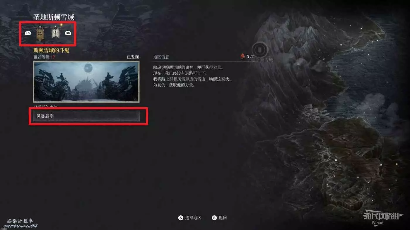 與佈雷德旁邊的石碑互動,選擇【聖地斯頓雪域】,切換左上角旗幟圖示進入地圖【風暴懸崖】。