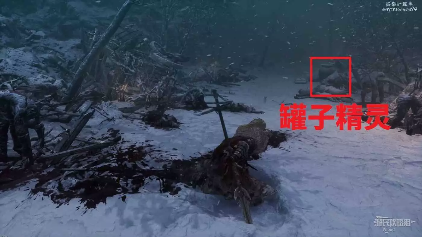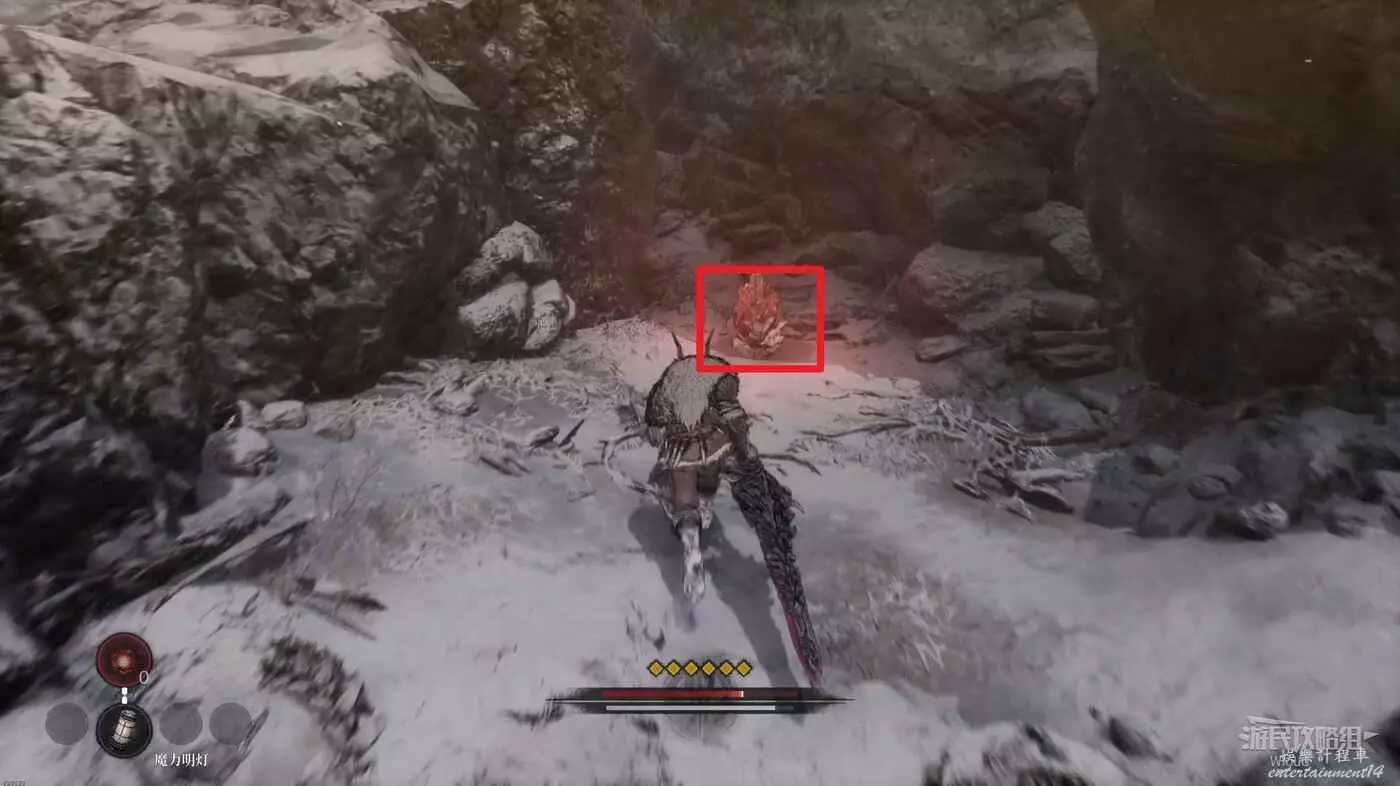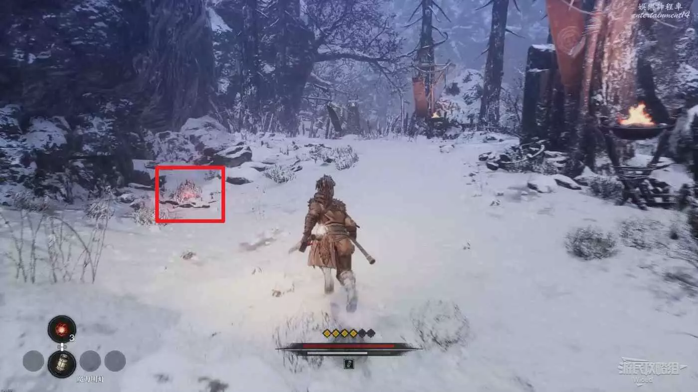 回到剛才擊敗雪怪的開闊場景,往右走,右側損毀的馬車前可以拾取靈魂之類粉末,往左側有篝火的道路走。