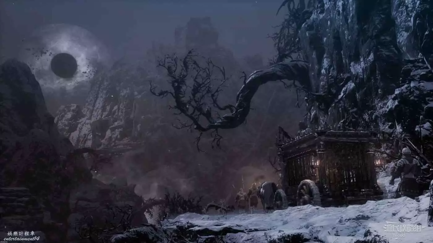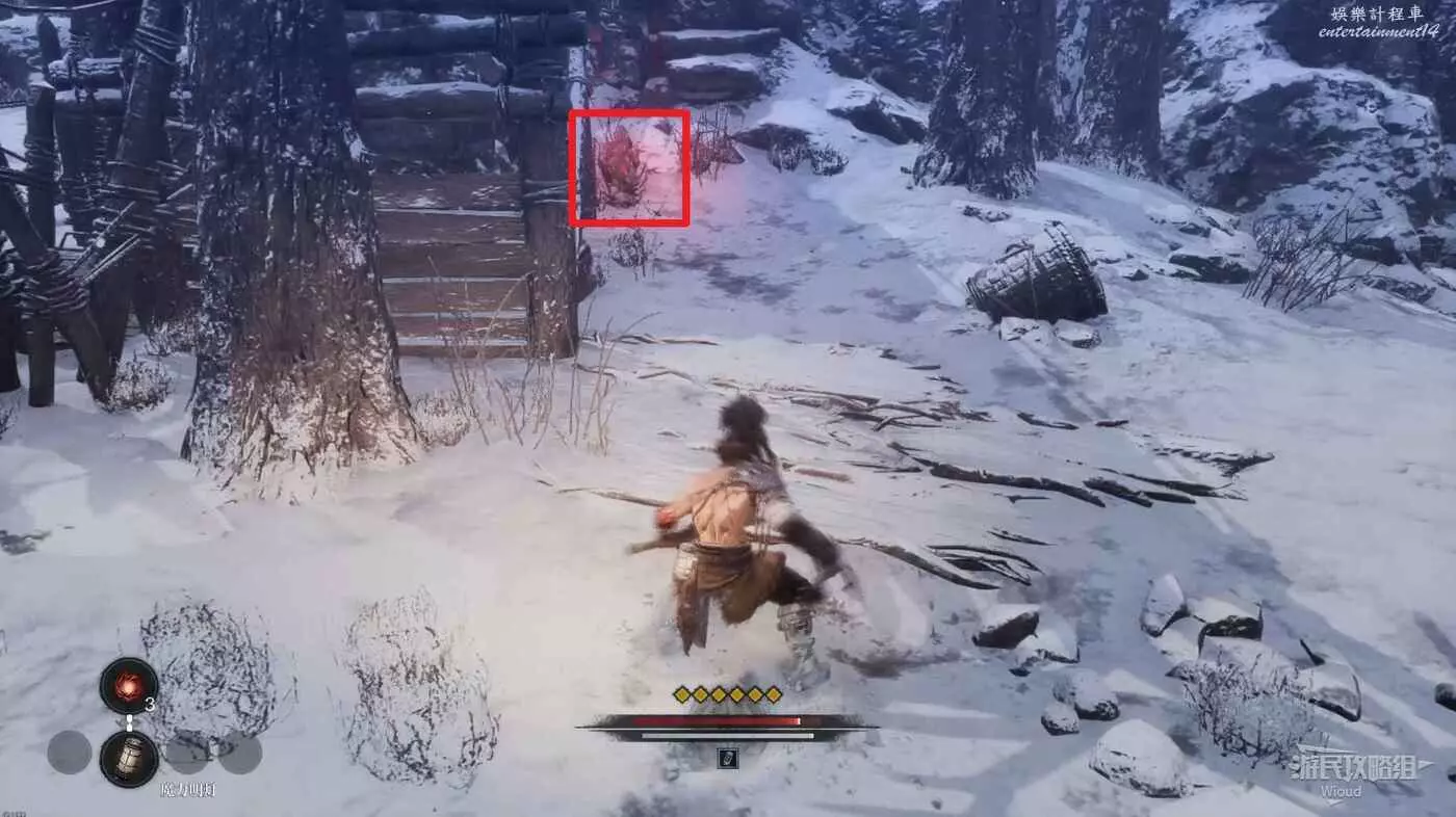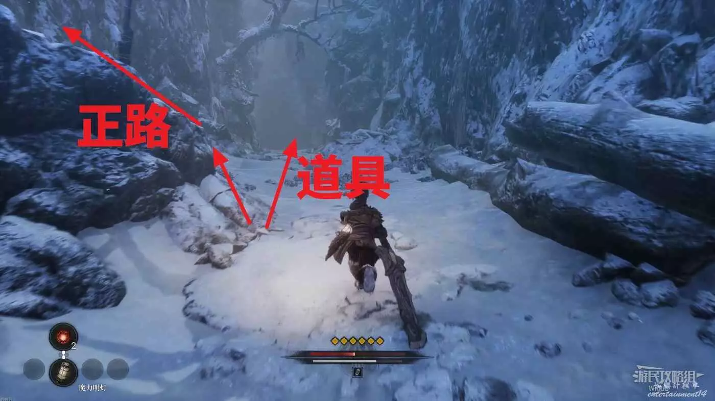回到剛才擊敗雪怪的開闊場景,往右走,右側損毀的馬車前可以拾取靈魂之類粉末,往左側有篝火的道路走。