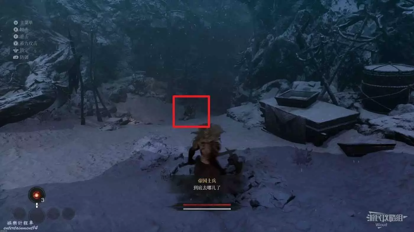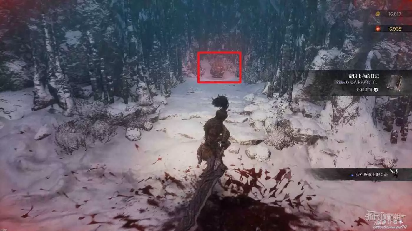 回到T字路口往左走,看到幾個帝國士兵和雪怪打架,右側小道盡頭可以拿到收集品【有關雪魈的記錄】。