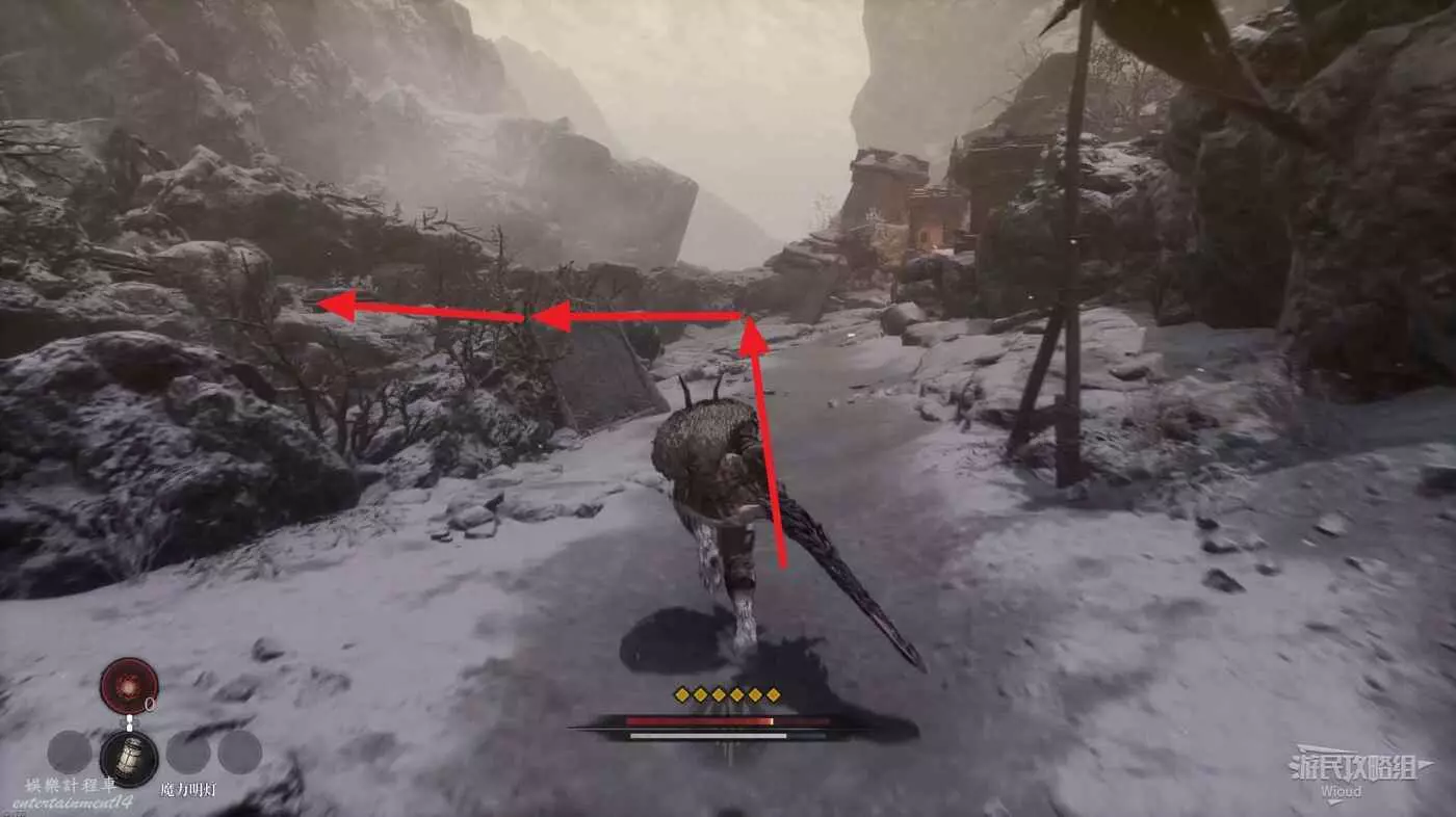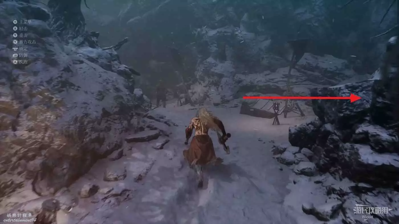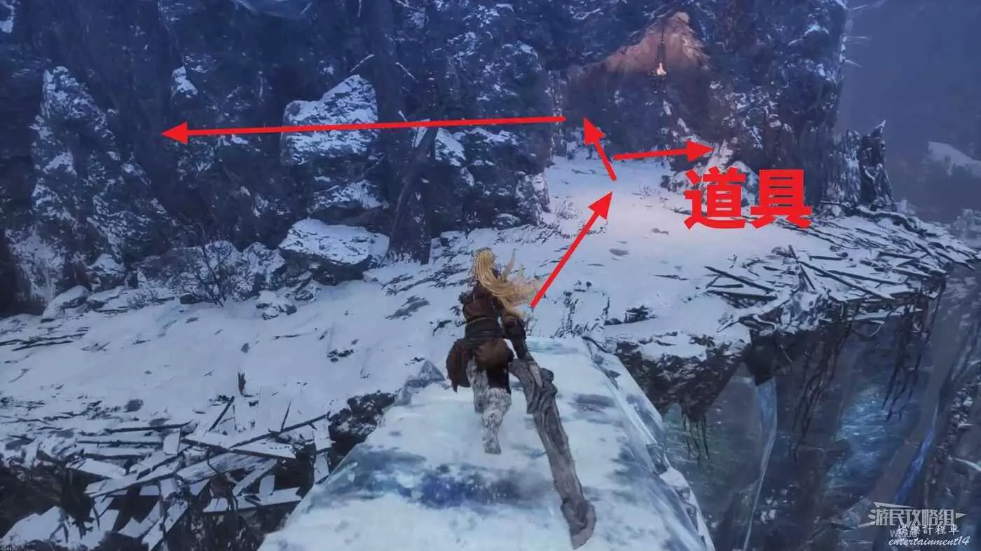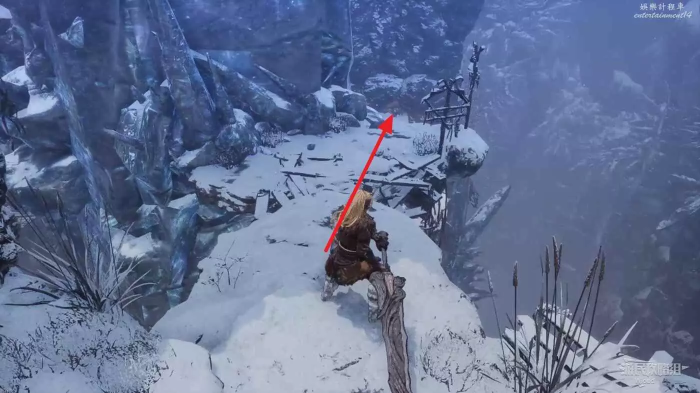 屍體位置往左走,不遠處左側有一個凹口可以撿道具,沿路走到盡頭啟動關卡第二個篝火點風雪峽谷。