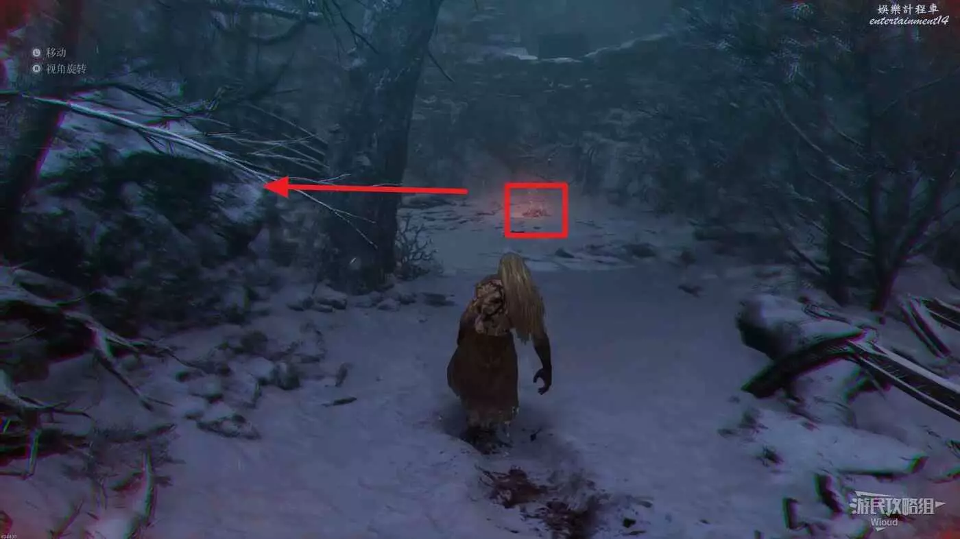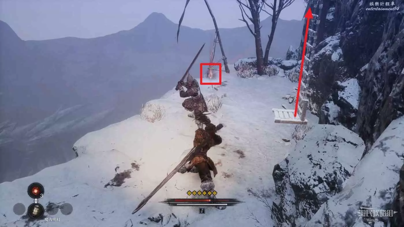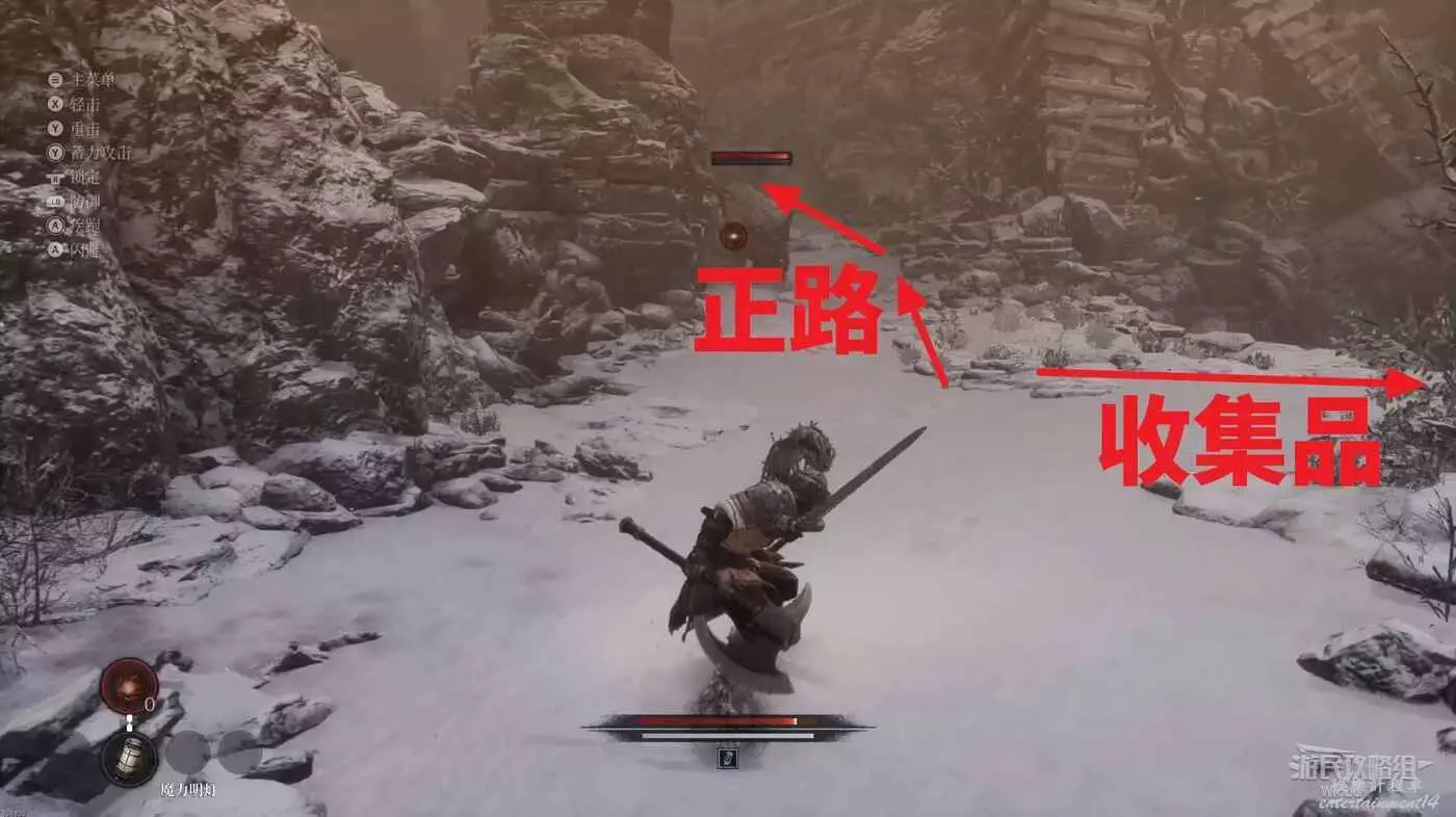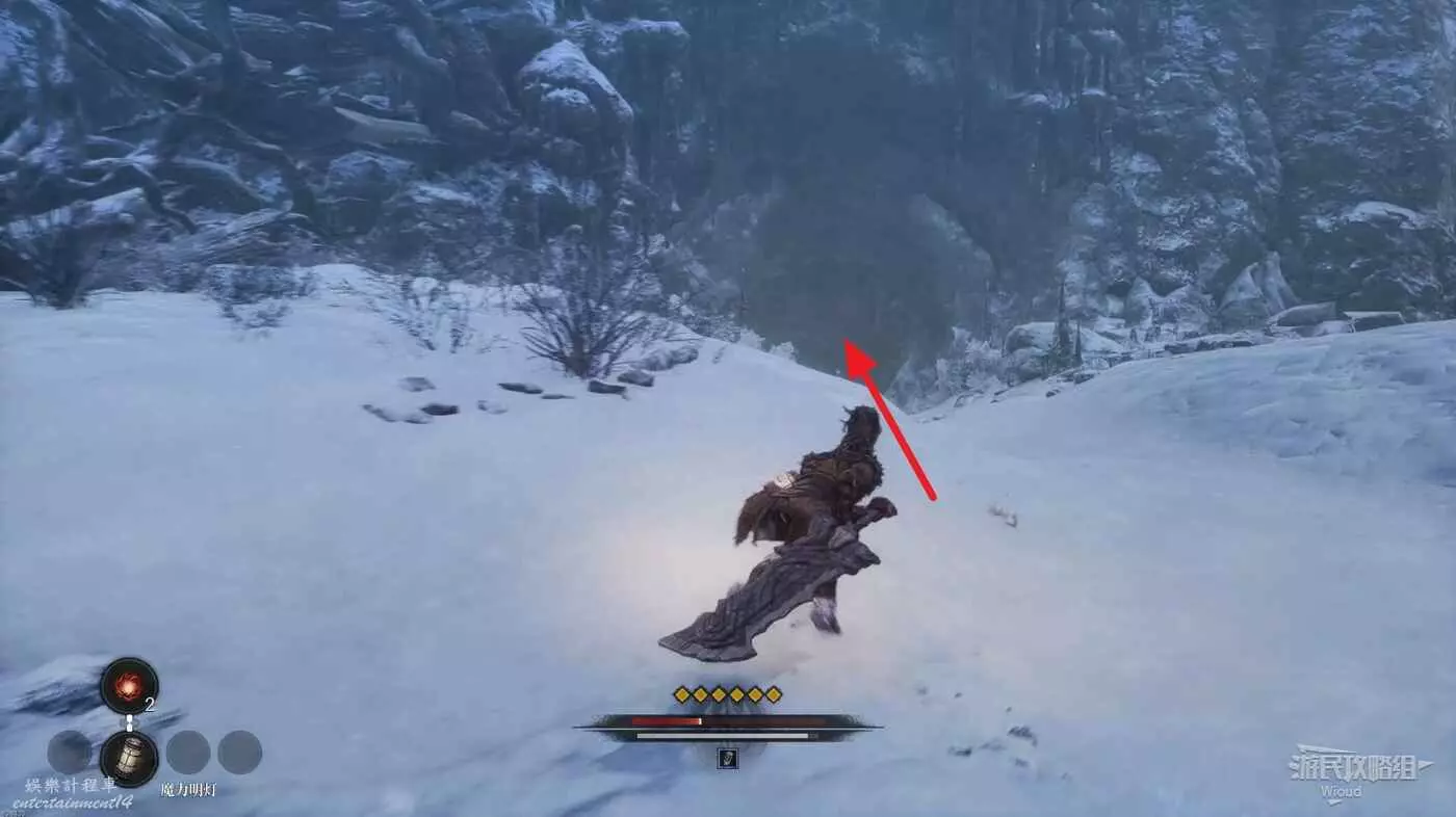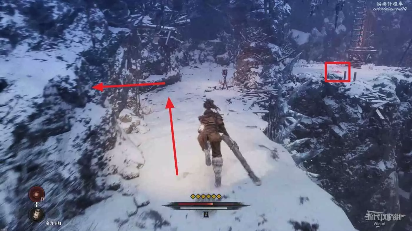 屍體位置往左走,不遠處左側有一個凹口可以撿道具,沿路走到盡頭啟動關卡第二個篝火點風雪峽谷。