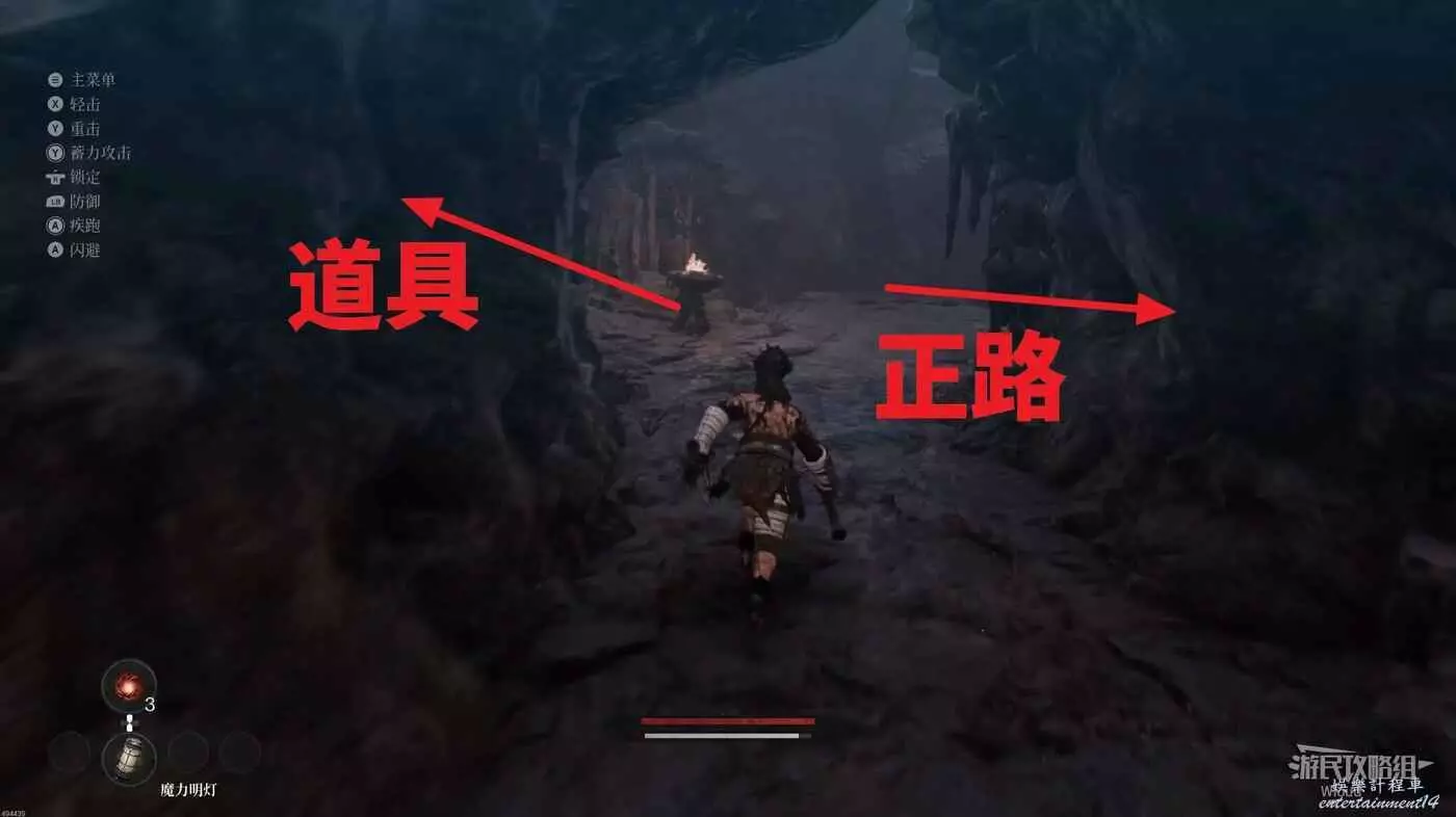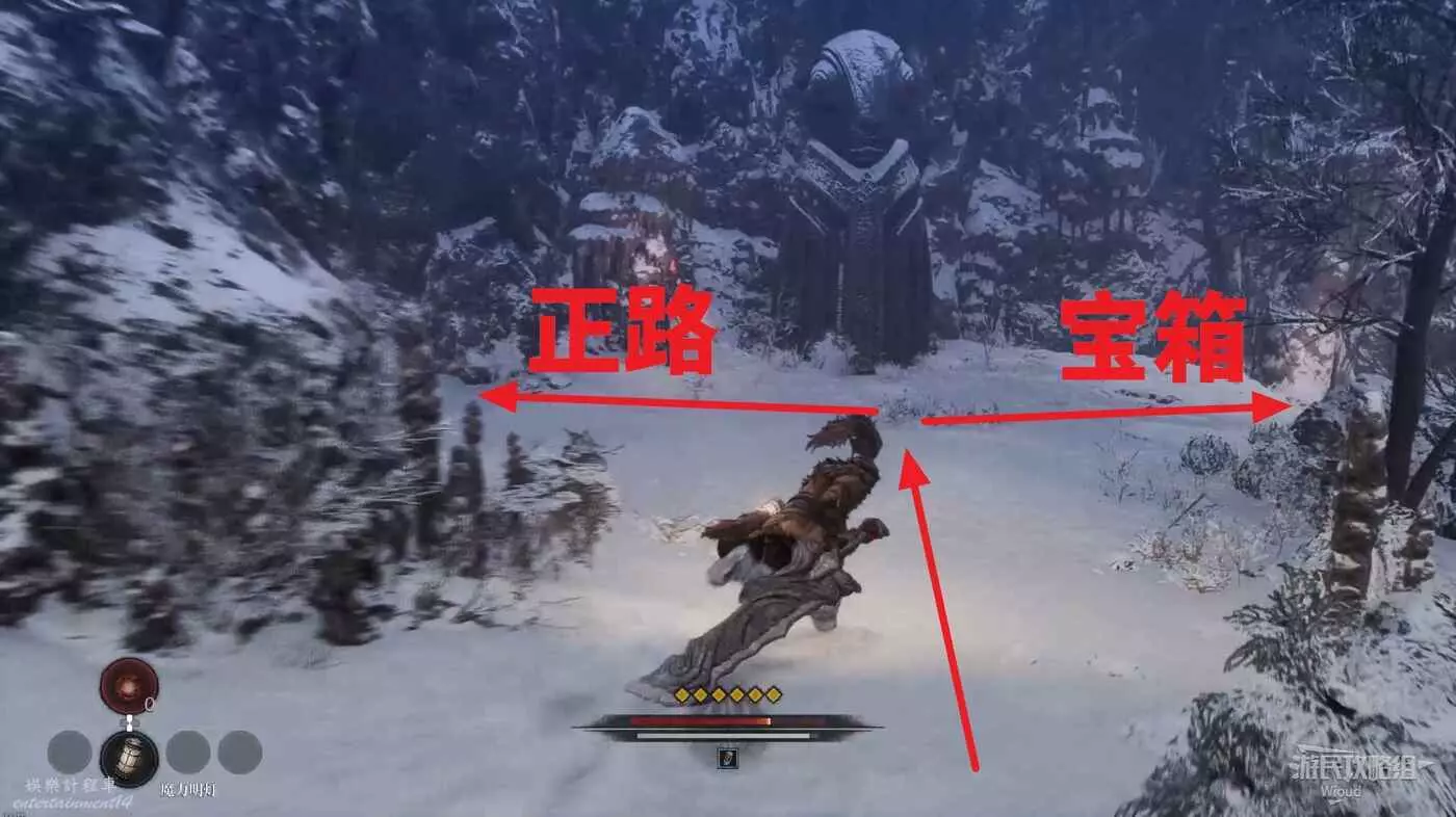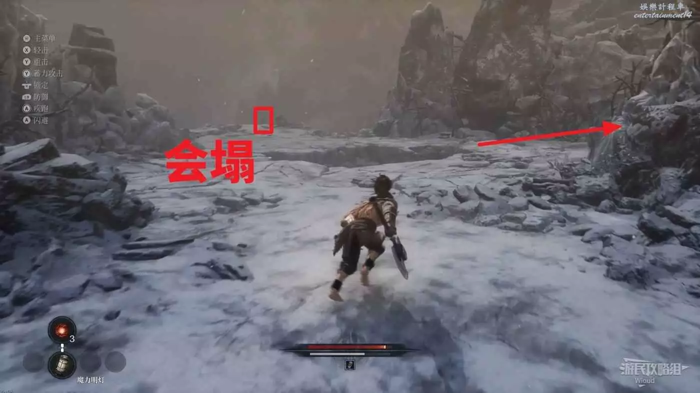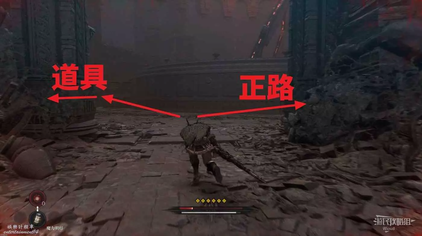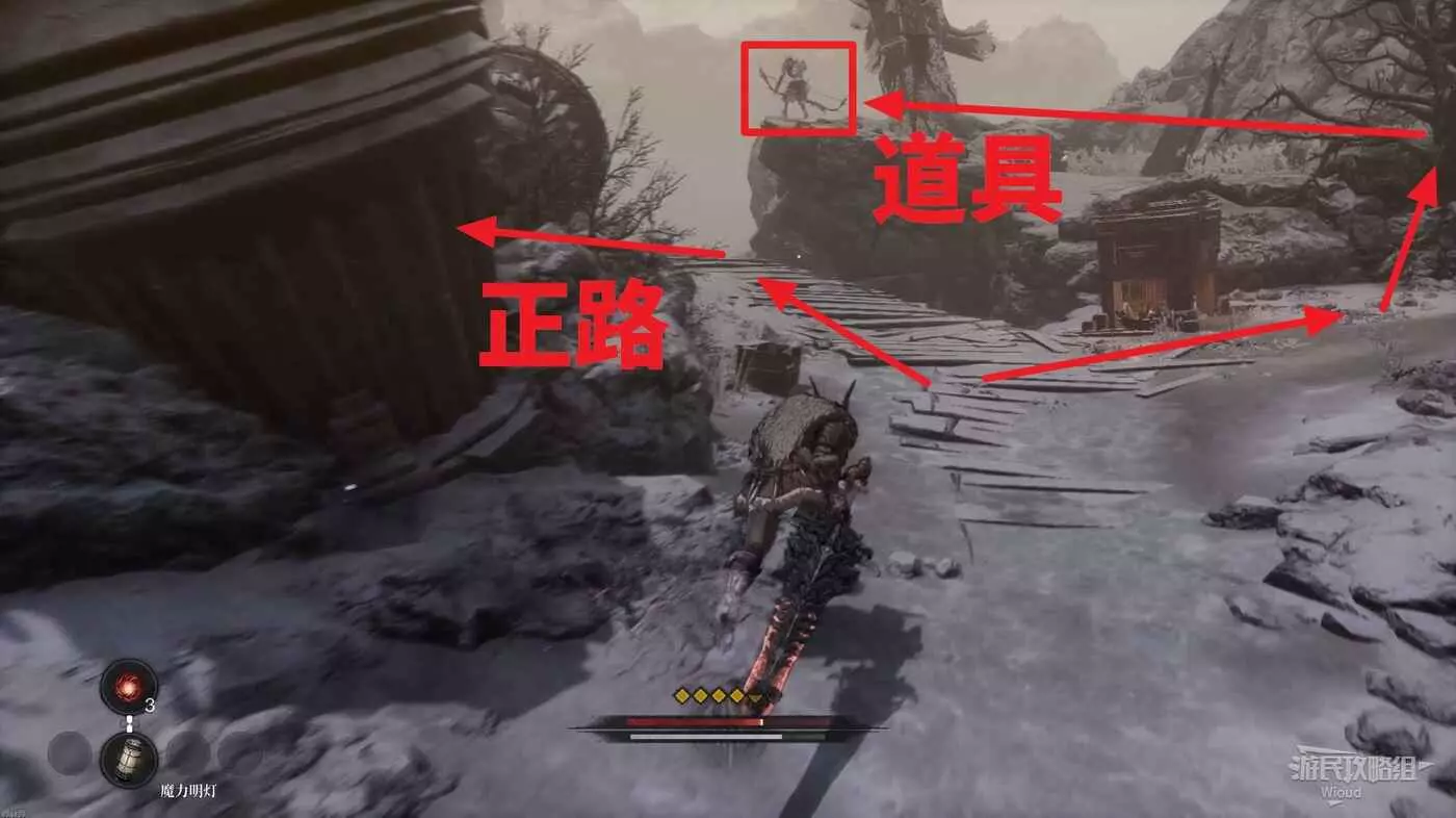 千萬不要走左邊文字標註的位置,當玩家走過去會直接塌下去死亡,從右邊繞,前往猴子怪物旁有一個道具,然後往右走。