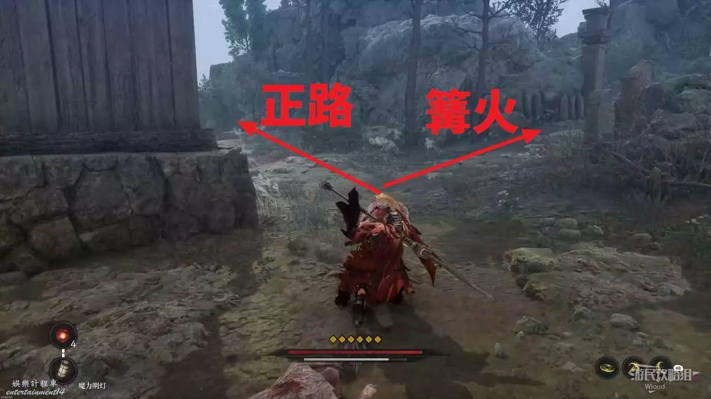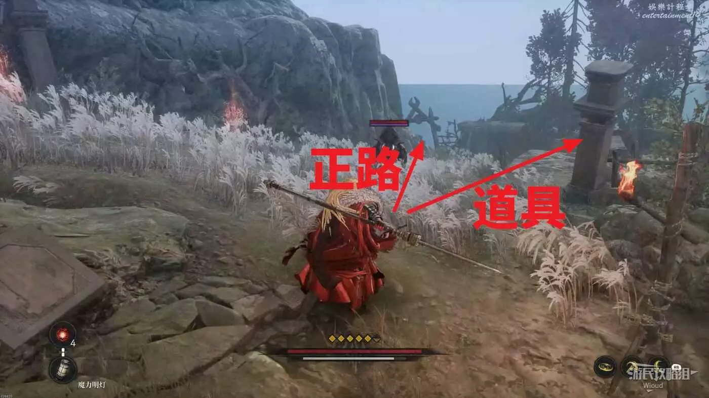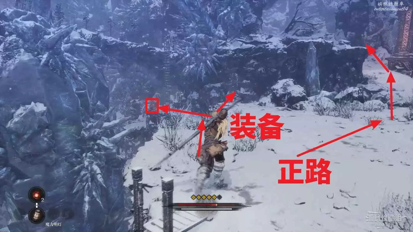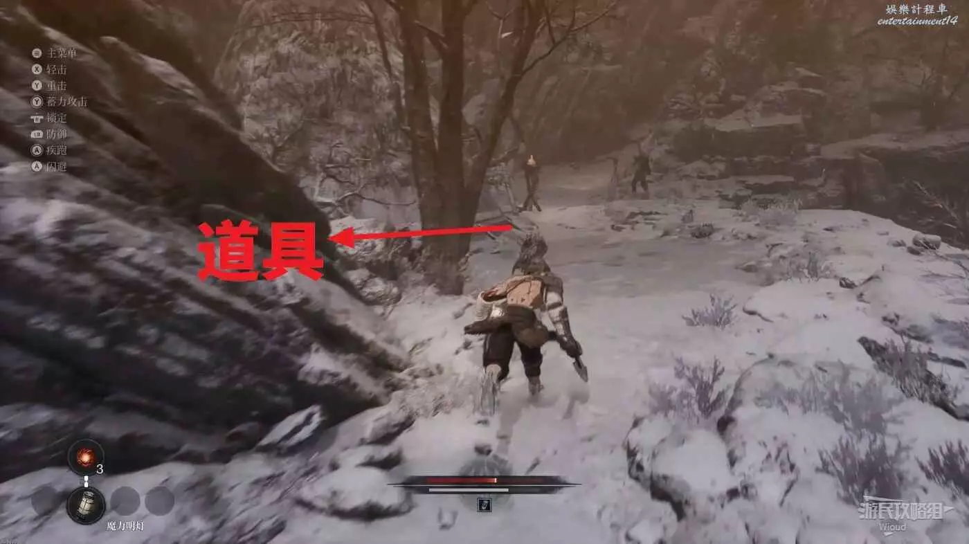 千萬不要走左邊文字標註的位置,當玩家走過去會直接塌下去死亡,從右邊繞,前往猴子怪物旁有一個道具,然後往右走。