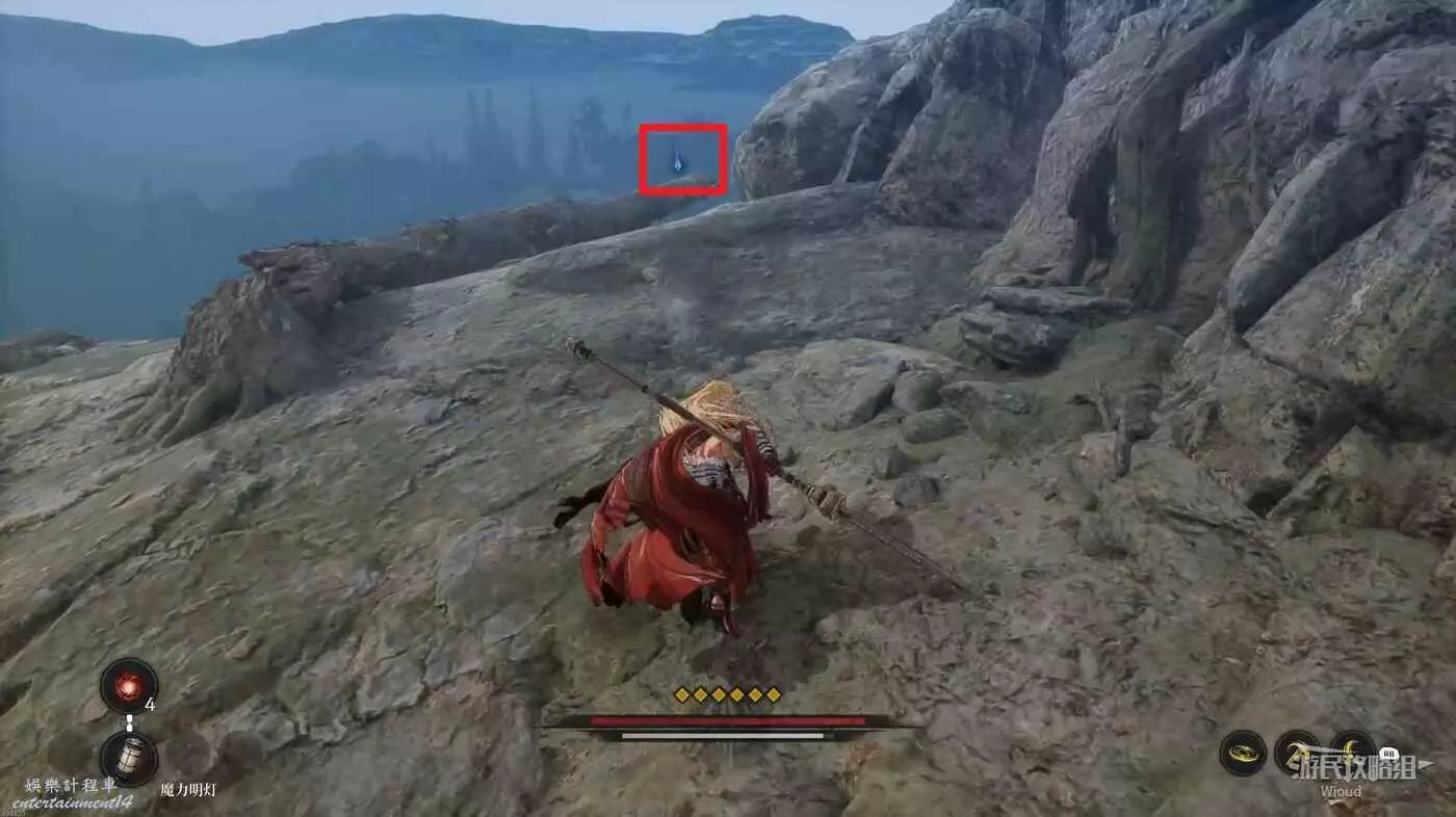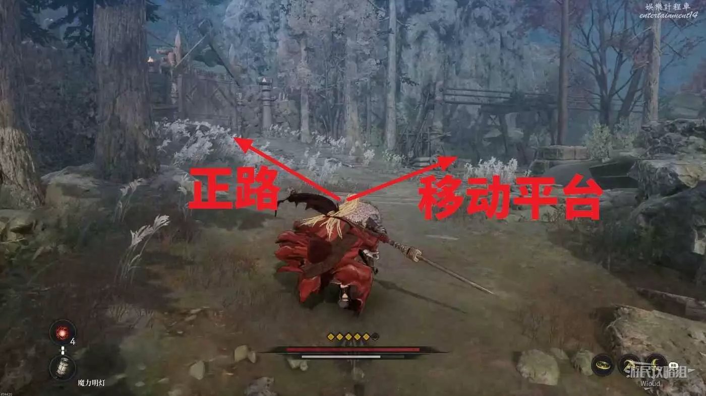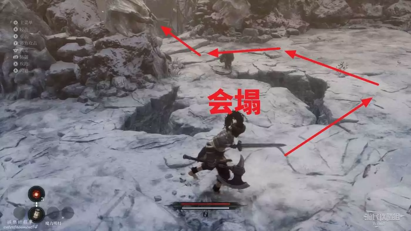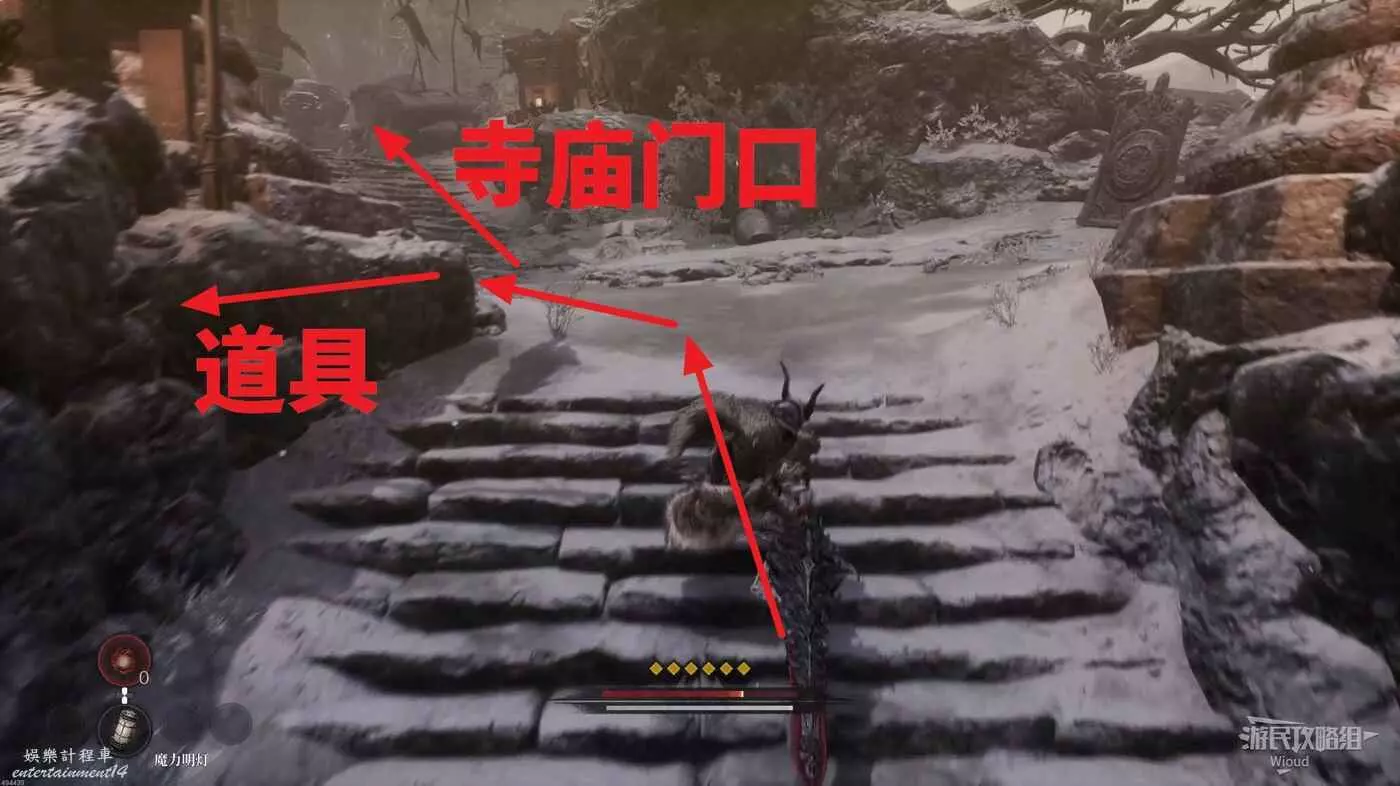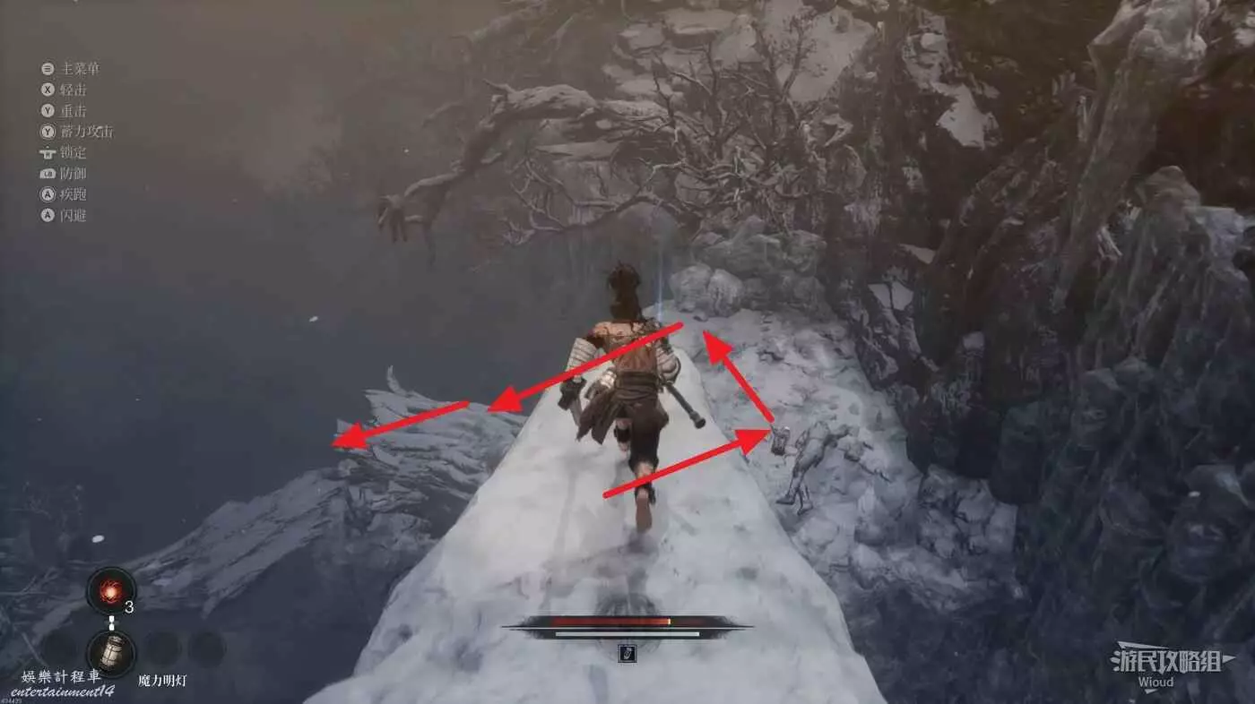 千萬不要走左邊文字標註的位置,當玩家走過去會直接塌下去死亡,從右邊繞,前往猴子怪物旁有一個道具,然後往右走。