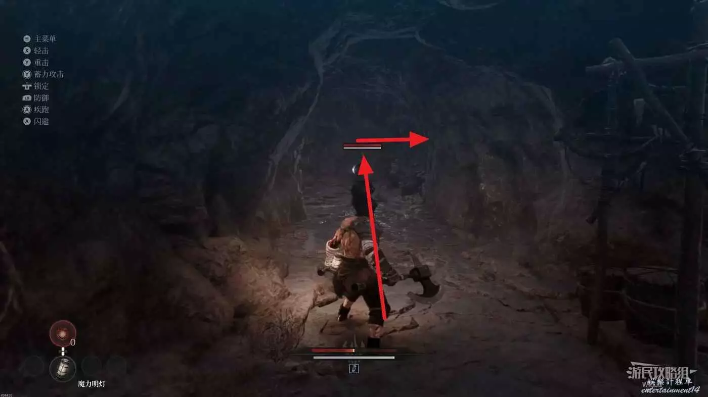 往洞穴裡走,注意右側有一個被拒馬擋住的入口,攻擊拒馬可以直接破壞往裡走。