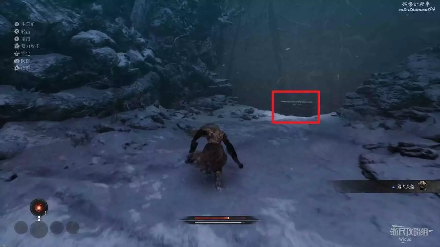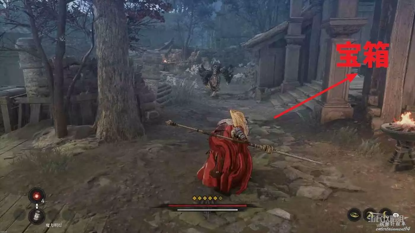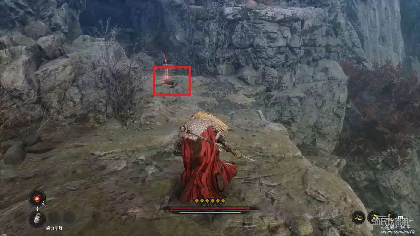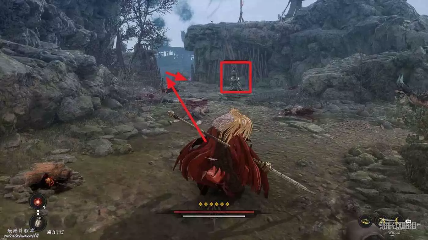 擊敗弓箭手走到盡頭可以看到一個紅色發光點,不要直接過去,右側有一個被石頭擋住的隱藏敵人,先將敵人探出來將其消滅掉過一個【獵犬護腿】。