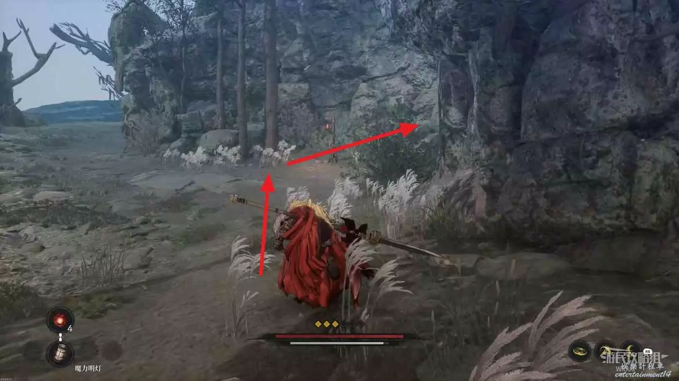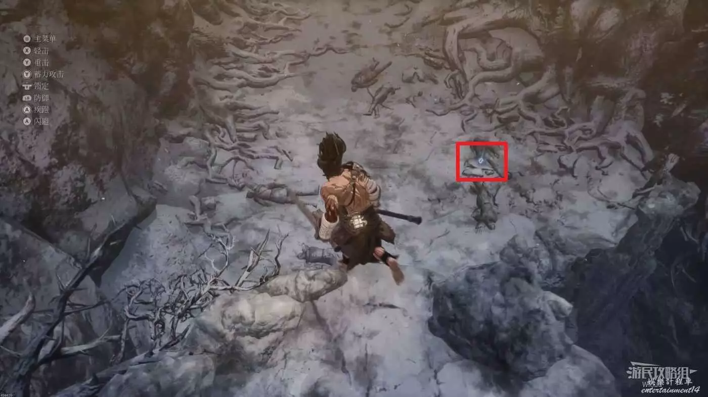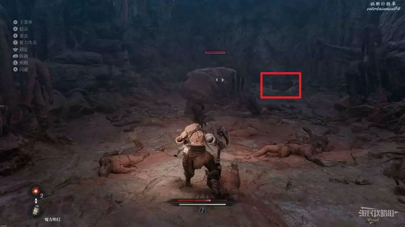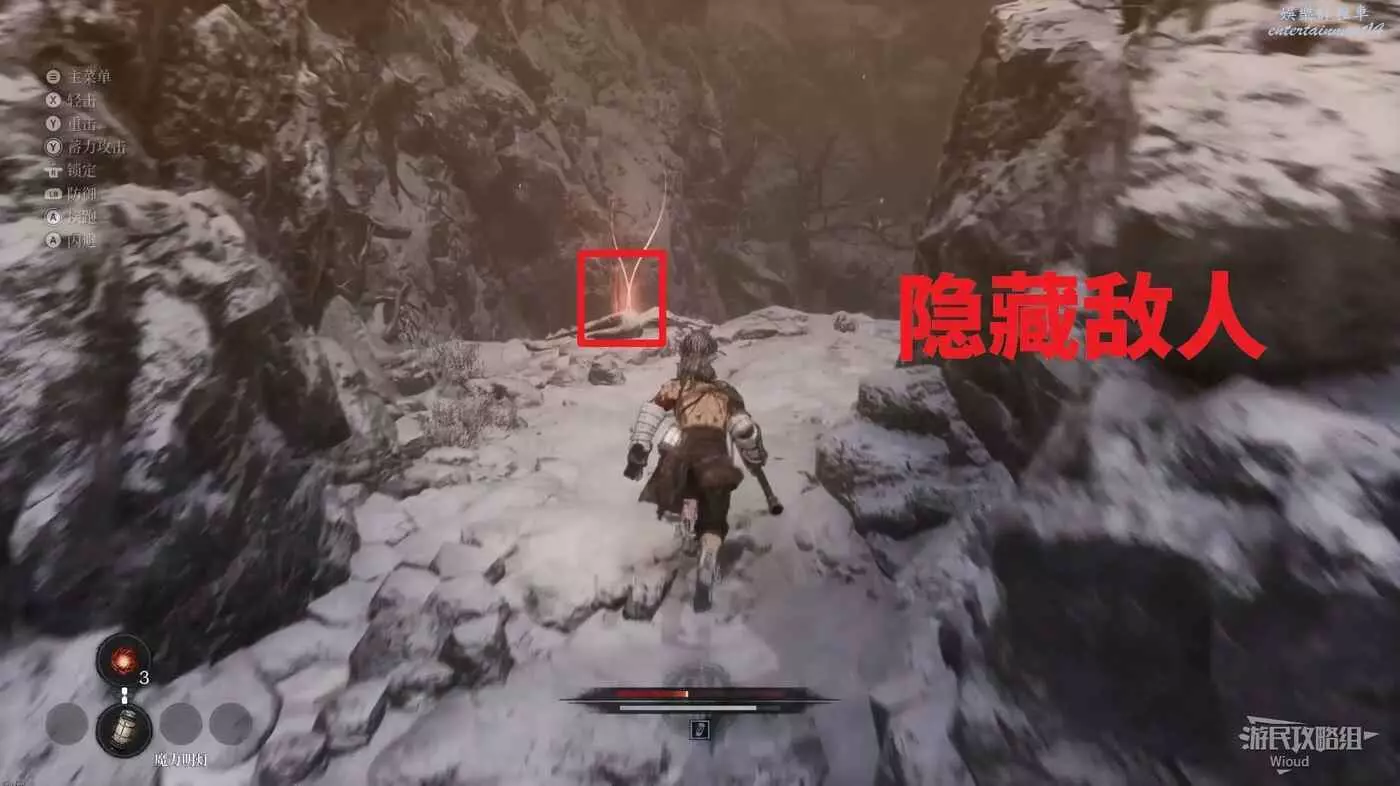 擊敗弓箭手走到盡頭可以看到一個紅色發光點,不要直接過去,右側有一個被石頭擋住的隱藏敵人,先將敵人探出來將其消滅掉過一個【獵犬護腿】。
