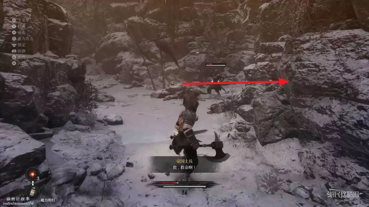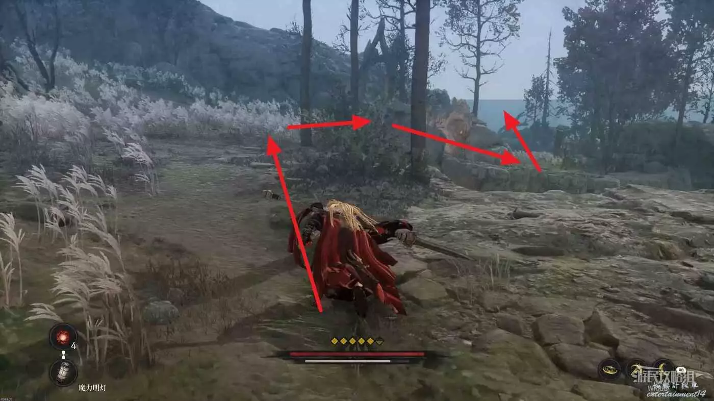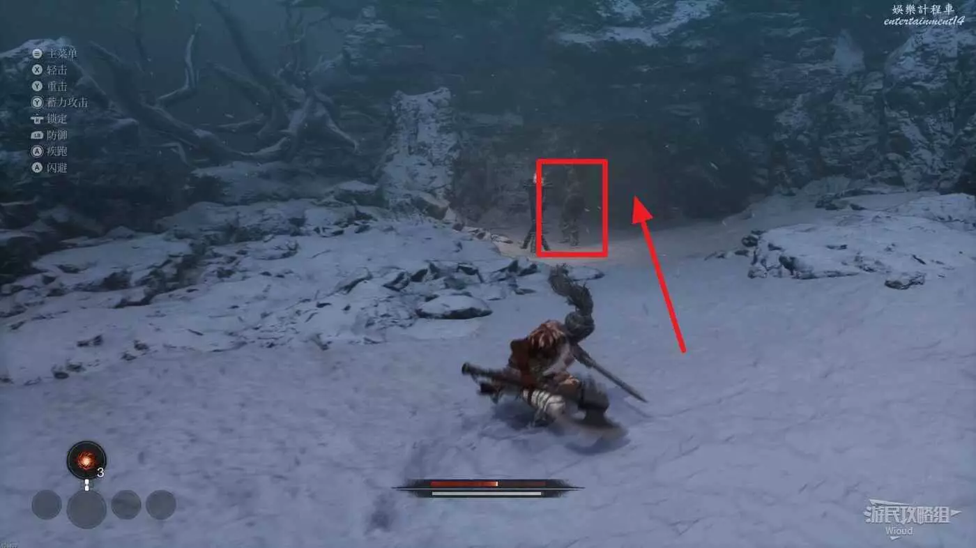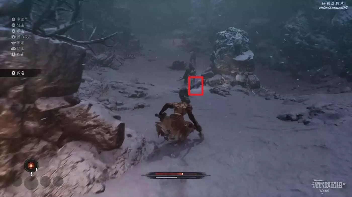 擊敗弓箭手走到盡頭可以看到一個紅色發光點,不要直接過去,右側有一個被石頭擋住的隱藏敵人,先將敵人探出來將其消滅掉過一個【獵犬護腿】。