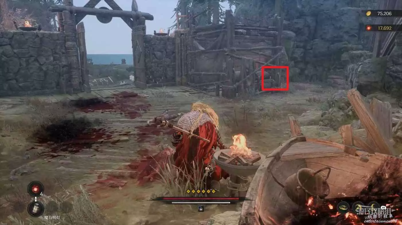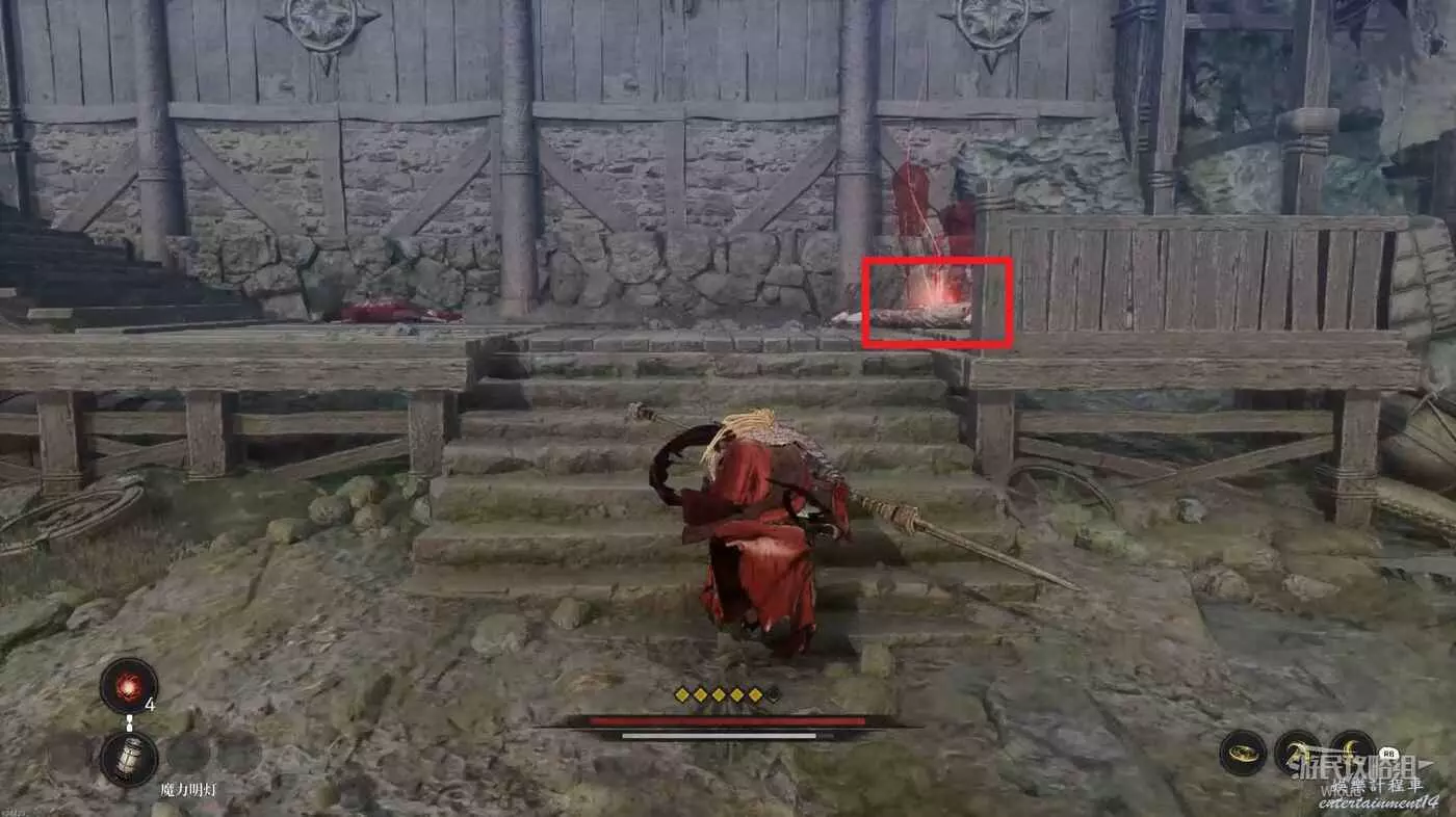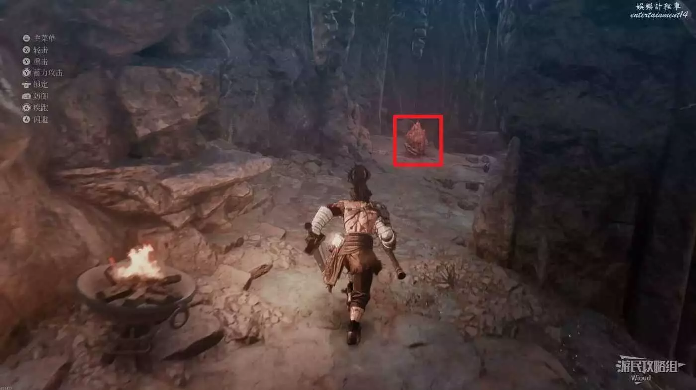 前方是一個開闊區域,往前少走一段距離左側有一個凹口可以拿道具,前方紅框所示位置可以啟動第二個篝火點。