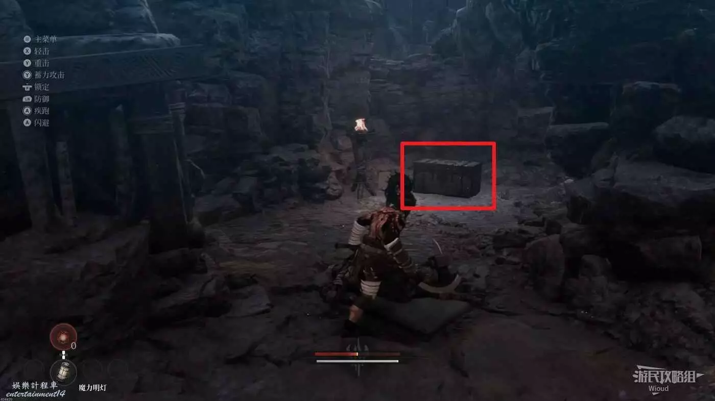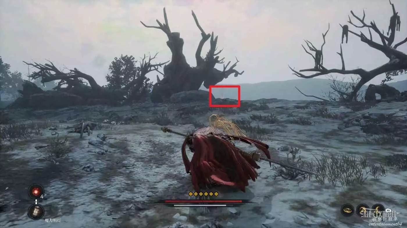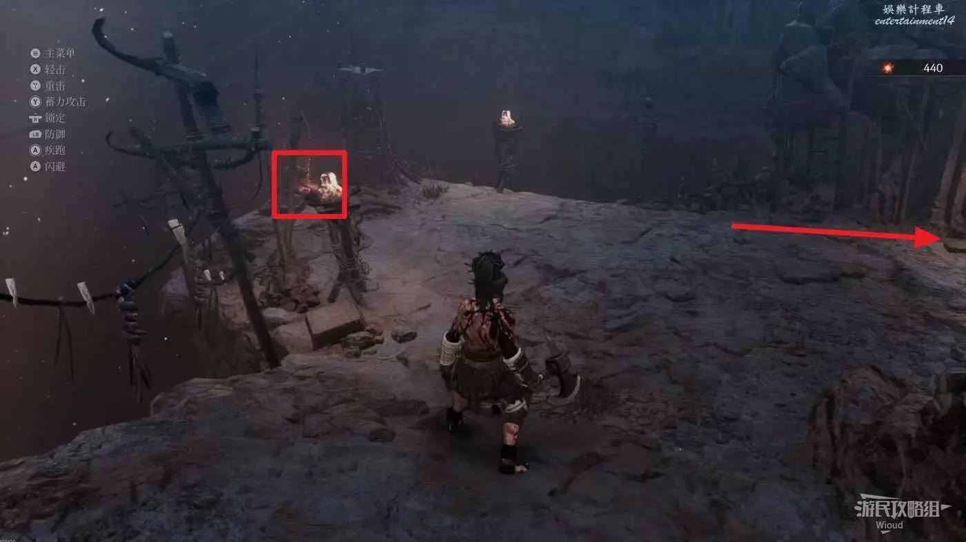 前方是一個開闊區域,往前少走一段距離左側有一個凹口可以拿道具,前方紅框所示位置可以啟動第二個篝火點。