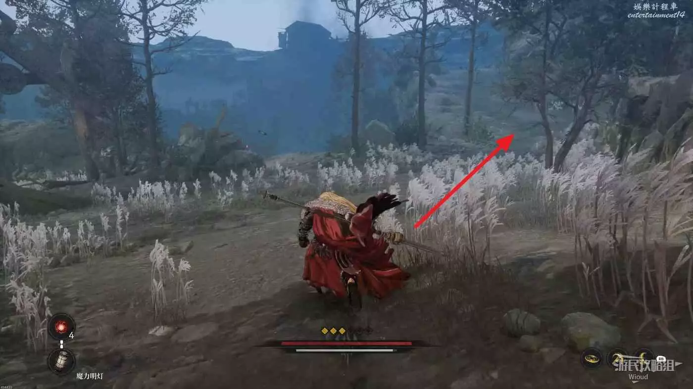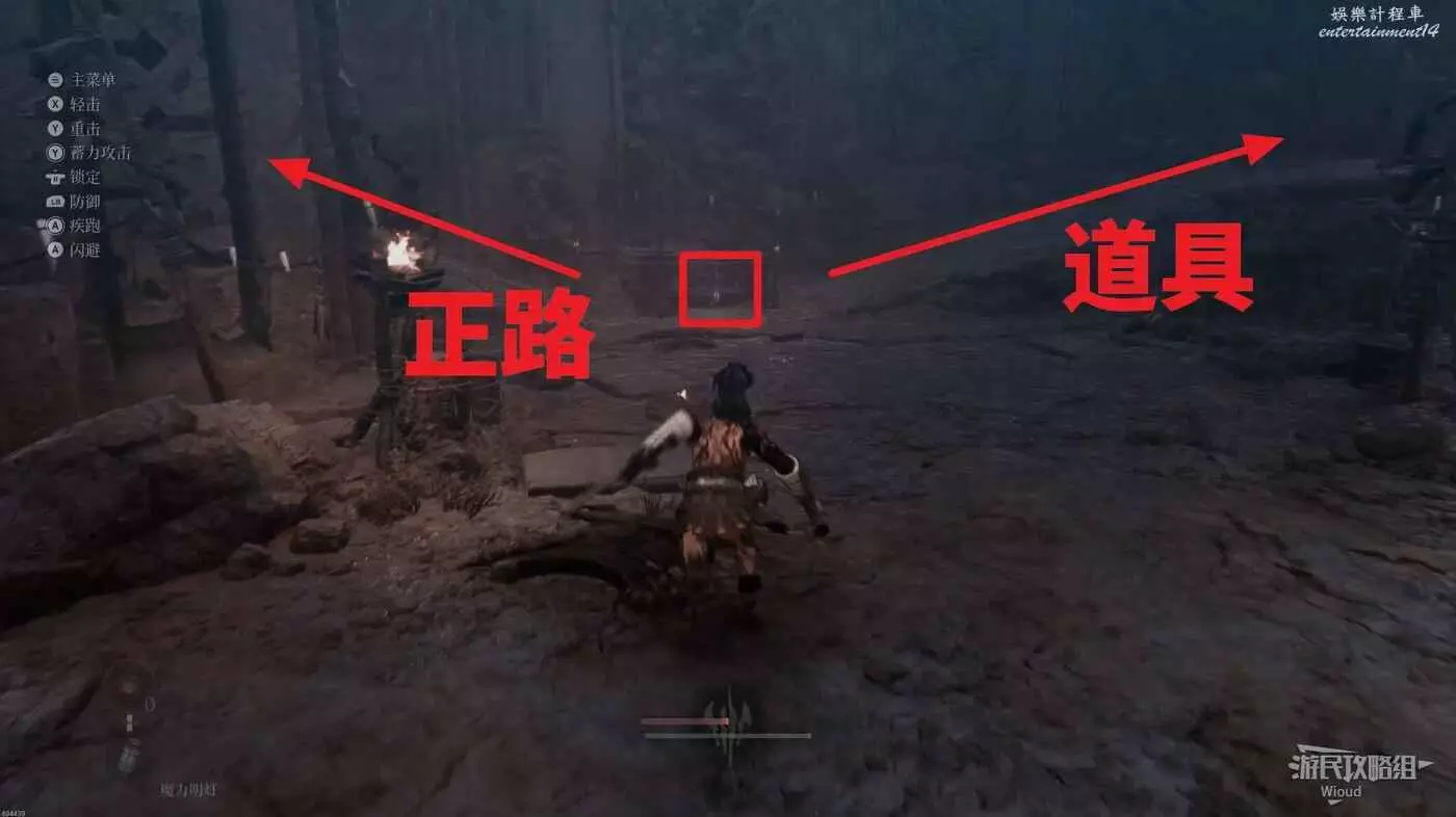 沿路往前走到一個T字路口,先往左走擊敗幾個狼怪,路上有一個道具可拿,盡頭處推到樹木可以創造一個快速走到第一個篝火點的近路,接著回到T字路口往右走。