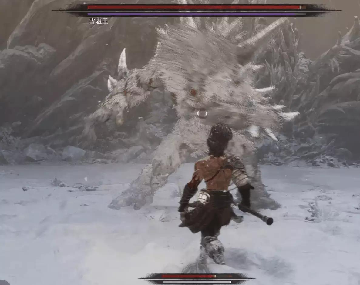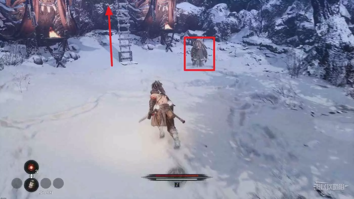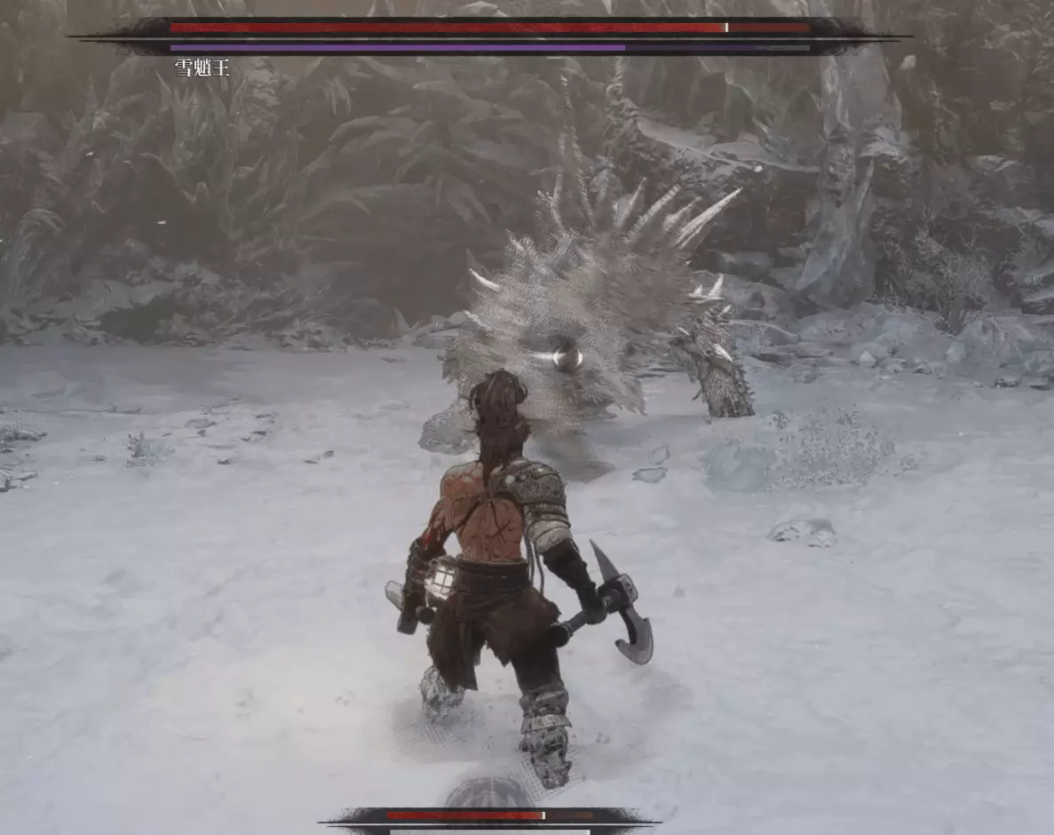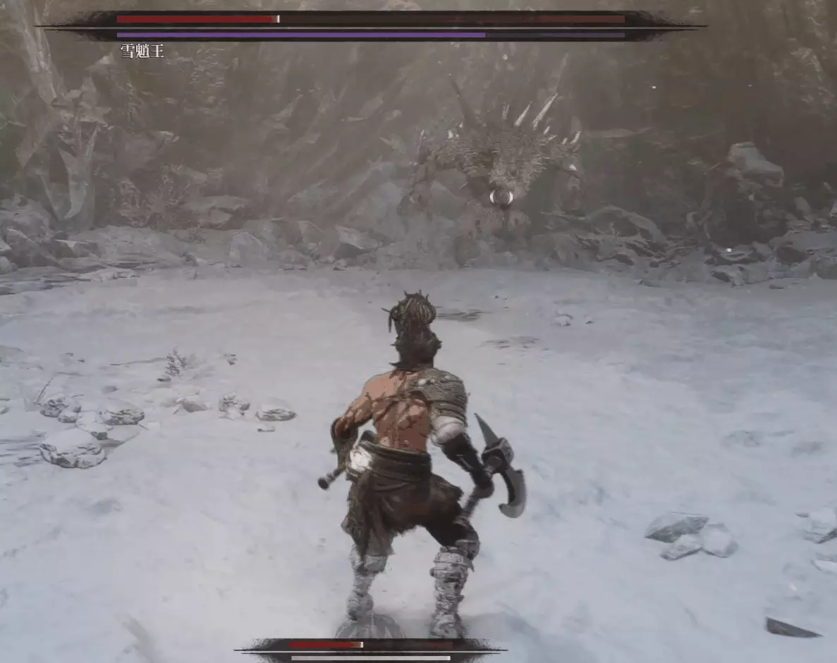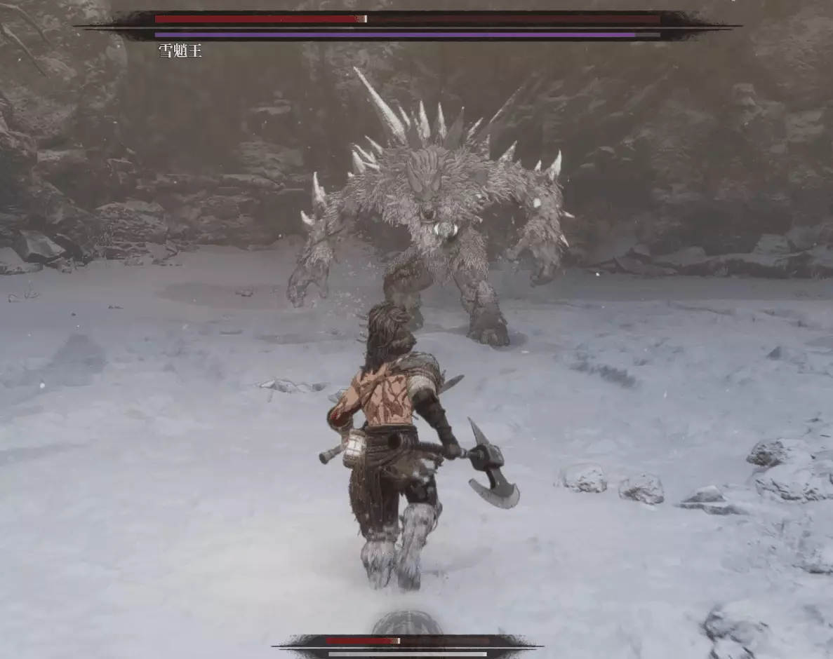 與篝火互動恢復狀態,從近路旁全是屍體的小路走到頭開啟關底BOSS雪魈王的戰鬥。