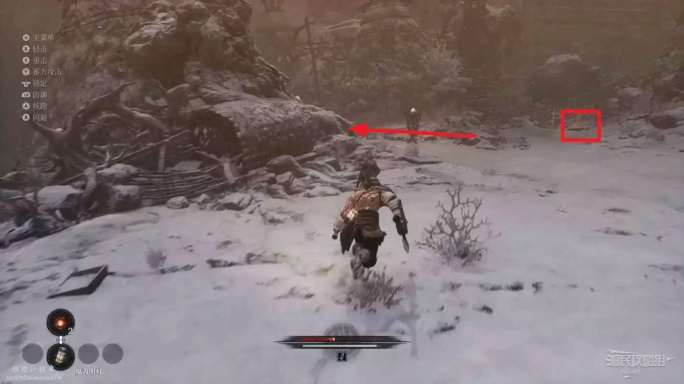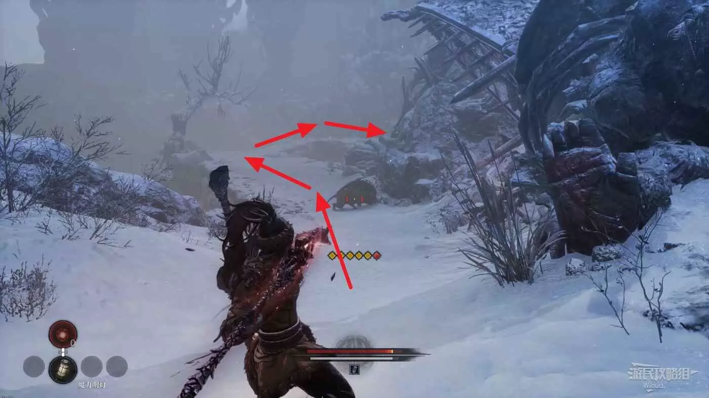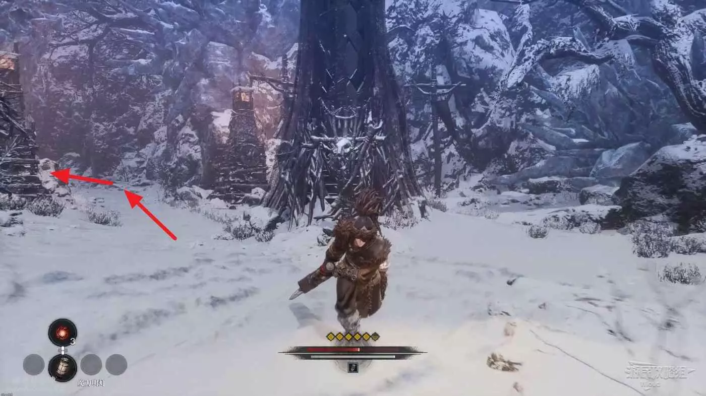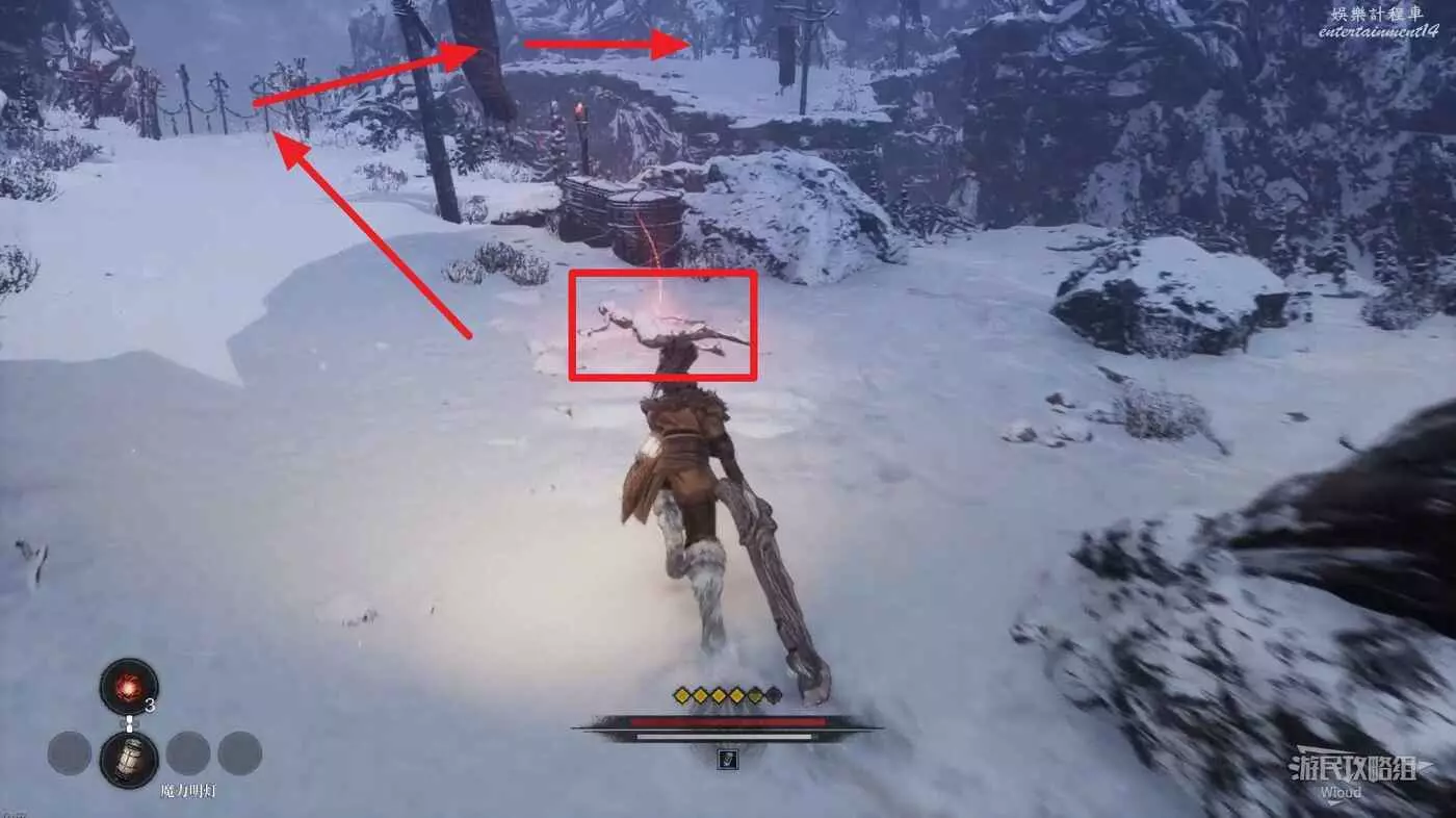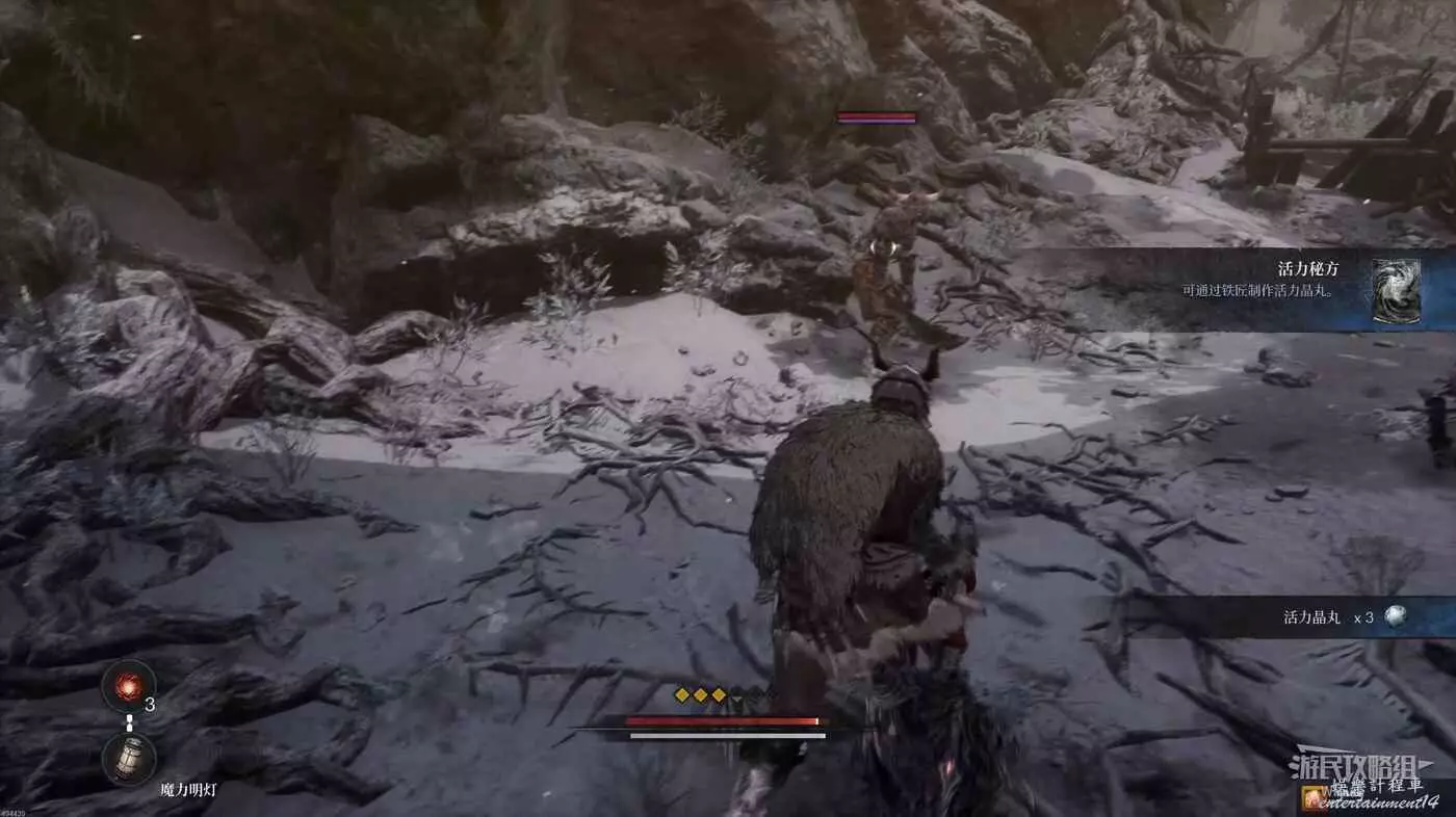 與篝火互動恢復狀態,從近路旁全是屍體的小路走到頭開啟關底BOSS雪魈王的戰鬥。