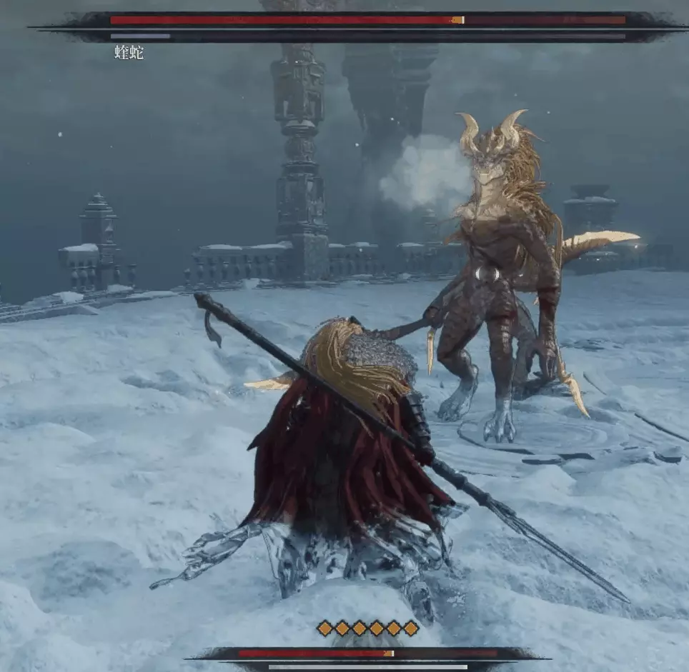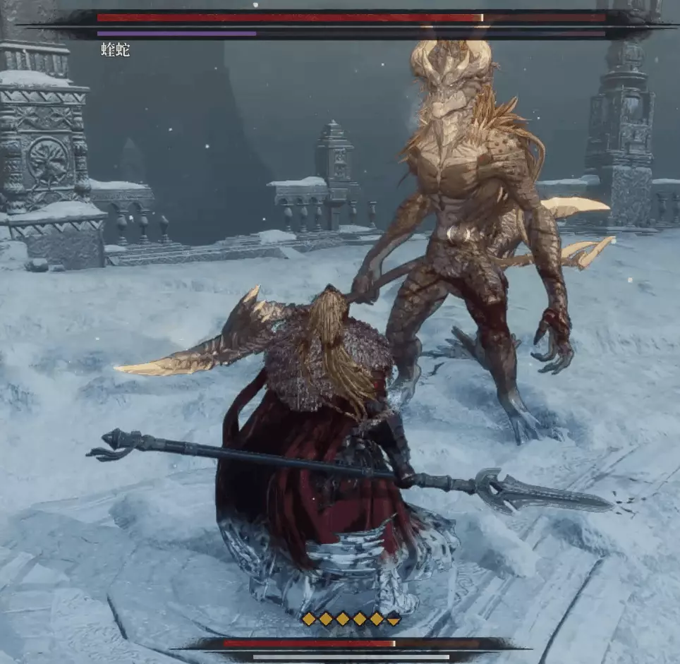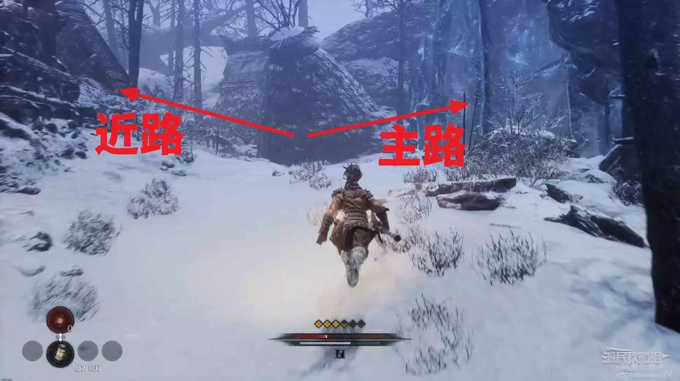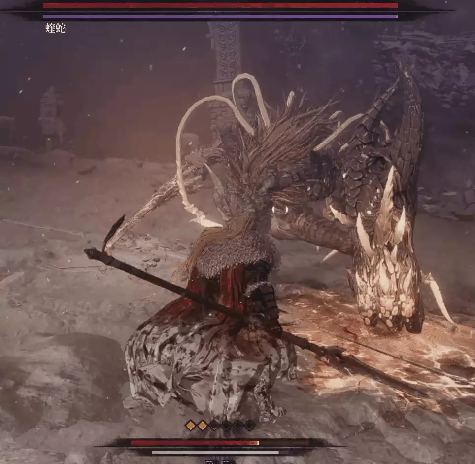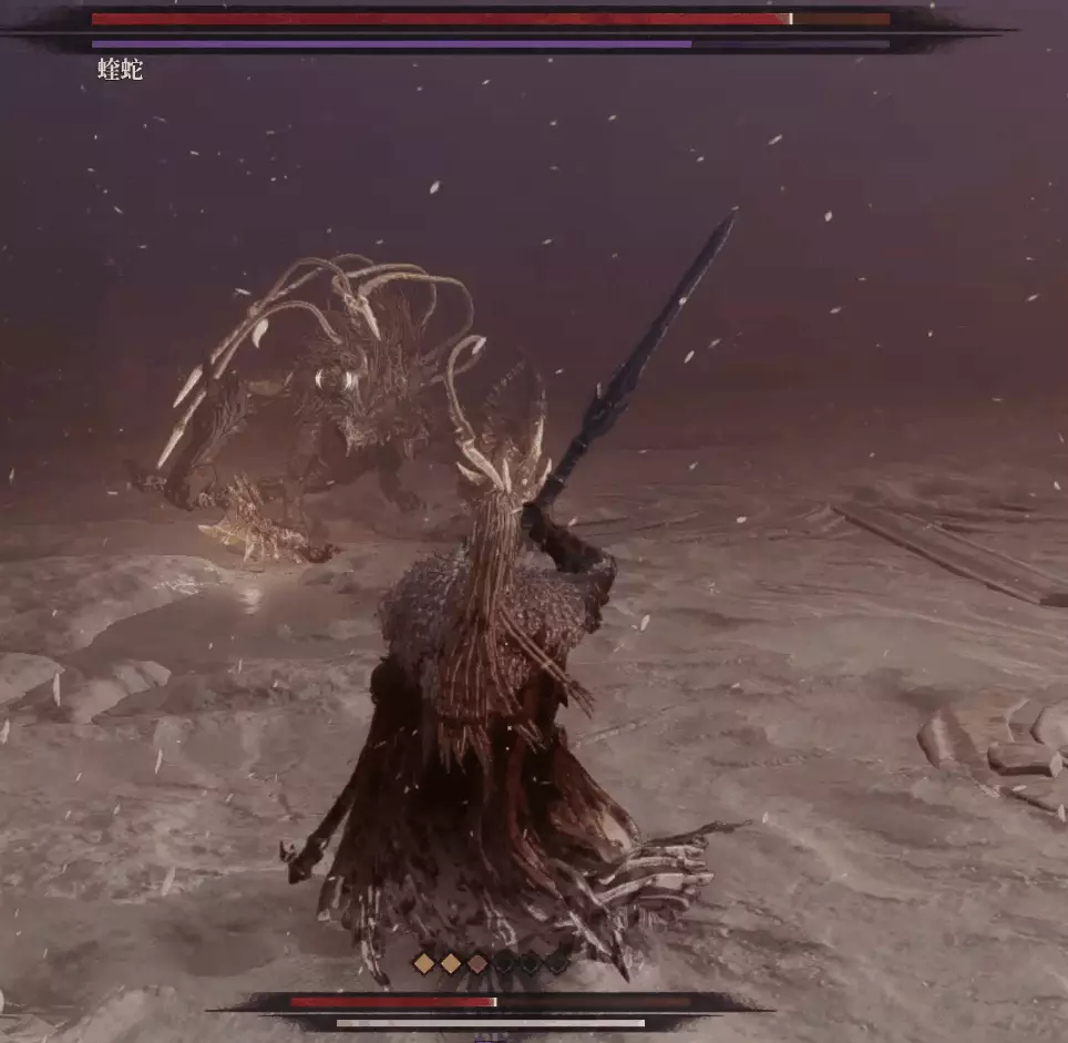 與篝火互動恢復狀態,從近路旁全是屍體的小路走到頭開啟關底BOSS雪魈王的戰鬥。