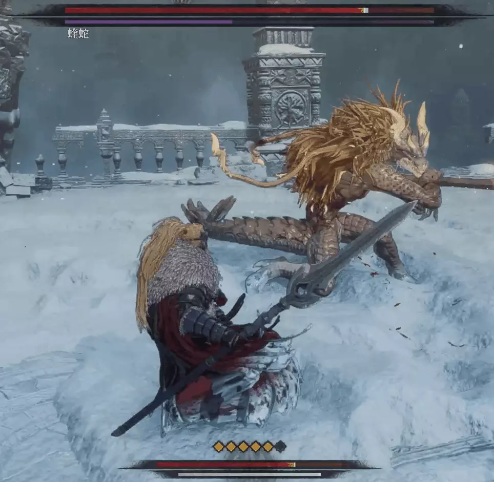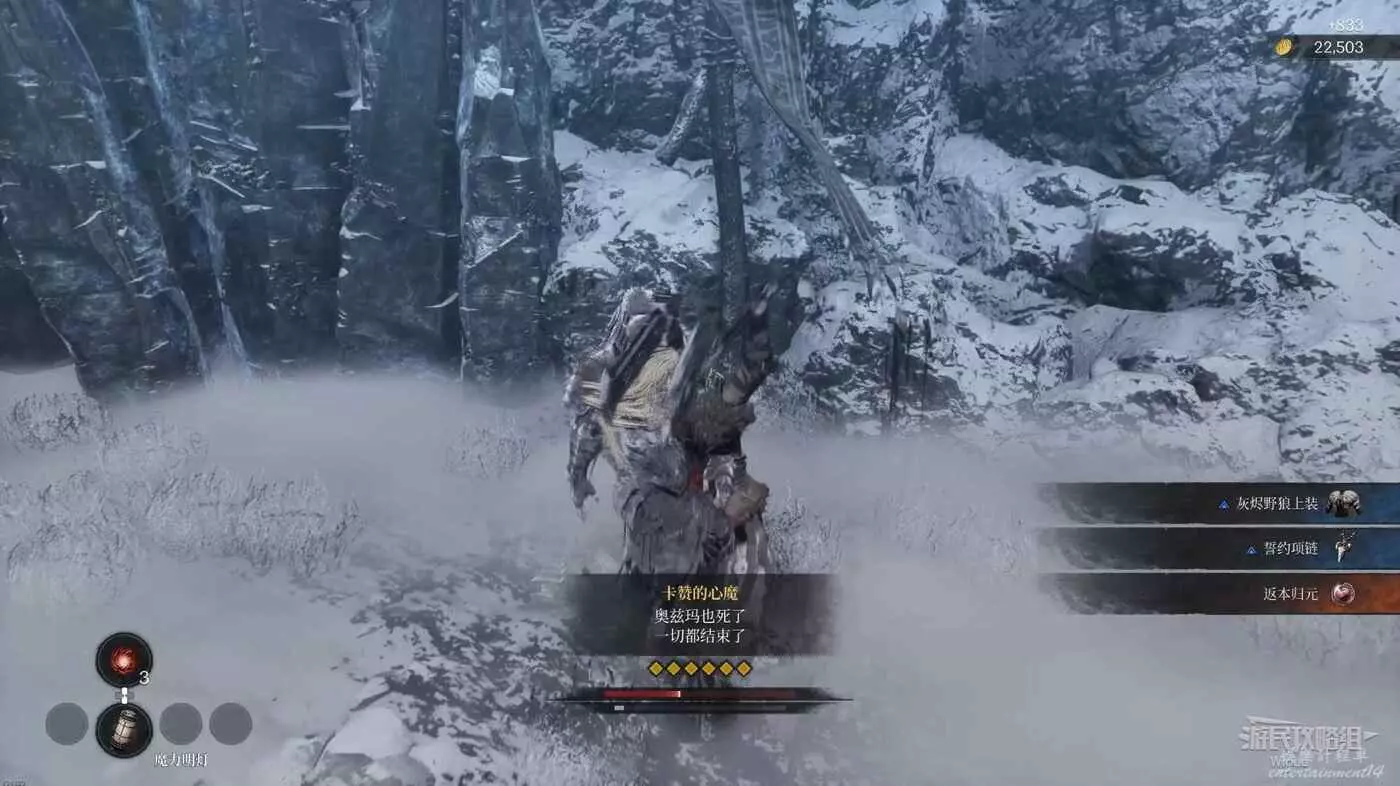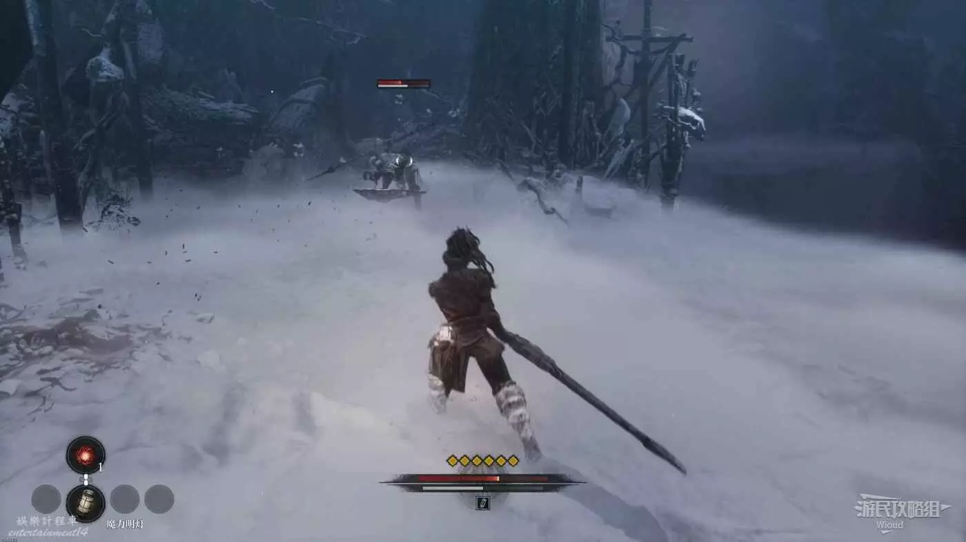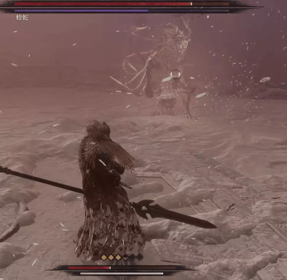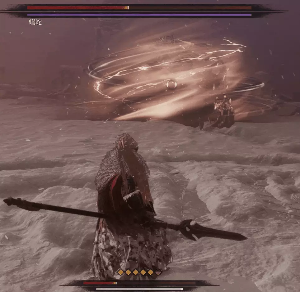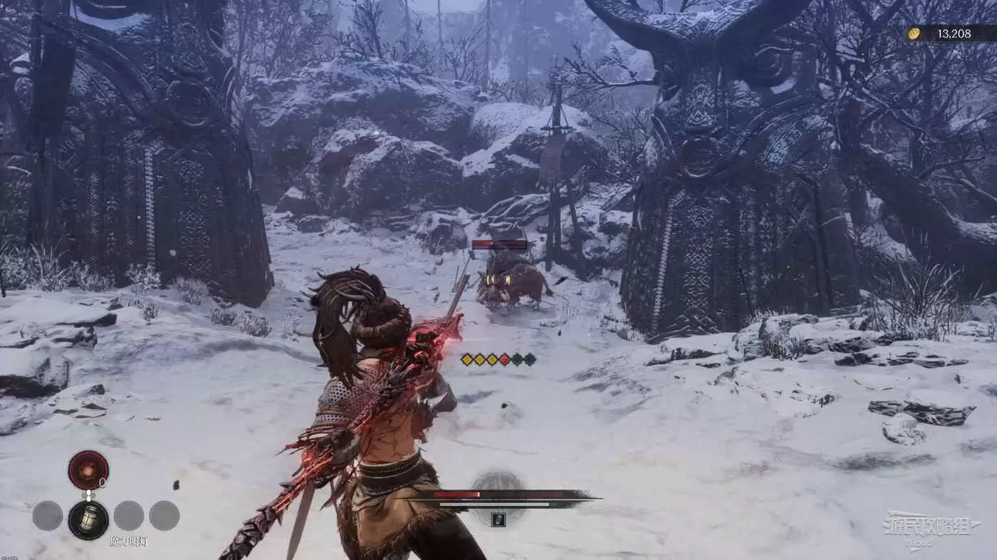 與篝火互動恢復狀態,從近路旁全是屍體的小路走到頭開啟關底BOSS雪魈王的戰鬥。
