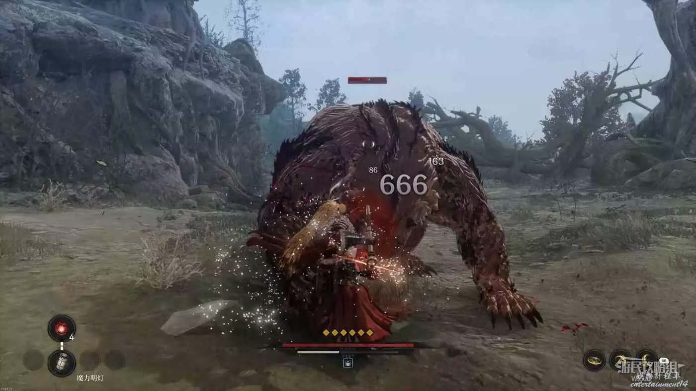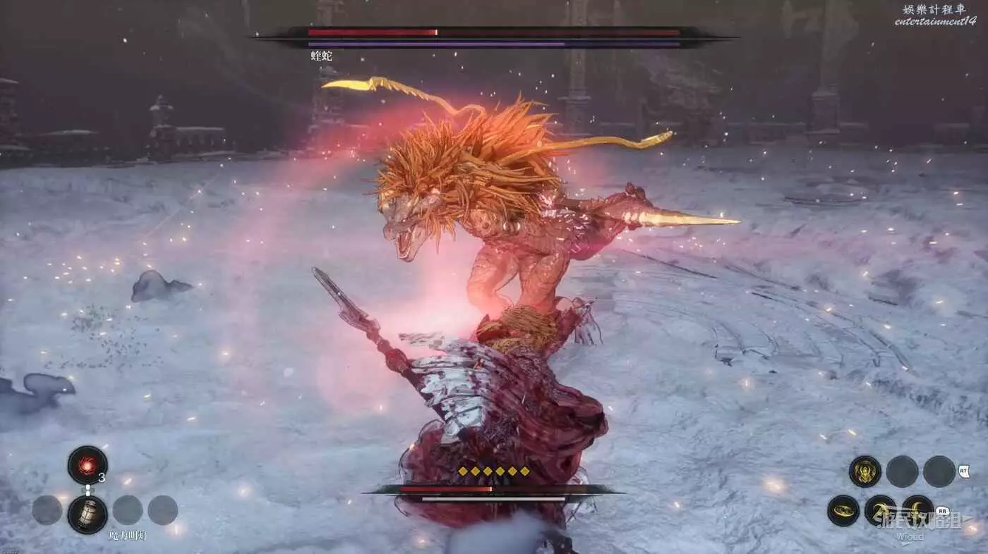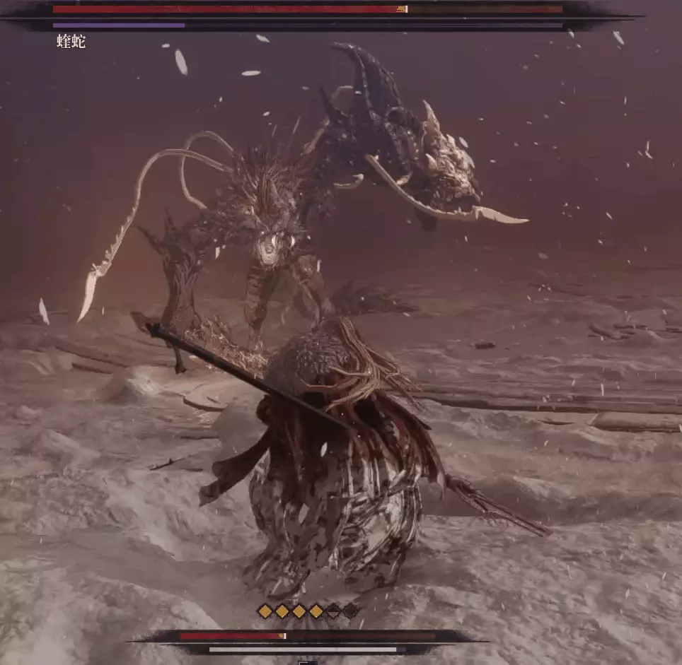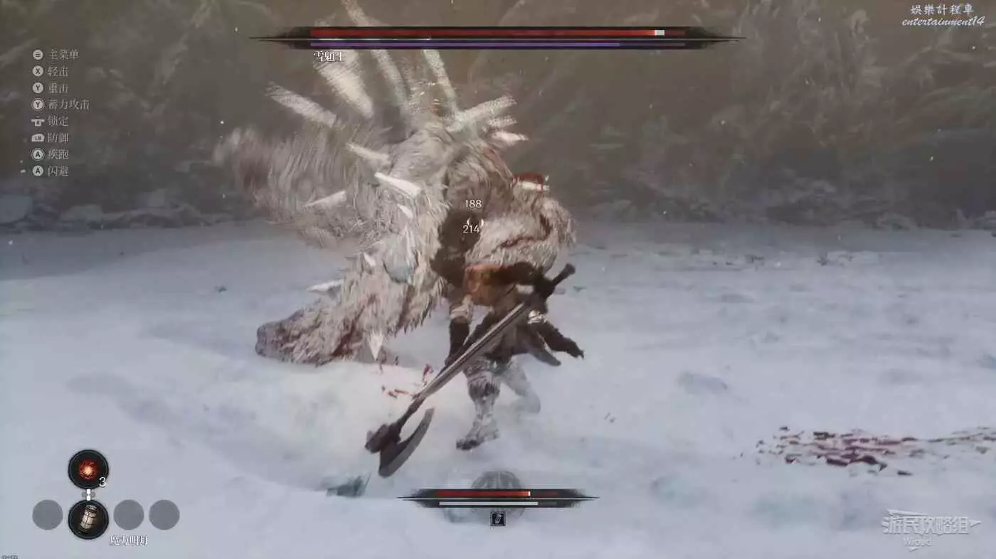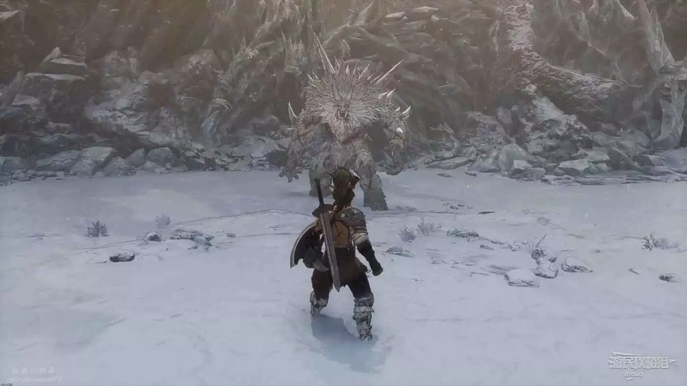 與篝火互動恢復狀態,從近路旁全是屍體的小路走到頭開啟關底BOSS雪魈王的戰鬥。
