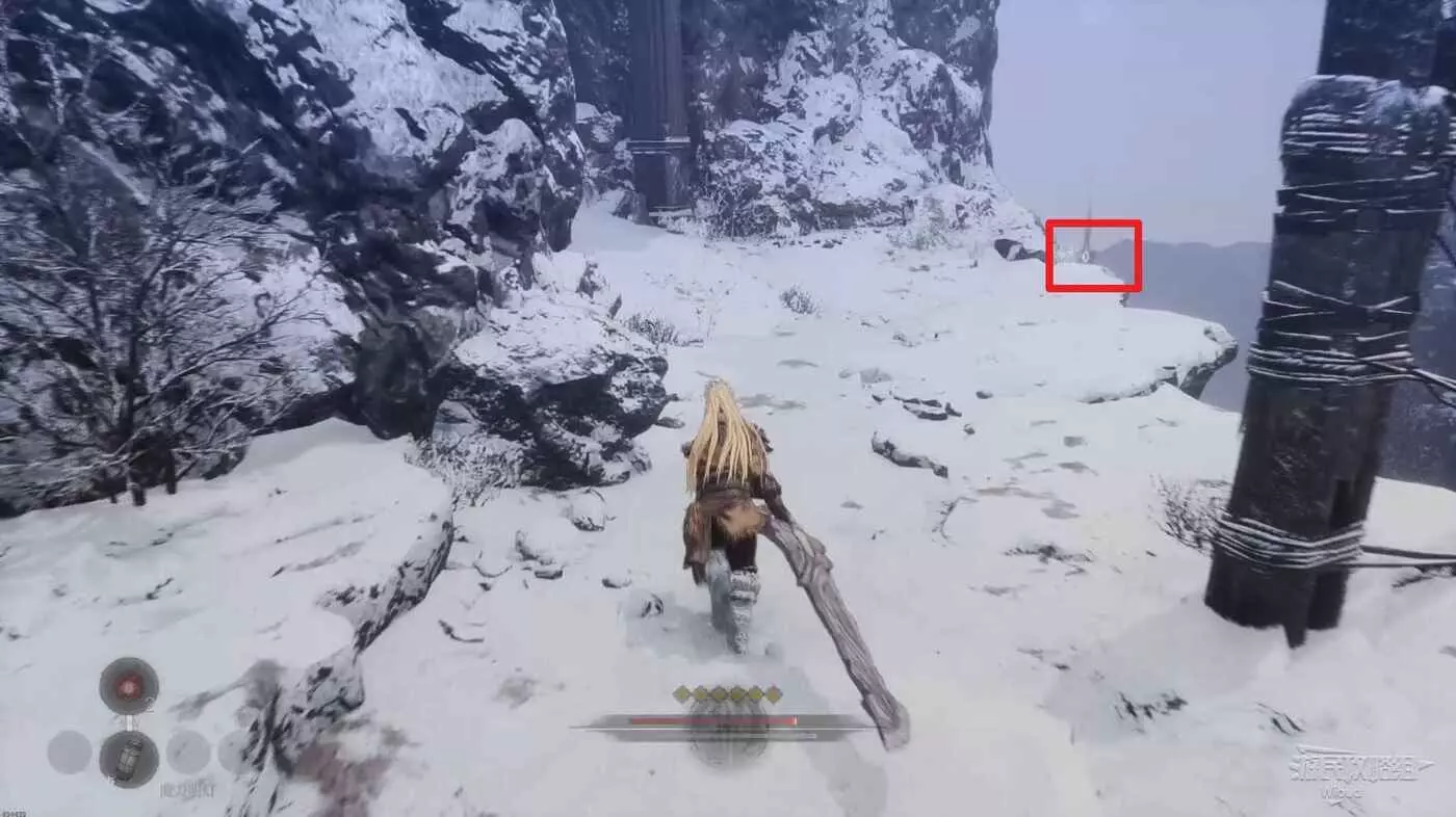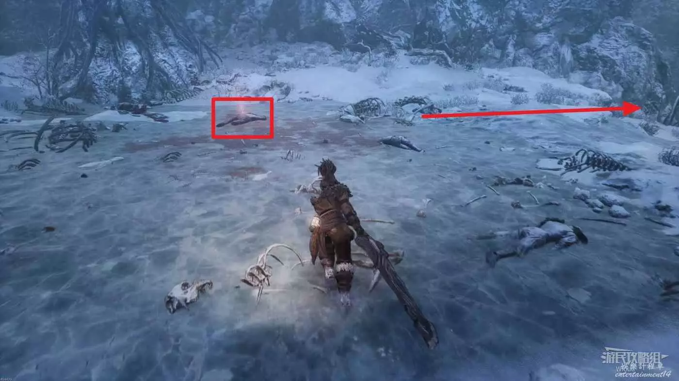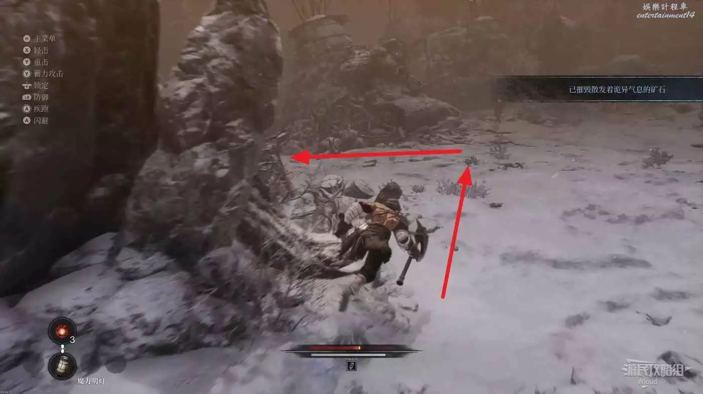 沿路走到開闊場景,擊敗中間的雪怪,往自己來時的方向看,右側上坡藏著一個詭異礦石直接走上去將其破壞掉。